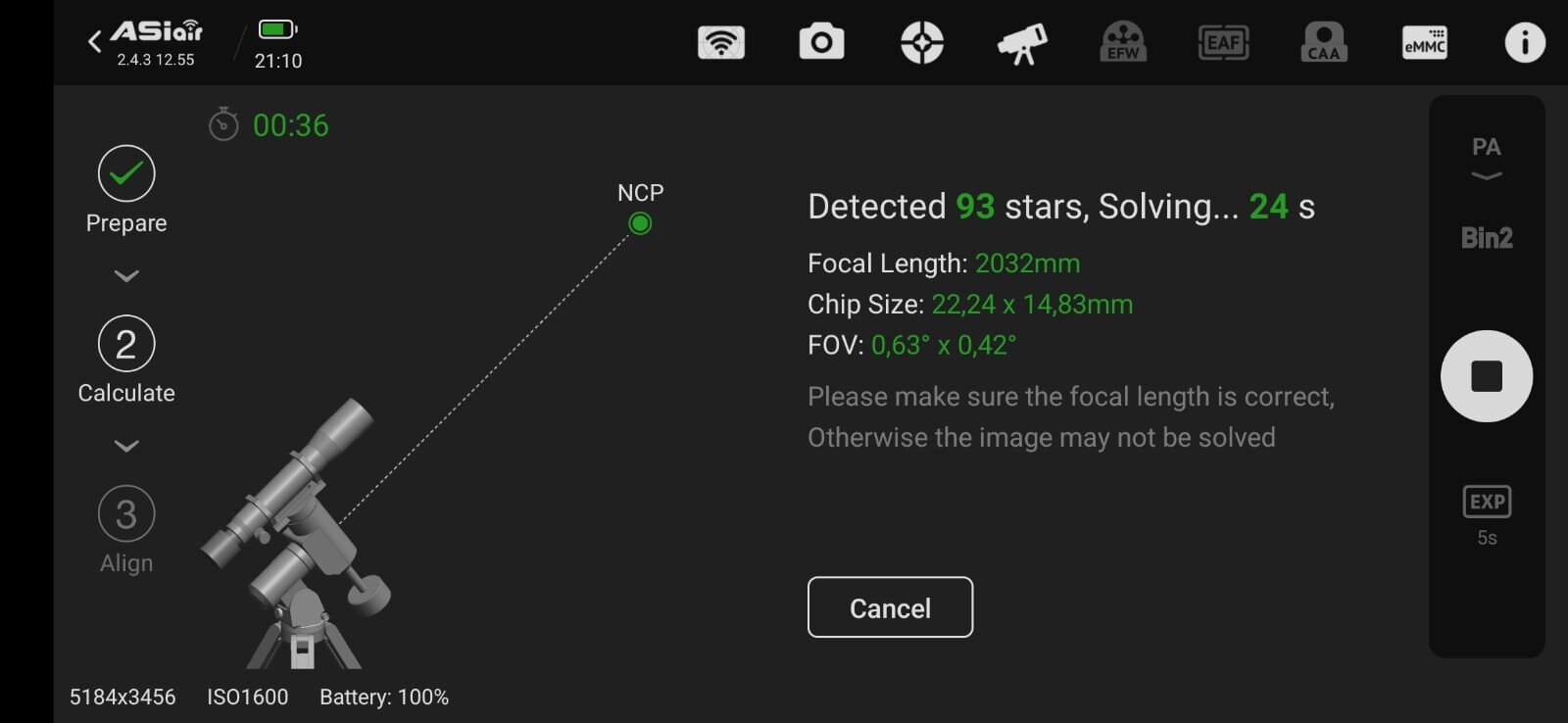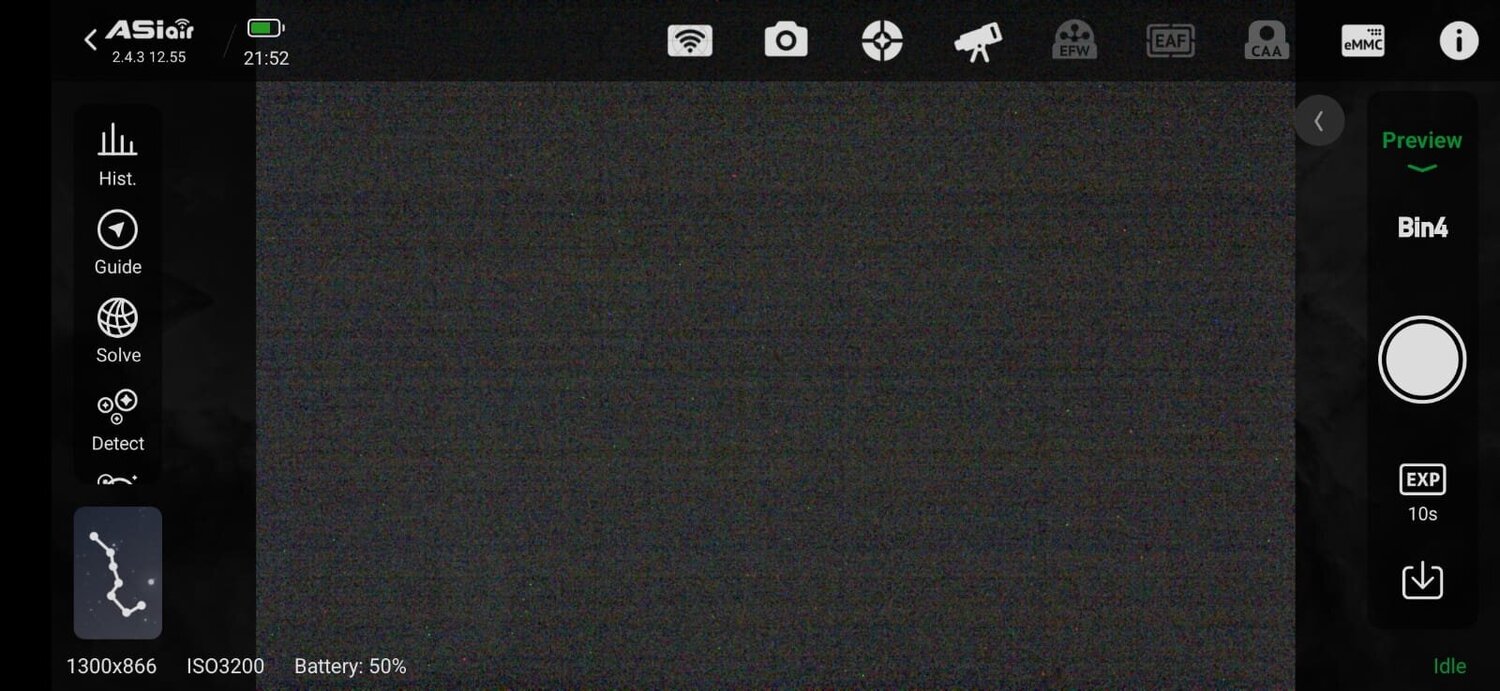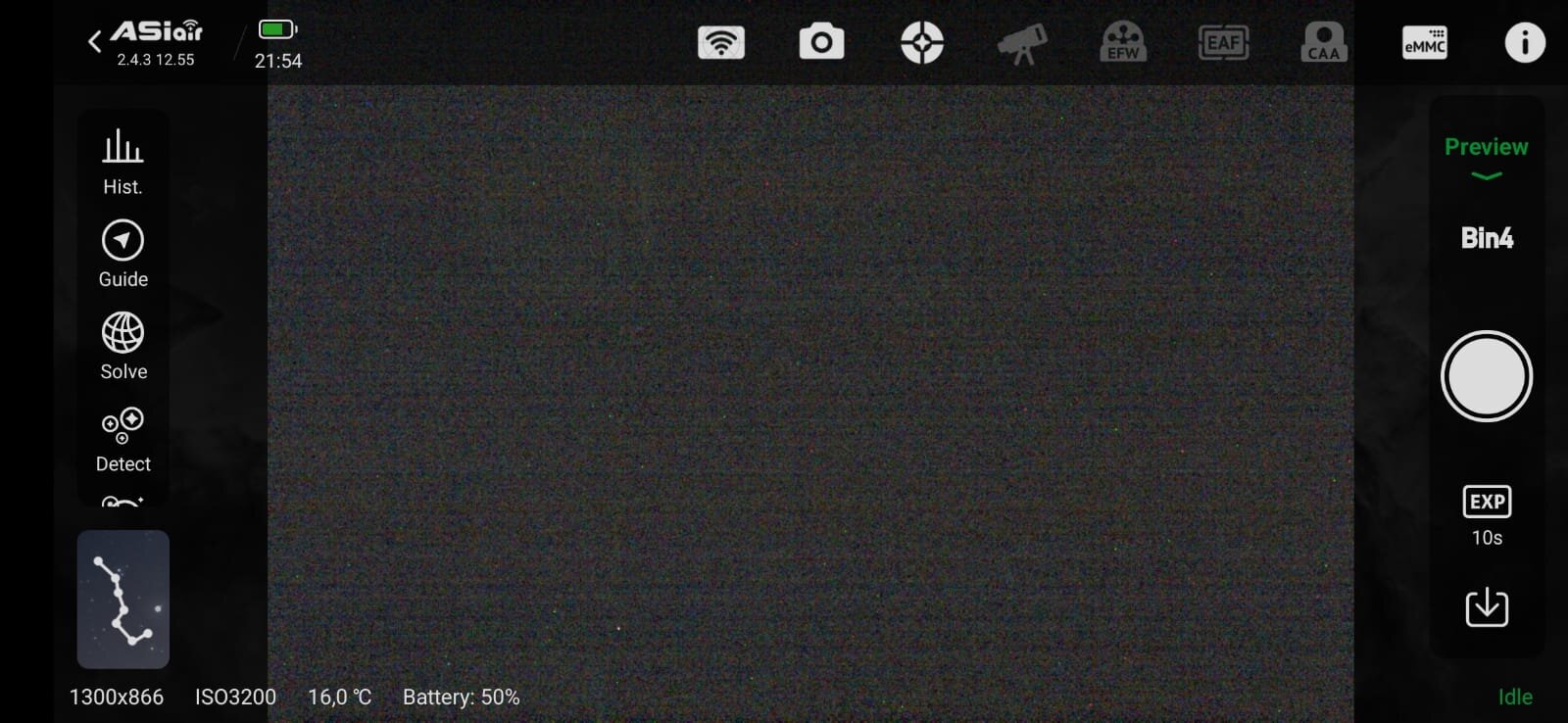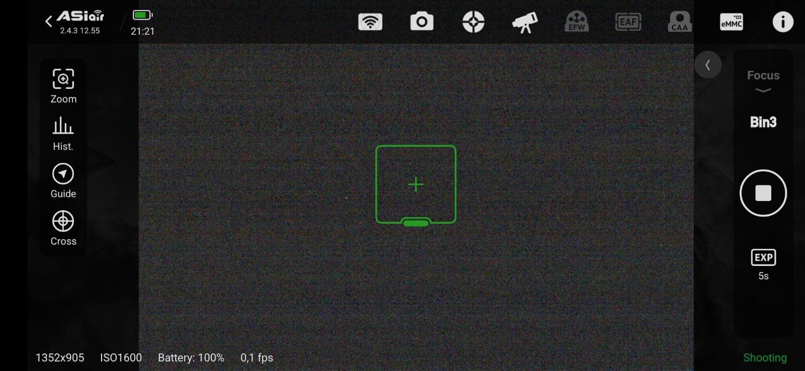 J’ai d'abord réalisé une mise au point de jour avec un oculaire, sur une cheminée lointaine, puis j’ai remplacé l’oculaire par le Canon. J’ai ensuite tenté de prendre des photos via l’ASIAIR, mais aucune étoile n’apparaît sur mes photos (ou alors oui mais on dirait du grain), même avec ISO 1600 ou 3200 et des poses de 5 à 10 secondes. Le champ est noir ou flou, rendant impossible tout plate solving (voir photos). J'ai beau tourner ma molette entre chaque photo pour essayer d'améliorer la mise au point, mais les résultats sont les mêmes...