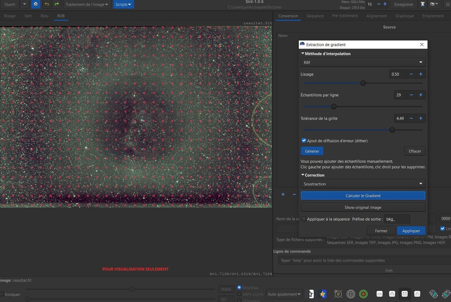 J'ai essayé de regarder ton image. Sous Siril, j'ai fait une extraction de gradient, avec affichage en autoajustement. J'ai fait plusieurs essais et itération, mais le plus gros du gradient, en centre de l'image, SIRIL n'arrie pas à le virer. Pour les arcs à droite de l'images, je ne suis pas experts mais je pencherais plus vers le reflets d'étoiles juste hors du champs. Par contre pour la zone très lumineuse au centre, je ne sais pas. De la buée devrait te donner des étoiles plus empattées. La seule fois ou j'ai eu des choses similaires, c'était du à une conjonction de passage nuageux et de flats approximatifs. Cette zone très lumineuse au centre est visible sur les brutes aussi ? -