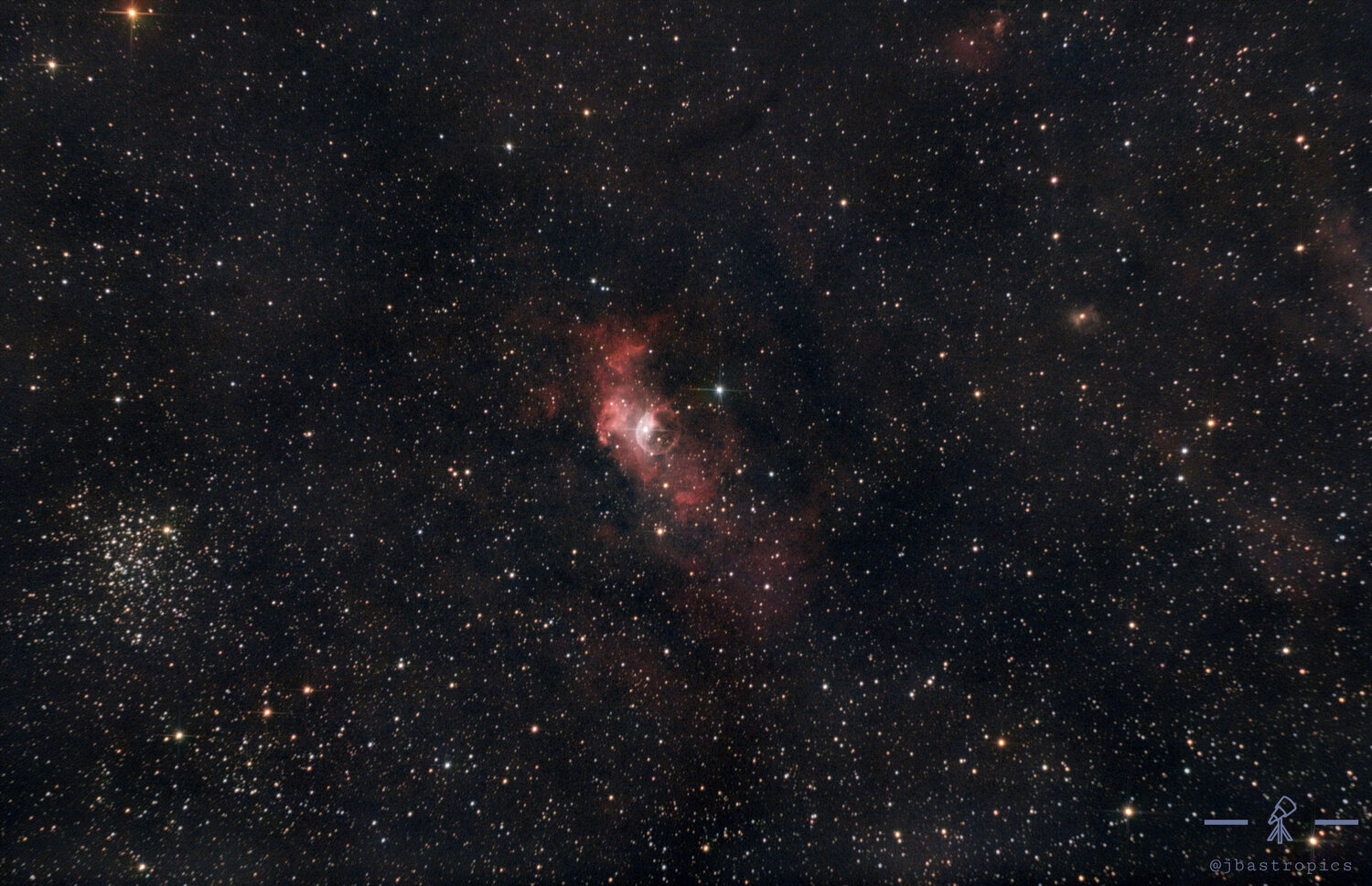 19. Hello J'ai réalisé hier soir une photo de la nébuleuse de la Bulle. C'était un vrai défi pour moi car c'est un objet très peu lumineux, mais aussi car je commence à atteindre les limites de mon matériel. Je n'ai, en effet, pas du matériel très poussé (j'image avec un 150/750 sur une eq 3-2 motorisée en AD, rien de très stable donc) La nuit fut assez noire et favorable hormis un vent modéré et présent sur la presque totalité de la nuit. Mes étoiles ne sont donc pas parfaitement rondes, et l'image perd légèrement en netteté et le bruit reste tout de même assez présent. Le résultat n'en reste pas moins satisfaisant, surtout en connaissant le matériel limité que j'utilise, comme quoi le 150/750 peut réaliser encore des grandes choses... Détails : Perl 150/750 canon eos 550d défiltré total monture eq 3-2 motorisée AD correcteur de coma baader mark III (qui aide à réduire le coma mais ne l'élimine pas totalement, ce que j'ai du mal à comprendre) 638 images dont 634 retenues 30s de pose par image total : ~5h20 iso 800 50 DOFs traitement sous siril, gimp et starnet Si vous avez une quelconque remarque à faire, hésitez pas, je prendrai n'importe quoi qui me permettrait de m'améliorer.