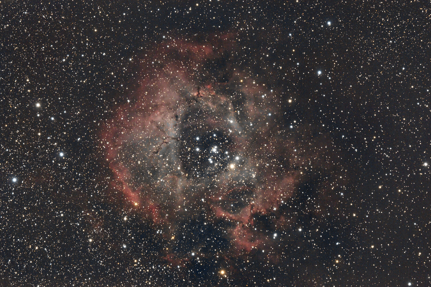 Bonjour, Pour avis, ma première Rosette, au total j ai 5h sur deux nuits. Va falloir que j investisse dans un filtre antipollution lumineuse car mon ciel est vraiment pas top, bortle de 6… -80ed et son réducteur x0,85 -canon 1200D defiltré partiel -heq5 non kité Rowan -Asi mini sur lunette guide -Asiair Temps de pose unitaire de 300s à 800iso DOF Merci