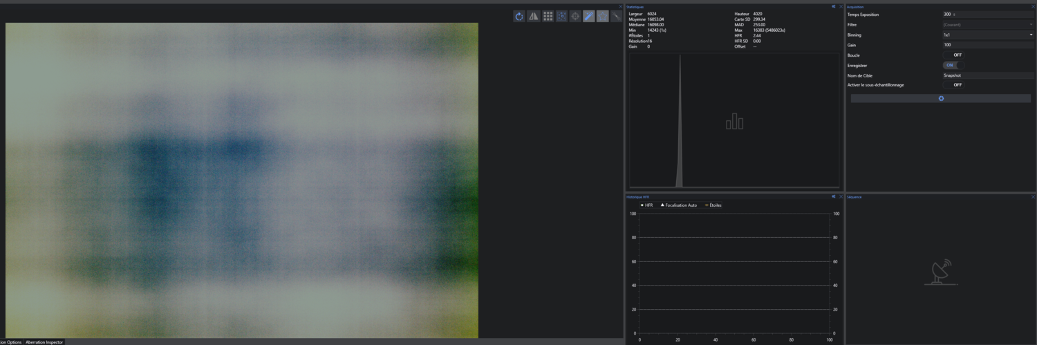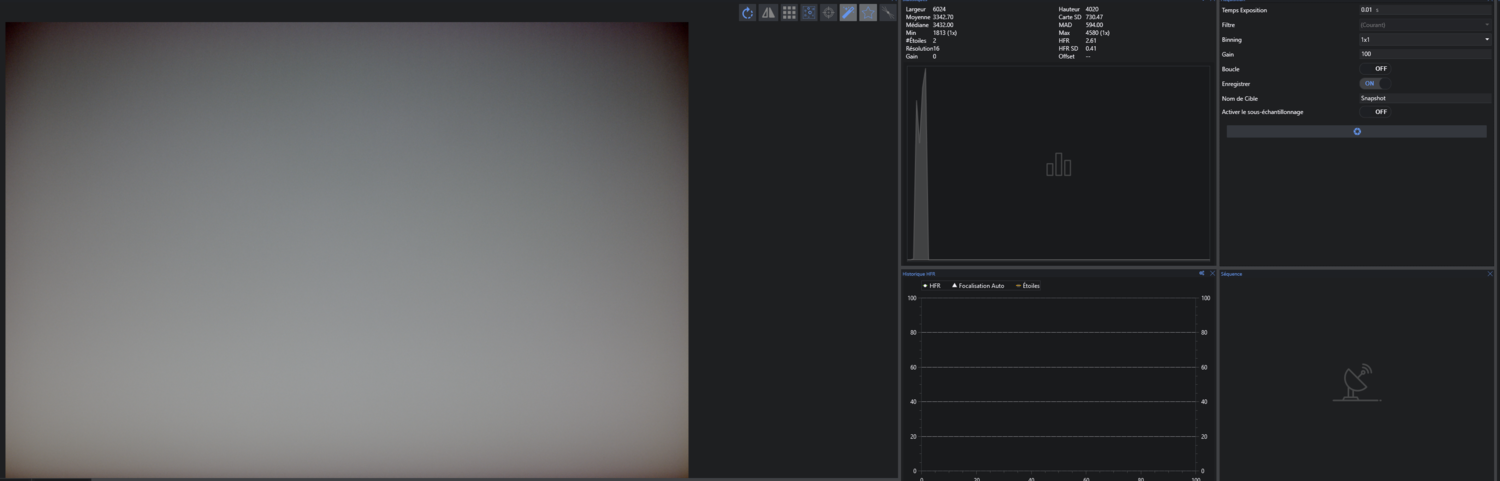 Bonjour à tous je me permet ce post car je n'arrive pas à faire de flat dans NINA. Je possède un EOS 200D ASTRODON EOS FOR ASTRO. Mon problème est que quand je vais dans l'assistant PLU et que je fais mes réglages pour tester, il part direct sur du 300s, donc j'ai tester les 300s dans l'onglet acquisition dont voici un screen. Même avec 300s j'ai un histogramme tout à gauche, alors que si je me met en live view sur l'APN et que je regarde l'histogramme j'arrive sur 1/100eme de seconde pour faire les flats mais sous NINA ca ne fonctionne pas. Le truc c'est que je suis en train de me monter un observatoire pour pouvoir profiter pleinement de mon matériel, j'aimerais automatiser les flats et les darks, sans ca mes photos resterons de moins bonne qualité ou alors il faudra quand même que je fasse manuellement les DOF. Les test ont été effectués APN + correcteur de comma directement sur un écran de PC portable. Merci d'avance pour l'aide que vous m'apporterez et bon week-end ! 2024-09-07_09-39-35__38.00_0.01s_0000.fits