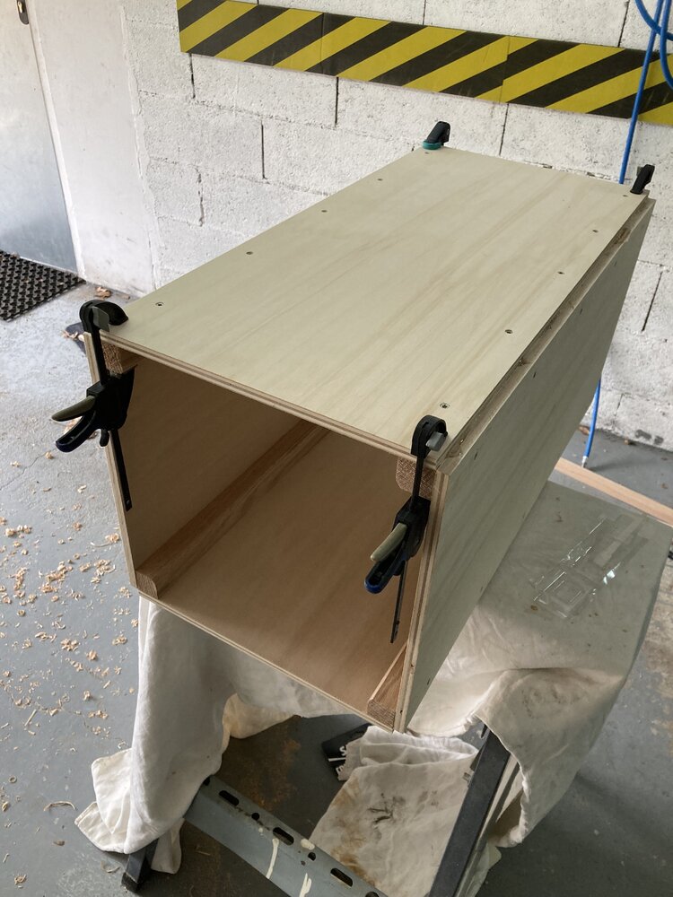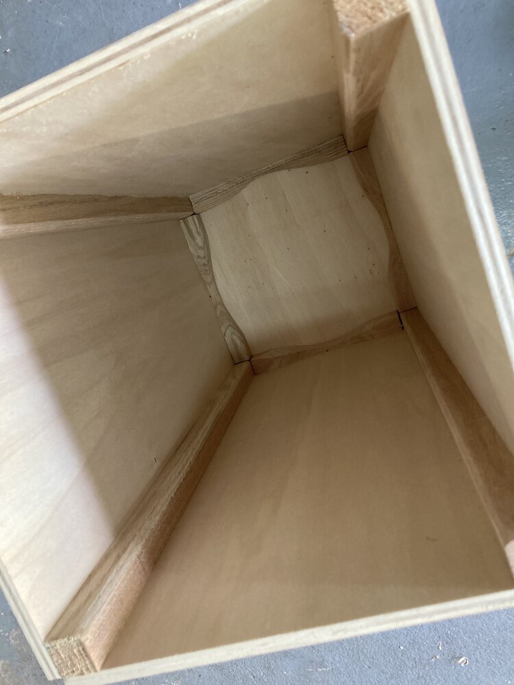 En fait mon choix de l’ouverture par le dessus permet d’avoir une boîte à la fois plus solide et un peu plus compacte. J’ai des baguettes de renfort sur la longueur dans les 4 coins tout en ayant des dimensions contenues.