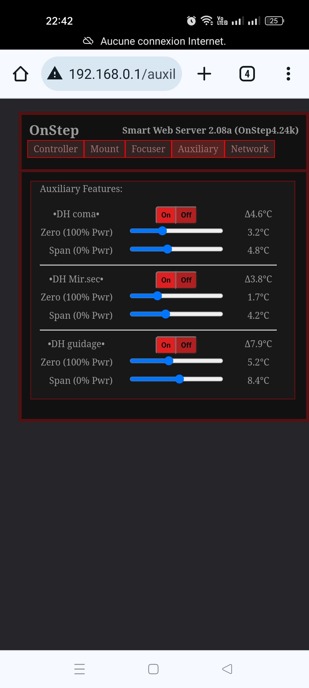 A l'issue des tests je ferai une synthèse pour les réglages, c'est fini pour aujourd'hui, le ciel restera couvert le reste de la nuit. La suite vendredi si tout va bien. Côté chauffage(DEW_HEATER), dehors cette fois et pas dans le garage, ça fonctionne bien La régulation est nickel, la température de chauffe reste dans la plage demandée et le pwm est a +-40%. Il y a encore de la marge pour que ça fonctionne avec une température extérieure plus basse. Seul regret, la section dew heaters n'est pas parametrisable(pour l'instant) via le driver indi. Obligé de se connecter via un esp8266(web server Onstep) pour le configurer. Mais bon une fois configuré logiquement la régulation fait son job au démarrage du contrôleur, pas besoin de s'en préoccuper. Un retour numérique des valeurs dans un onglet du driver indi serait appréciable Le BME280 par contre semble trop près du contrôleur(et sa dissipation thermique) , il indique 4° au lieu de -1°. A peaufiner. -