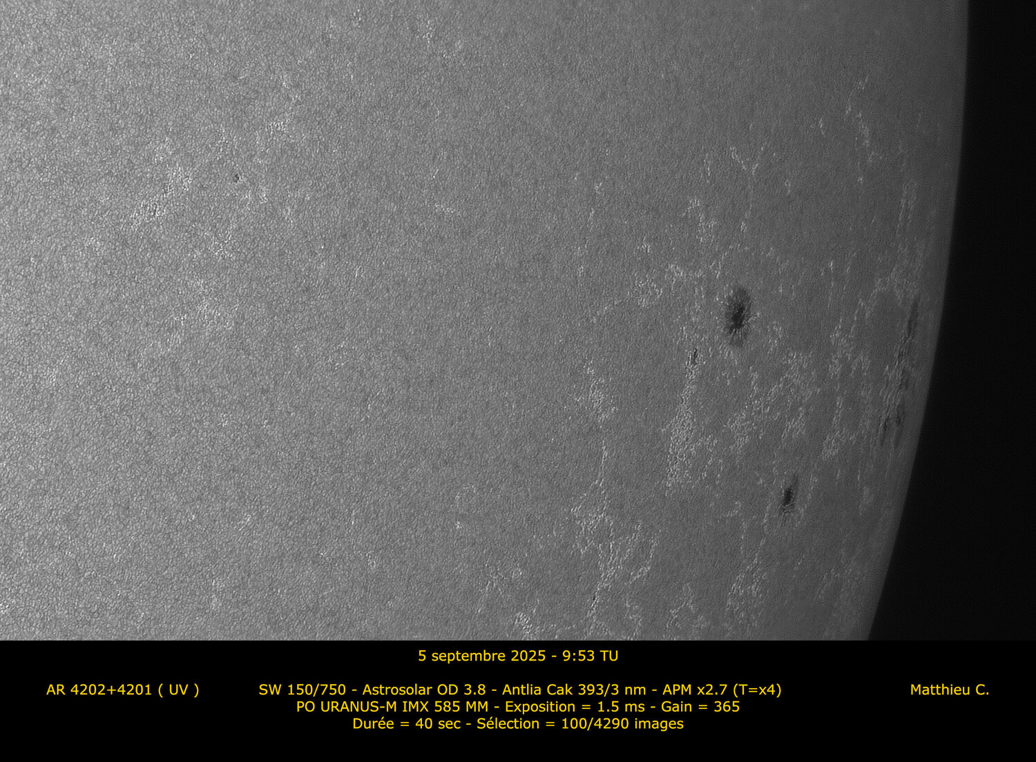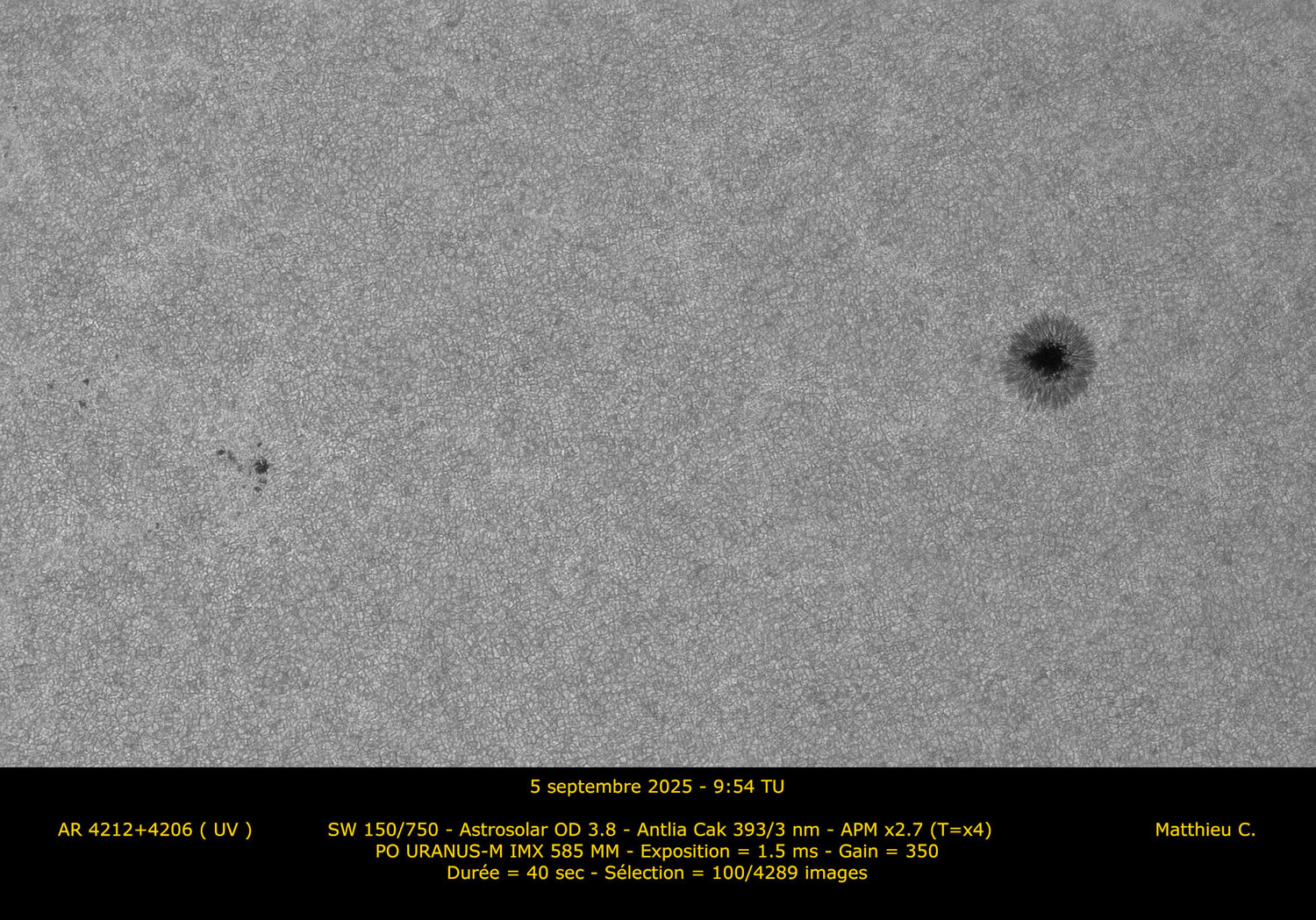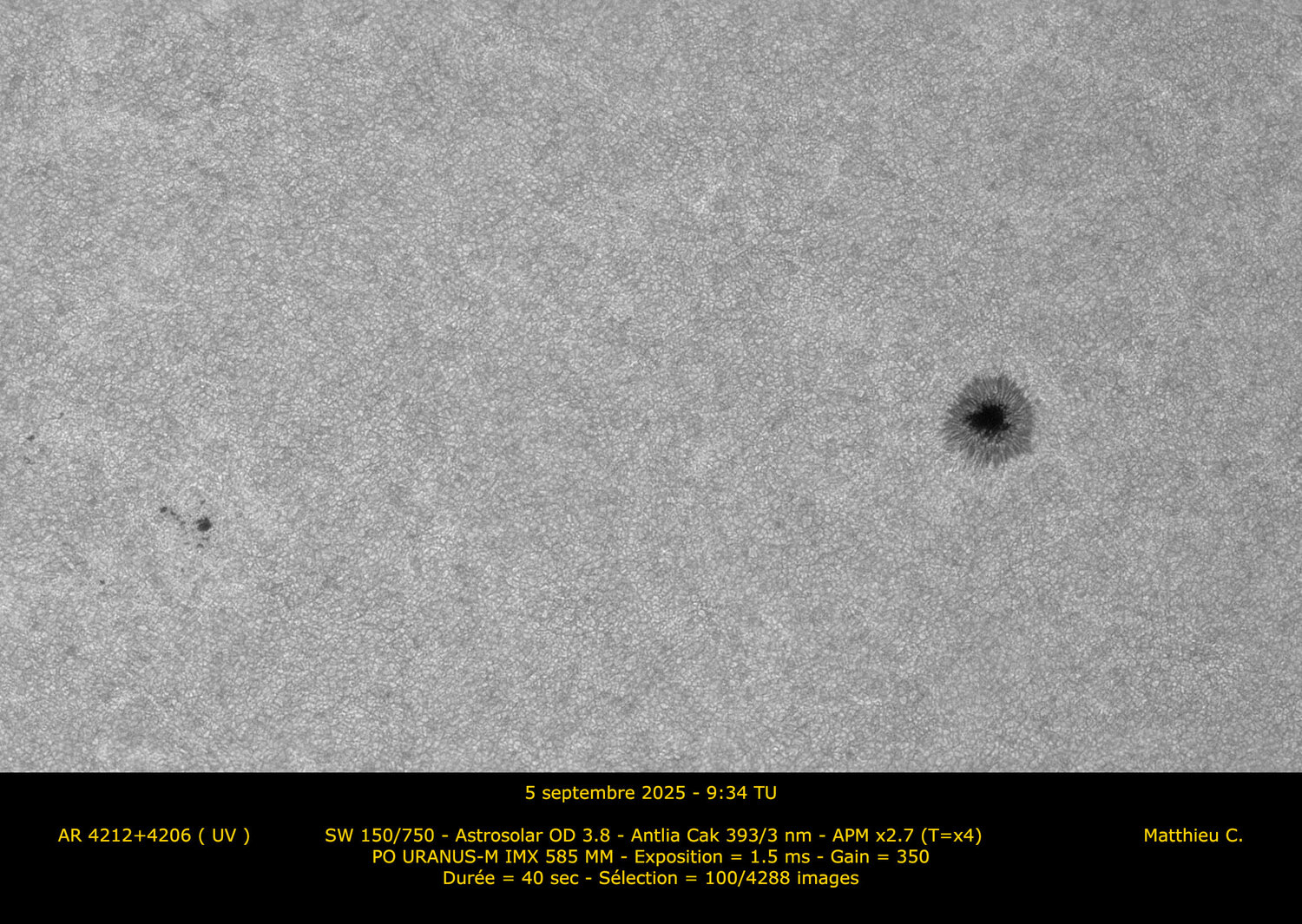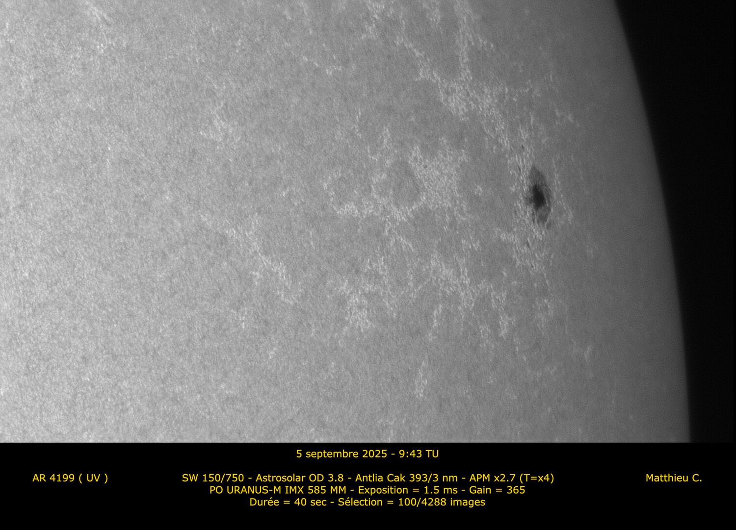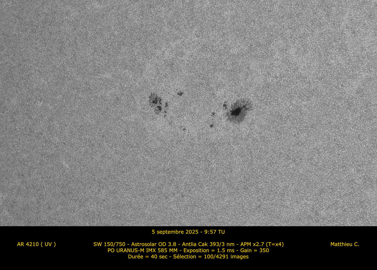 Bonjour. Quelques photos prises il y'a deux jours en Cak et en proche UV haute résolution. Malgré un seeing pas tout à fait au taquet, c'est la première fois que j'arrive à faire passer le Cak 3 nanomètres avec succès en HR avec une feuille astrosolar densité 3.8. Tout cela grâce au combo gagnant IMX 585 / APM x2.7 dont la transparence en UV est redoutable... -