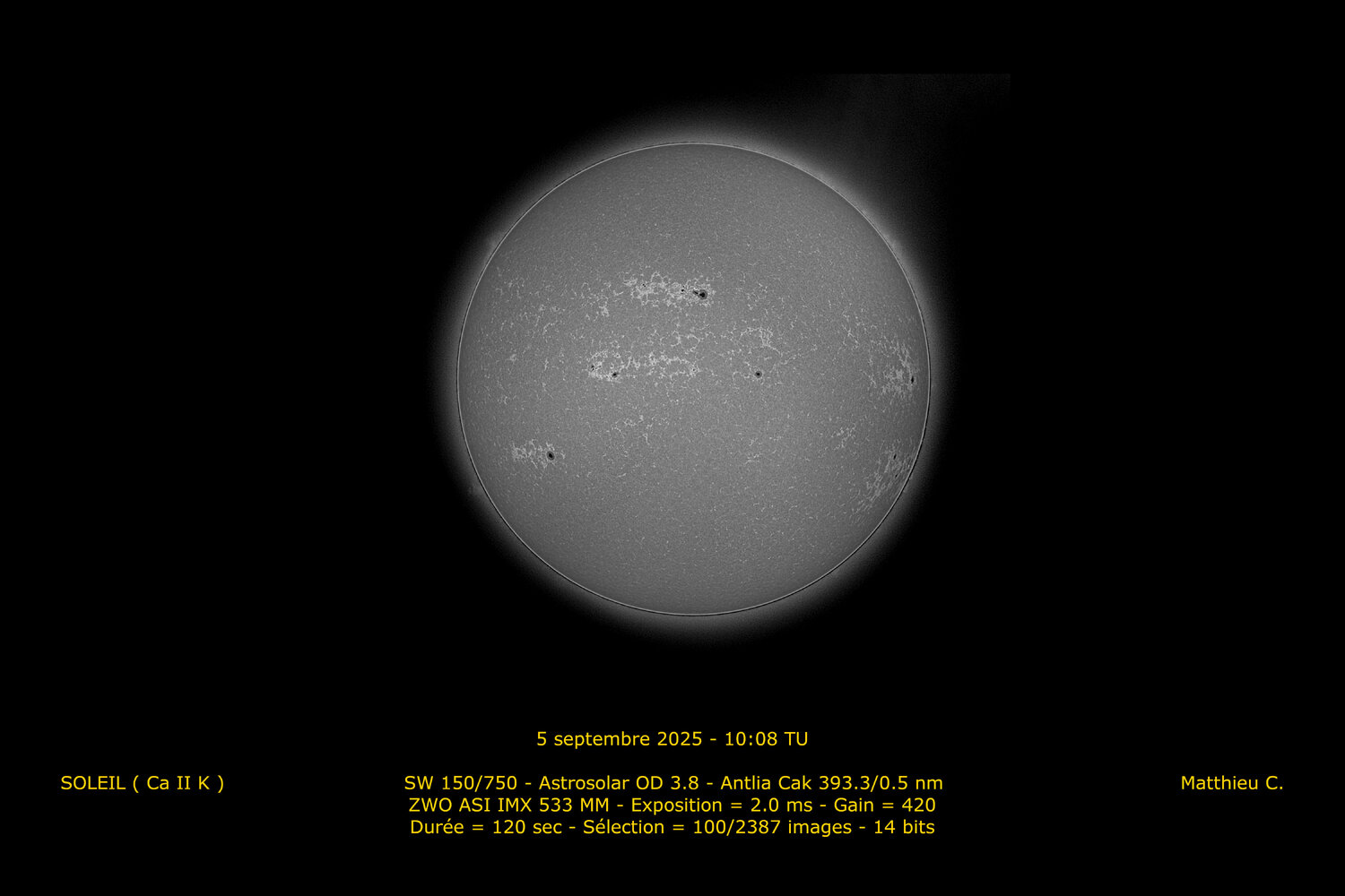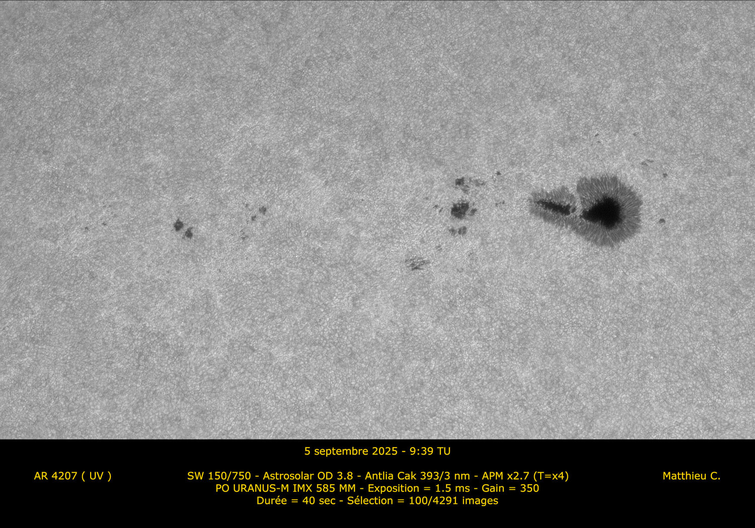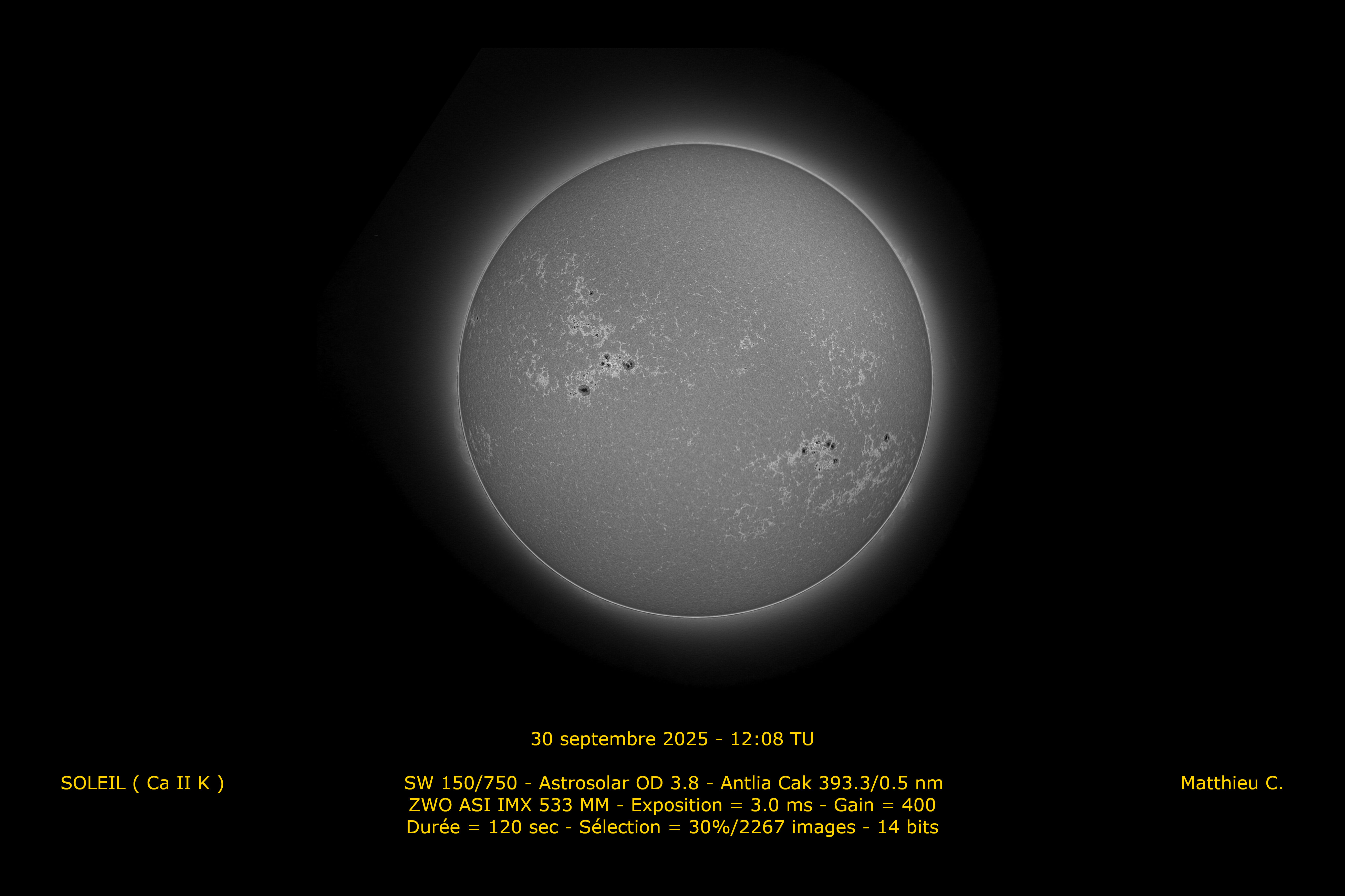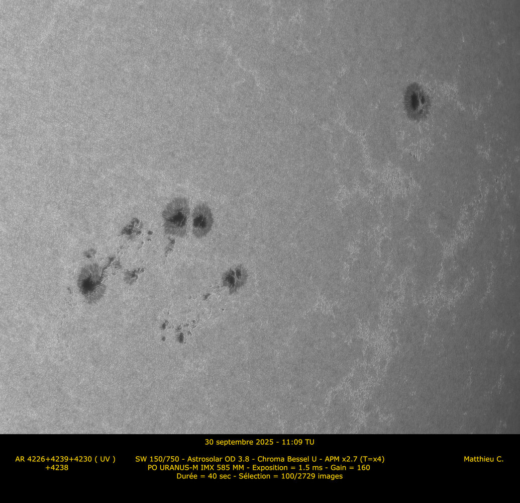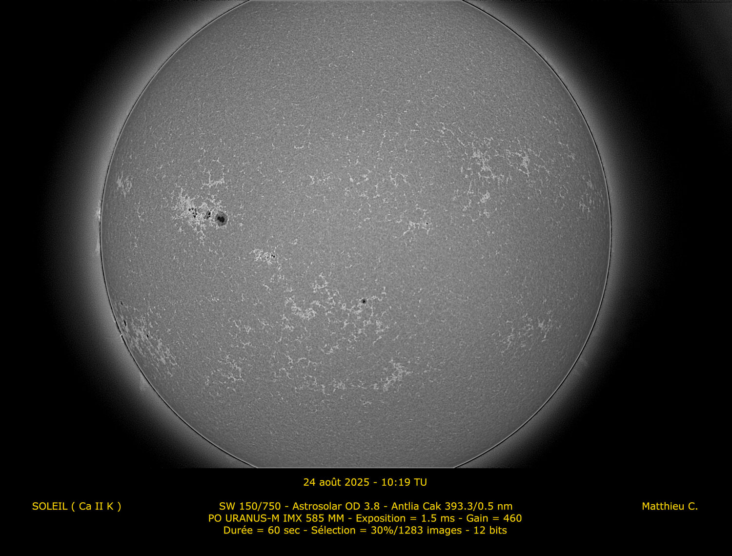 Bonjour. Quelques photos prises il y'a deux jours en Cak et en proche UV haute résolution. Malgré un seeing pas tout à fait au taquet, c'est la première fois que j'arrive à faire passer le Cak 3 nanomètres avec succès en HR avec une feuille astrosolar densité 3.8. Tout cela grâce au combo gagnant IMX 585 / APM x2.7 dont la transparence en UV est redoutable... -