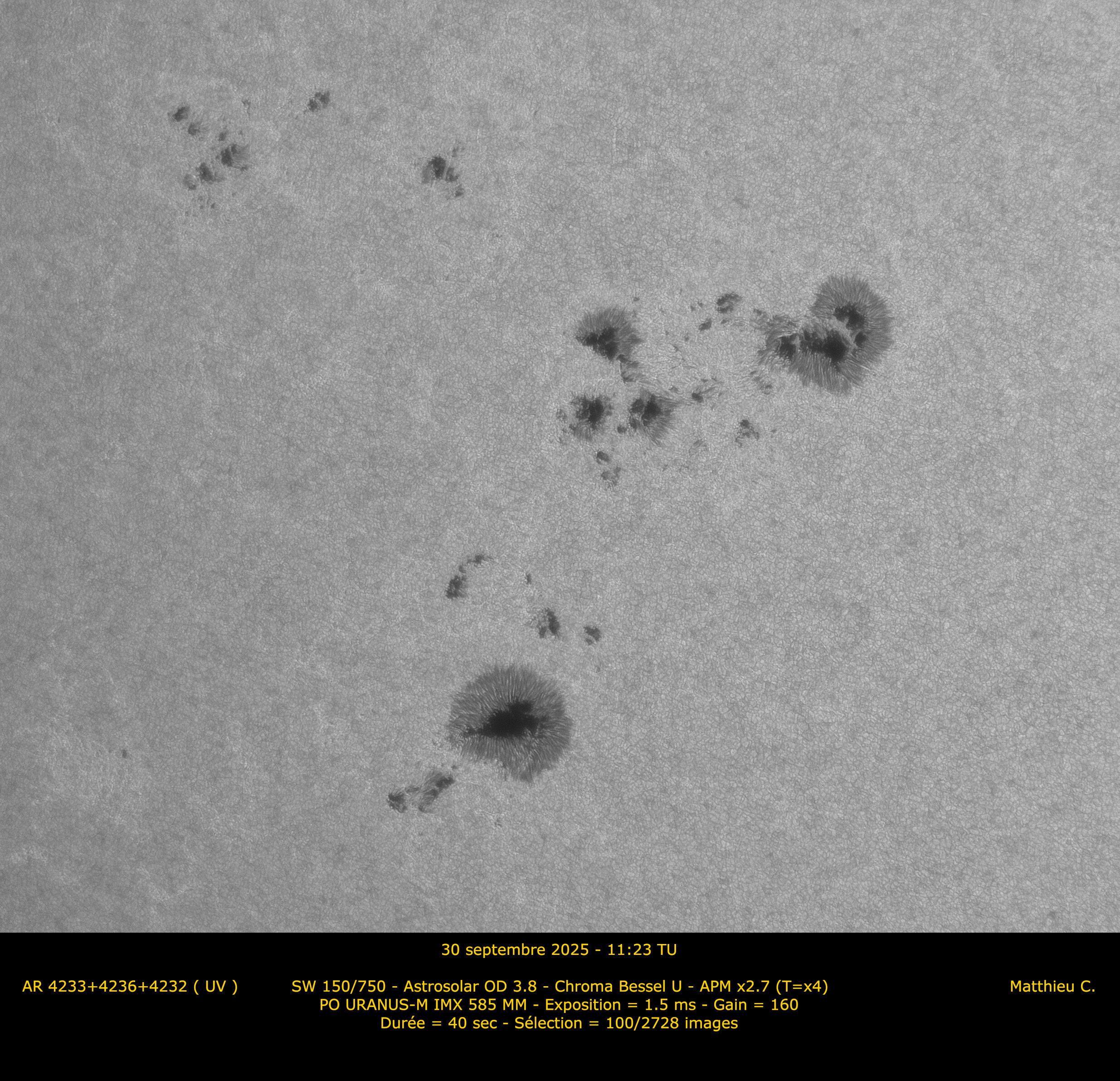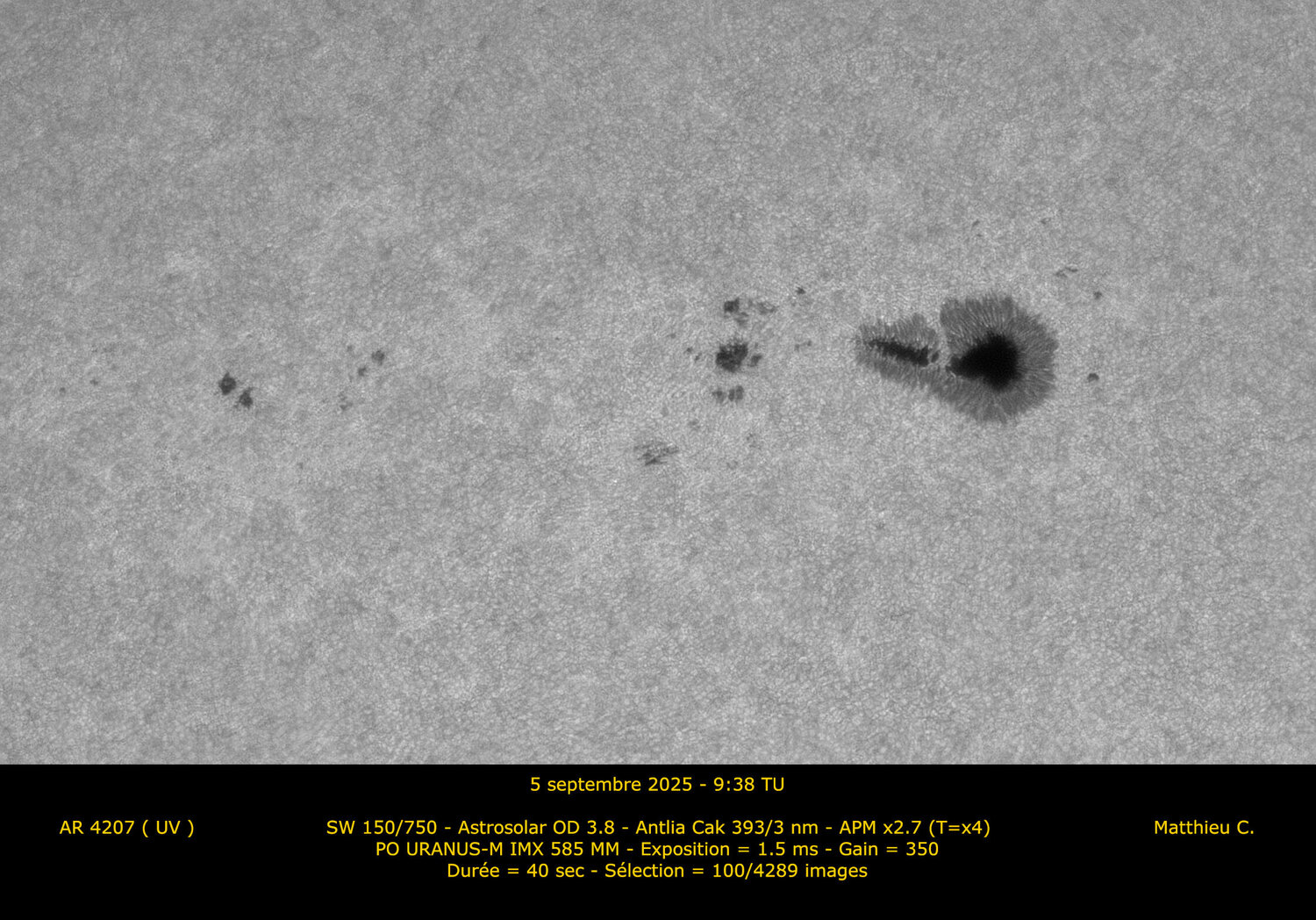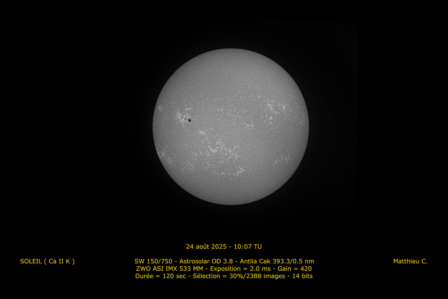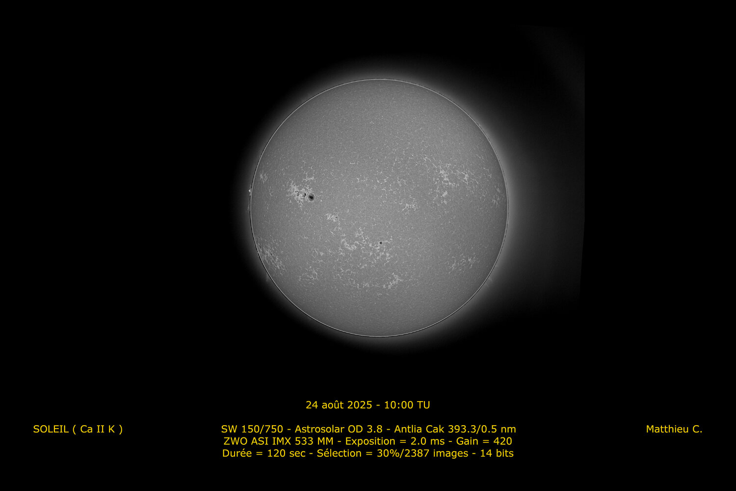 Bonjour. Quelques photos prises il y'a deux jours en Cak et en proche UV haute résolution. Malgré un seeing pas tout à fait au taquet, c'est la première fois que j'arrive à faire passer le Cak 3 nanomètres avec succès en HR avec une feuille astrosolar densité 3.8. Tout cela grâce au combo gagnant IMX 585 / APM x2.7 dont la transparence en UV est redoutable... -