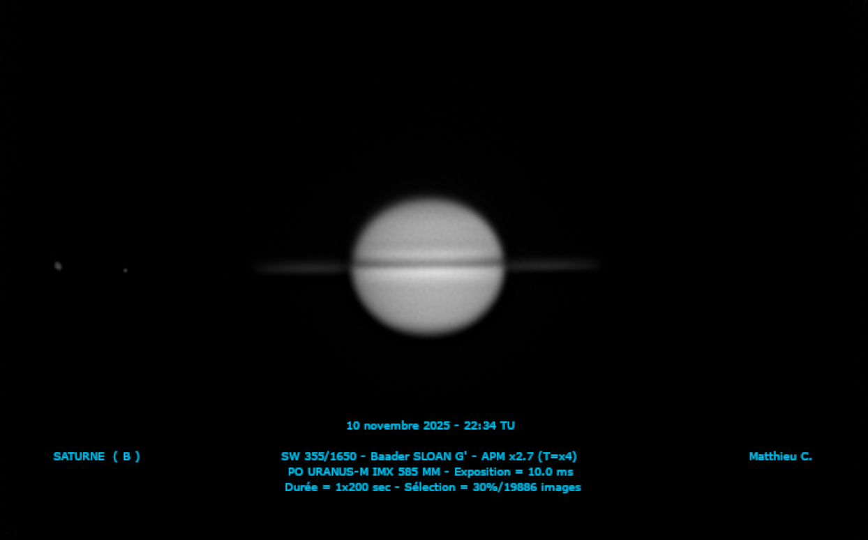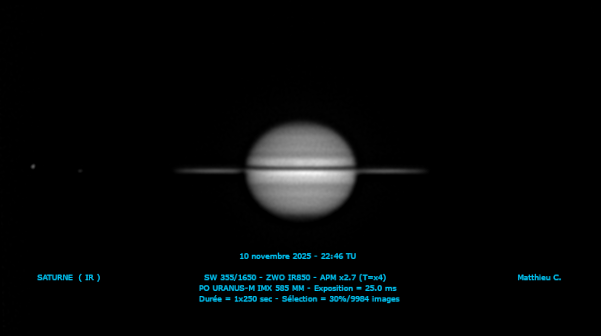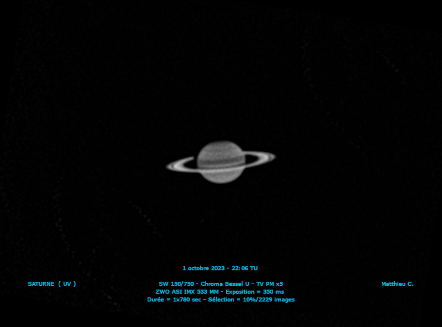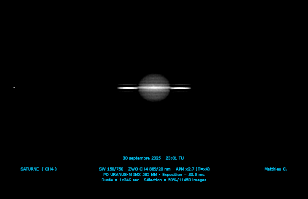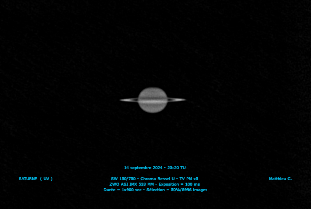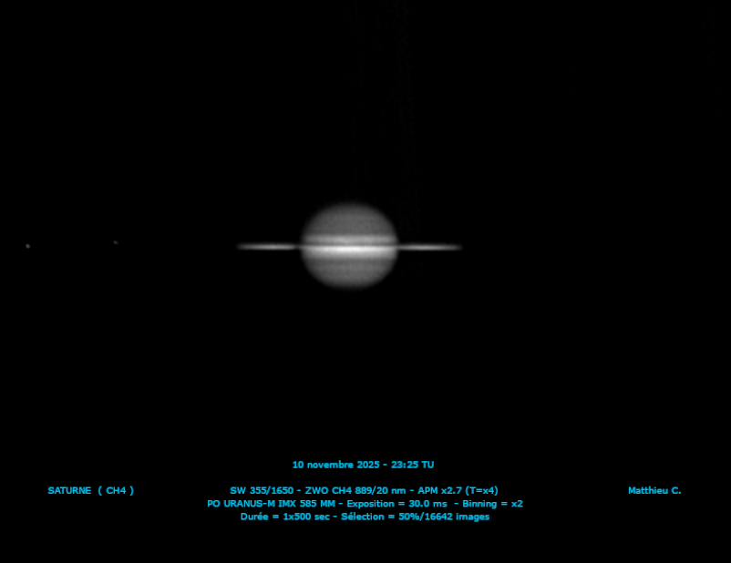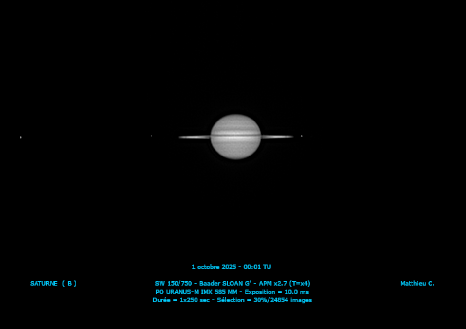 Belle nuit que celle du 30 septembre au 1er octobre. Le seeing était aussi au rendez-vous par ailleurs. Le petit newton était donc tout logiquement sur le pont pour ce que je considère comme 'mon opposition' de Saturne saison 2025. Cette-nuit-là, j'ai commencé par le filtre méthane... Très clairement, les spots clairs et sombres visibles sur mon image sont des artefacts. Manque de résolution bien sûr mais aussi gros problèmes de suivi cette nuit-là ( qu'il va falloir que je surveille attentivement car c'est la première fois que cela m'arrive avec l'HEQ-5 ) qui m'ont empêché de pouvoir faire des acquisitions fluides supérieures à 350 sec à 1 ou 2 exceptions près... Après le CH4, l'infrarouge. 850 d'abord, puis 642 nm. Peut-être, mais je dois être extrêmement prudent, le spot sud sur l'image en 642... On passe de l'autre côté du spectre. C'est là où ça devient intéressant ( en tout cas pour moi... ) ! D'abord l'UV. J'en ai déjà réalisé les années passées et le filtre utilisé est toujours le même : un Chroma Bessel U. Cependant, et c'est une première cette année, le train optique est légèrement modifié. Pourtant, ça fait une grosse différence... J'ai troqué ma powermate x5 ( voir ci-dessous ) contre ma barlow APM x2.7 dont le tirage est poussée à x4. Cela semble impacter notablement ma bande passante effective. Le filtre U-Bessel transmet de 320-395 nm. Or, la powermate ne permet pas d'exploiter l'intégralité de cette plage ( l'atmosphère terrestre non plus de toute façon mais c'est une autre histoire... ) et coupe tout en-deçà de 360 nm. Cela dit, la courbe de transmission en-deçà de 400 nm n'est déjà pas belle à voir et il est raisonnable de supposer que la majeure partie du flux UV de Saturne n'était contenue qu'entre 380 et 400 nm dans cette config. L'avantage de cette config étant de limiter les effets de la dispersion atmosphérique. Avec l'APM, on sent que la transparence dans les UV va beaucoup plus loin. L'image 2025 ne ressemble pas tout à fait à 2024 et 2023 par ailleurs. Forcément, côté dispersion, c'est théoriquement moins bon mais bon sang !, ça dépote avec l'imx 585 !!! J'aurai jamais espéré pouvoir me caler confortablement à 20 ms pour un gain même pas à fond et avoir une si bonne exposition dès la capture. Quand je vois comment je galérai les années passées avec l'imx 533... 350 ms, gain à fond, je la voyais à peine sur mon écran... Ce qu'on y voit est intéressant. D'abord une différence globale d'albédo entre les deux hémisphères. Le Nord, qui sort de sa saison estivale, comporte une grosse bande sombre dans la partie nord-équatoriale, dont je dois avouer avoir du mal à y voir l'impact de la diffusion de Rayleigh surtout lorsque je regarde ce qu'a sorti Hubble un peu plus loin encore en UV; une bande plus mince à moyenne latitude, et enfin une calotte polaire sombre ( si Rayleigh et sa diffusion était entièrement responsable de l'aspect observable de Saturne en UV, on devrait la voir claire. Or, ce n'est pas le cas, Christophe, si tu passe par là... ). Le Sud, qui lui sort de sa saison hivernale... est homogène... On peut l'expliquer au moins en partie grâce aux travaux photométriques de Christophe sur Saturne lors des années passées. L'hémisphère ayant été exposé au Soleil tout l'été tend à être beaucoup plus jaune alors que l'hémisphère exposé à l'ombre tout l'hiver en ressort beaucoup plus dans des tons vert-bleu. Je soulève le fait qu'il ne soit pas impossible que si ces tons ne soient plus visibles... dans les longueurs d'onde visibles, elles ne le soient encore par contraste en UV, un peu comme dans le cas de l'EZ jovien soit dit en passant, qui continue de rester sombre en UV alors qu'en visible elle a perdu sa teinte rougeâtre. Bon, ce qui est certain, c'est que si le pôle sud ne ressort pas encore en UV au moment de l'équinoxe, il devrait rapidement s'assombrir avant l'arrivée du solstice. On continue avec un filtre violet W47. Celui-ci est utilisé en duo avec un uv/ir-cut afin, non seulement, de ne pas englober la partie UV que laisse passer ce filtre mais encore de ne pas créer d'interférence avec la fuite dans l'IR que provoque ce type de filtre bas coût. On constate qu'il y'a un gap au passage des 400 nm. L'aspect ne ressemble plus vraiment à ce que l'on perçoit avec le Bessel U. Au contraire, il est très proche de ce que l'on obtient avec un G'... Enfin, une luminance, histoire de comparer avec ce que nos petits yeux en perçoivent... Sur la plupart de ces images, Rhéa est présente à l'extrême gauche. Thétys à droite des anneaux. Et Encelade, à leur gauche. Evidemment, leur exposition a été rehaussé par traitement local pour les rendre perceptibles.-
