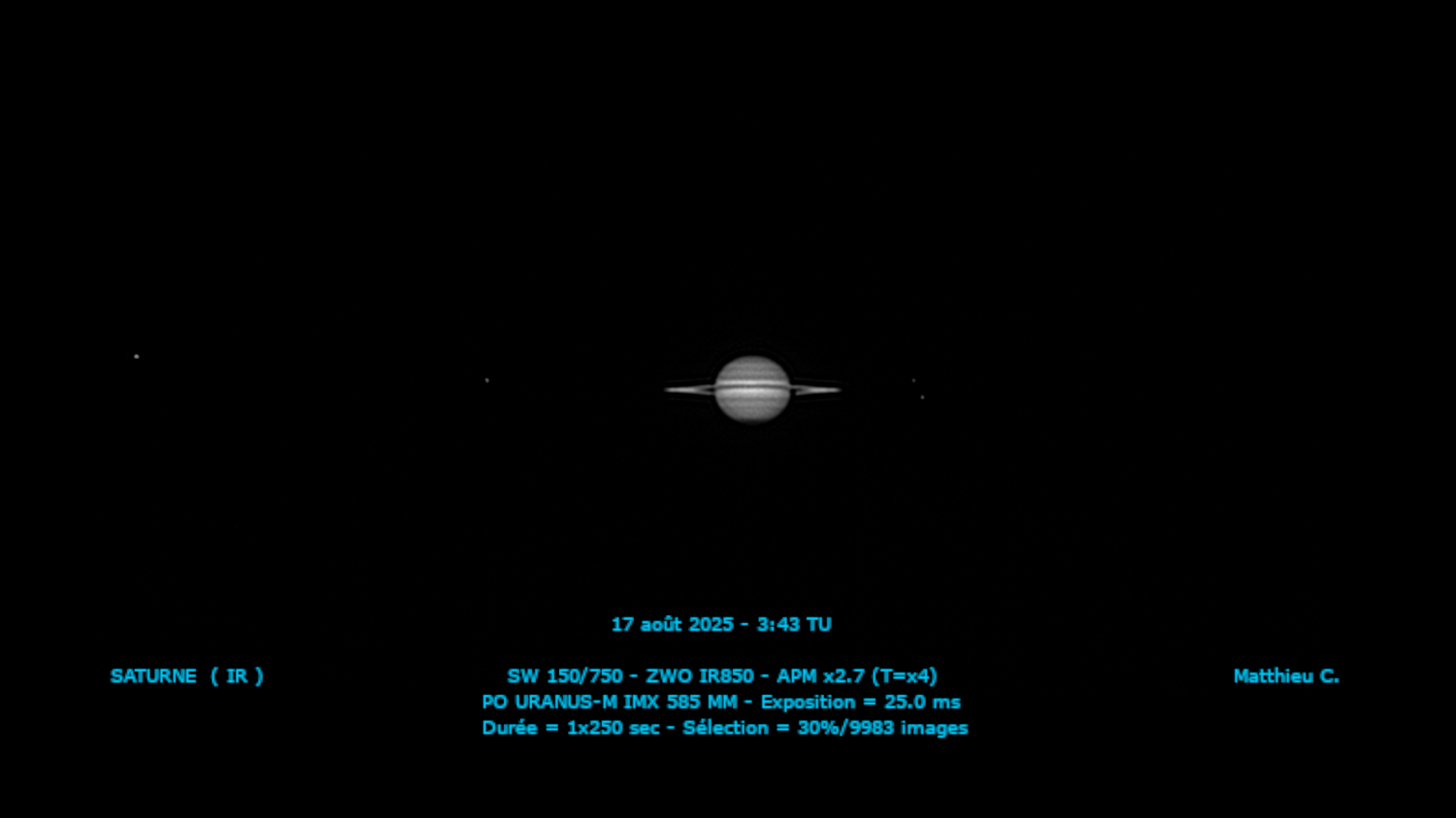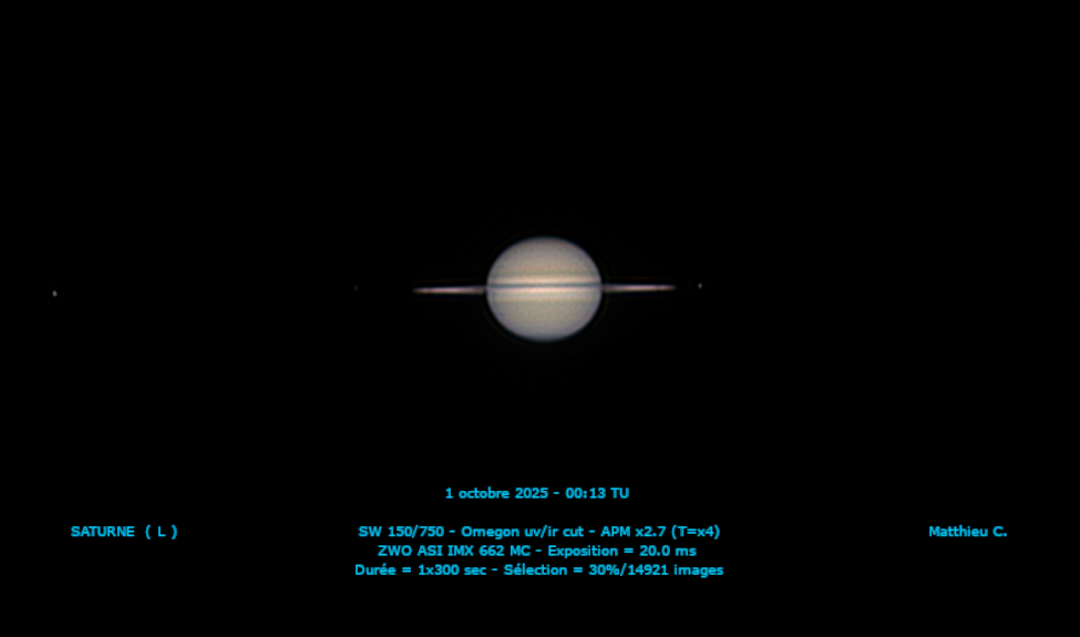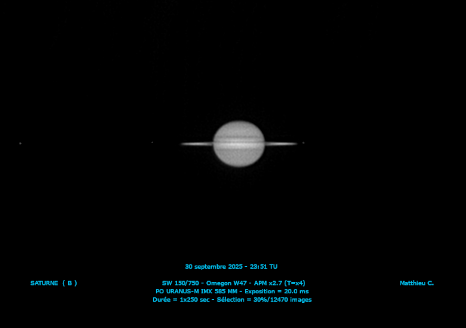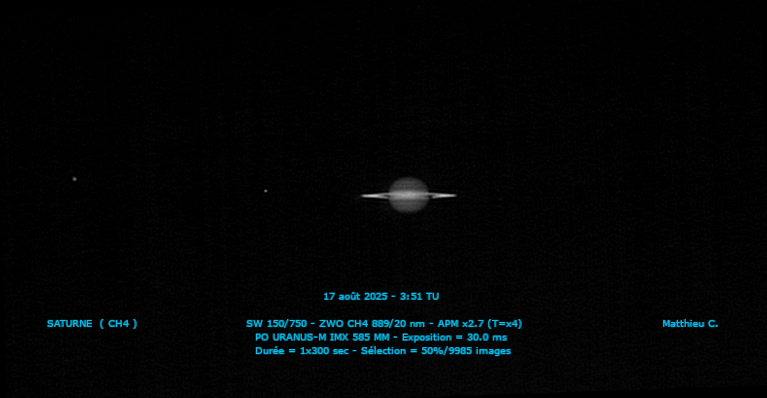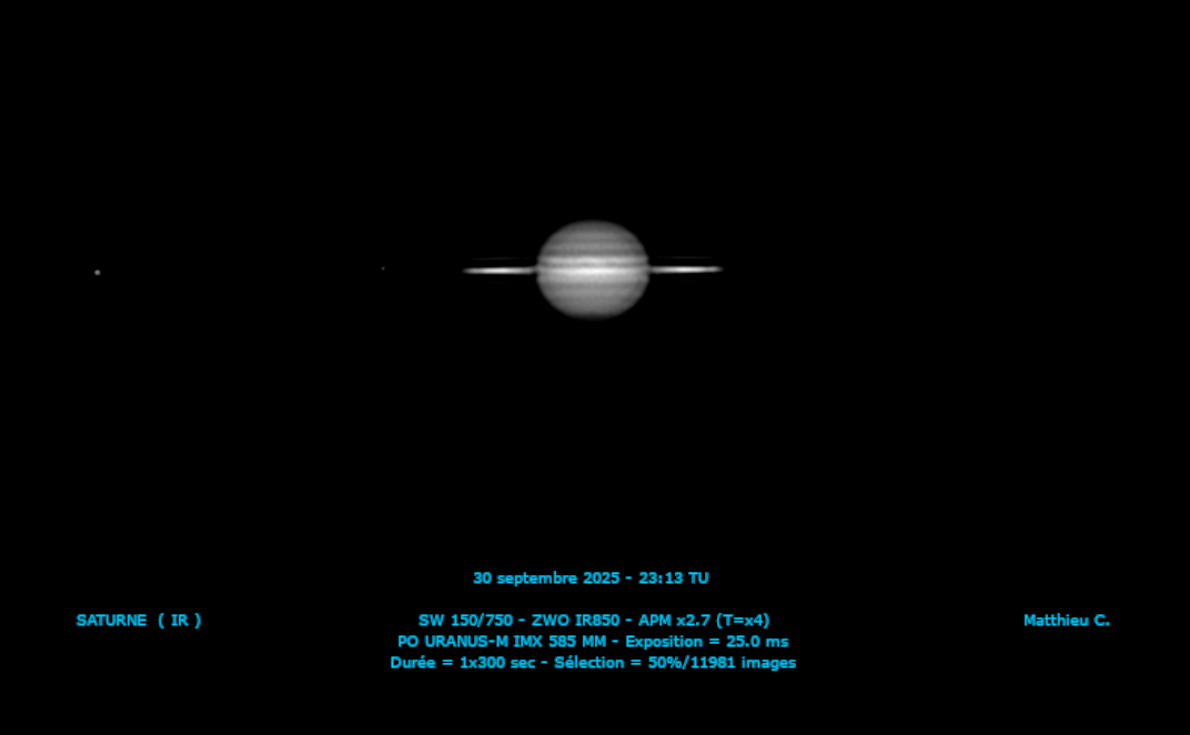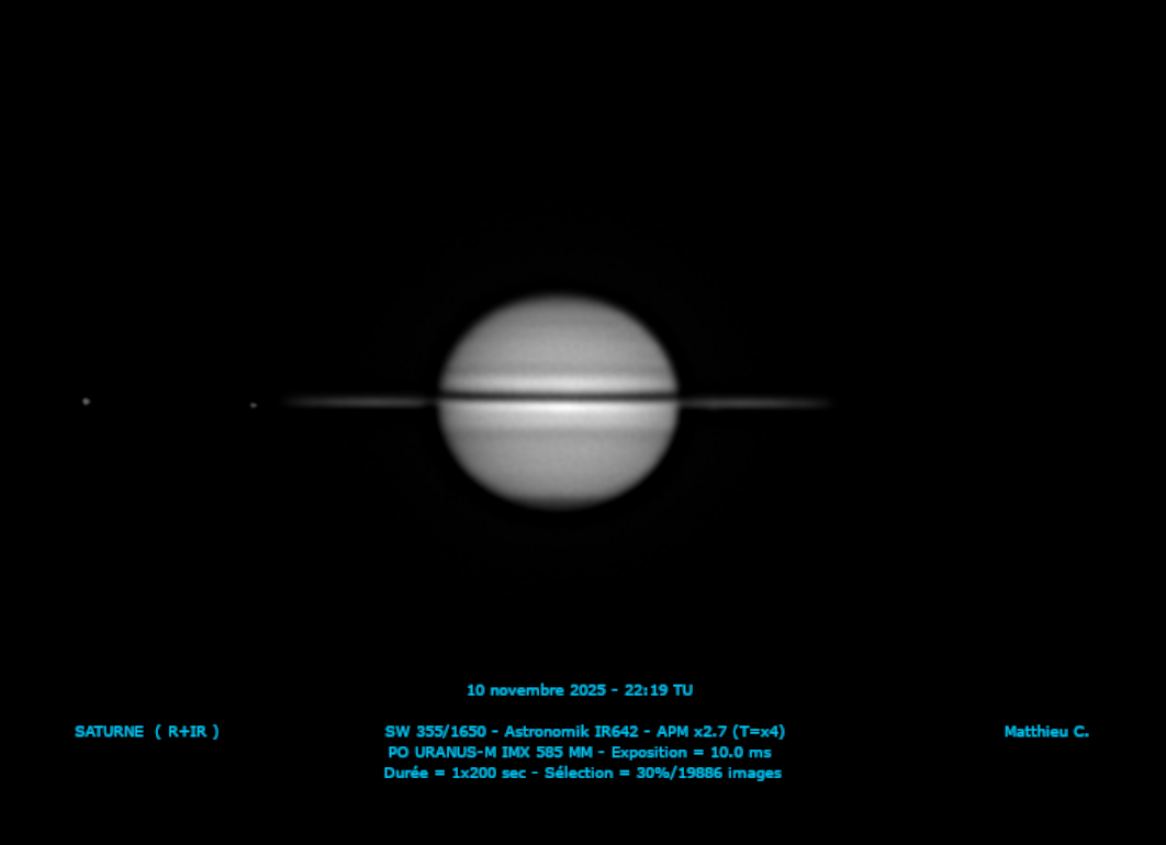 Belle nuit que celle du 30 septembre au 1er octobre. Le seeing était aussi au rendez-vous par ailleurs. Le petit newton était donc tout logiquement sur le pont pour ce que je considère comme 'mon opposition' de Saturne saison 2025. Cette-nuit-là, j'ai commencé par le filtre méthane... Très clairement, les spots clairs et sombres visibles sur mon image sont des artefacts. Manque de résolution bien sûr mais aussi gros problèmes de suivi cette nuit-là ( qu'il va falloir que je surveille attentivement car c'est la première fois que cela m'arrive avec l'HEQ-5 ) qui m'ont empêché de pouvoir faire des acquisitions fluides supérieures à 350 sec à 1 ou 2 exceptions près... Après le CH4, l'infrarouge. 850 d'abord, puis 642 nm. Peut-être, mais je dois être extrêmement prudent, le spot sud sur l'image en 642... On passe de l'autre côté du spectre. C'est là où ça devient intéressant ( en tout cas pour moi... ) ! D'abord l'UV. J'en ai déjà réalisé les années passées et le filtre utilisé est toujours le même : un Chroma Bessel U. Cependant, et c'est une première cette année, le train optique est légèrement modifié. Pourtant, ça fait une grosse différence... J'ai troqué ma powermate x5 ( voir ci-dessous ) contre ma barlow APM x2.7 dont le tirage est poussée à x4. Cela semble impacter notablement ma bande passante effective. Le filtre U-Bessel transmet de 320-395 nm. Or, la powermate ne permet pas d'exploiter l'intégralité de cette plage ( l'atmosphère terrestre non plus de toute façon mais c'est une autre histoire... ) et coupe tout en-deçà de 360 nm. Cela dit, la courbe de transmission en-deçà de 400 nm n'est déjà pas belle à voir et il est raisonnable de supposer que la majeure partie du flux UV de Saturne n'était contenue qu'entre 380 et 400 nm dans cette config. L'avantage de cette config étant de limiter les effets de la dispersion atmosphérique. Avec l'APM, on sent que la transparence dans les UV va beaucoup plus loin. L'image 2025 ne ressemble pas tout à fait à 2024 et 2023 par ailleurs. Forcément, côté dispersion, c'est théoriquement moins bon mais bon sang !, ça dépote avec l'imx 585 !!! J'aurai jamais espéré pouvoir me caler confortablement à 20 ms pour un gain même pas à fond et avoir une si bonne exposition dès la capture. Quand je vois comment je galérai les années passées avec l'imx 533... 350 ms, gain à fond, je la voyais à peine sur mon écran... Ce qu'on y voit est intéressant. D'abord une différence globale d'albédo entre les deux hémisphères. Le Nord, qui sort de sa saison estivale, comporte une grosse bande sombre dans la partie nord-équatoriale, dont je dois avouer avoir du mal à y voir l'impact de la diffusion de Rayleigh surtout lorsque je regarde ce qu'a sorti Hubble un peu plus loin encore en UV; une bande plus mince à moyenne latitude, et enfin une calotte polaire sombre ( si Rayleigh et sa diffusion était entièrement responsable de l'aspect observable de Saturne en UV, on devrait la voir claire. Or, ce n'est pas le cas, Christophe, si tu passe par là... ). Le Sud, qui lui sort de sa saison hivernale... est homogène... On peut l'expliquer au moins en partie grâce aux travaux photométriques de Christophe sur Saturne lors des années passées. L'hémisphère ayant été exposé au Soleil tout l'été tend à être beaucoup plus jaune alors que l'hémisphère exposé à l'ombre tout l'hiver en ressort beaucoup plus dans des tons vert-bleu. Je soulève le fait qu'il ne soit pas impossible que si ces tons ne soient plus visibles... dans les longueurs d'onde visibles, elles ne le soient encore par contraste en UV, un peu comme dans le cas de l'EZ jovien soit dit en passant, qui continue de rester sombre en UV alors qu'en visible elle a perdu sa teinte rougeâtre. Bon, ce qui est certain, c'est que si le pôle sud ne ressort pas encore en UV au moment de l'équinoxe, il devrait rapidement s'assombrir avant l'arrivée du solstice. On continue avec un filtre violet W47. Celui-ci est utilisé en duo avec un uv/ir-cut afin, non seulement, de ne pas englober la partie UV que laisse passer ce filtre mais encore de ne pas créer d'interférence avec la fuite dans l'IR que provoque ce type de filtre bas coût. On constate qu'il y'a un gap au passage des 400 nm. L'aspect ne ressemble plus vraiment à ce que l'on perçoit avec le Bessel U. Au contraire, il est très proche de ce que l'on obtient avec un G'... Enfin, une luminance, histoire de comparer avec ce que nos petits yeux en perçoivent... Sur la plupart de ces images, Rhéa est présente à l'extrême gauche. Thétys à droite des anneaux. Et Encelade, à leur gauche. Evidemment, leur exposition a été rehaussé par traitement local pour les rendre perceptibles.-