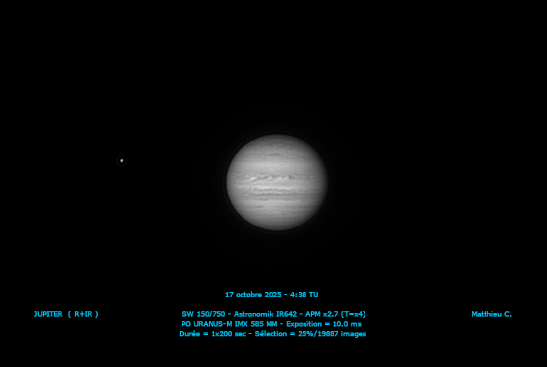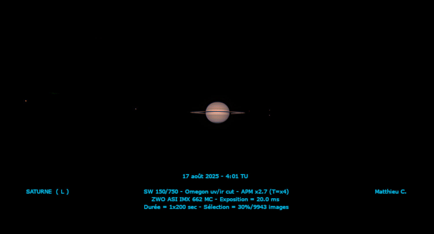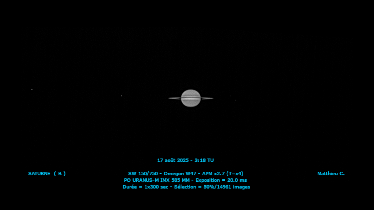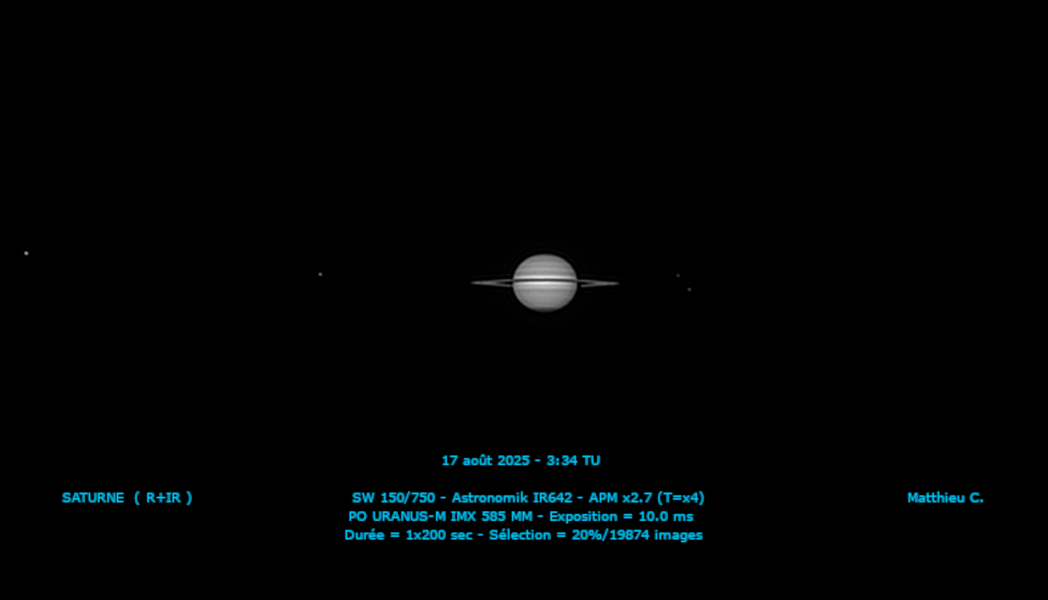 Belle nuit que celle du 30 septembre au 1er octobre. Le seeing était aussi au rendez-vous par ailleurs. Le petit newton était donc tout logiquement sur le pont pour ce que je considère comme 'mon opposition' de Saturne saison 2025. Cette-nuit-là, j'ai commencé par le filtre méthane... Très clairement, les spots clairs et sombres visibles sur mon image sont des artefacts. Manque de résolution bien sûr mais aussi gros problèmes de suivi cette nuit-là ( qu'il va falloir que je surveille attentivement car c'est la première fois que cela m'arrive avec l'HEQ-5 ) qui m'ont empêché de pouvoir faire des acquisitions fluides supérieures à 350 sec à 1 ou 2 exceptions près... Après le CH4, l'infrarouge. 850 d'abord, puis 642 nm. Peut-être, mais je dois être extrêmement prudent, le spot sud sur l'image en 642... On passe de l'autre côté du spectre. C'est là où ça devient intéressant ( en tout cas pour moi... ) ! D'abord l'UV. J'en ai déjà réalisé les années passées et le filtre utilisé est toujours le même : un Chroma Bessel U. Cependant, et c'est une première cette année, le train optique est légèrement modifié. Pourtant, ça fait une grosse différence... J'ai troqué ma powermate x5 ( voir ci-dessous ) contre ma barlow APM x2.7 dont le tirage est poussée à x4. Cela semble impacter notablement ma bande passante effective. Le filtre U-Bessel transmet de 320-395 nm. Or, la powermate ne permet pas d'exploiter l'intégralité de cette plage ( l'atmosphère terrestre non plus de toute façon mais c'est une autre histoire... ) et coupe tout en-deçà de 360 nm. Cela dit, la courbe de transmission en-deçà de 400 nm n'est déjà pas belle à voir et il est raisonnable de supposer que la majeure partie du flux UV de Saturne n'était contenue qu'entre 380 et 400 nm dans cette config. L'avantage de cette config étant de limiter les effets de la dispersion atmosphérique. Avec l'APM, on sent que la transparence dans les UV va beaucoup plus loin. L'image 2025 ne ressemble pas tout à fait à 2024 et 2023 par ailleurs. Forcément, côté dispersion, c'est théoriquement moins bon mais bon sang !, ça dépote avec l'imx 585 !!! J'aurai jamais espéré pouvoir me caler confortablement à 20 ms pour un gain même pas à fond et avoir une si bonne exposition dès la capture. Quand je vois comment je galérai les années passées avec l'imx 533... 350 ms, gain à fond, je la voyais à peine sur mon écran... Ce qu'on y voit est intéressant. D'abord une différence globale d'albédo entre les deux hémisphères. Le Nord, qui sort de sa saison estivale, comporte une grosse bande sombre dans la partie nord-équatoriale, dont je dois avouer avoir du mal à y voir l'impact de la diffusion de Rayleigh surtout lorsque je regarde ce qu'a sorti Hubble un peu plus loin encore en UV; une bande plus mince à moyenne latitude, et enfin une calotte polaire sombre ( si Rayleigh et sa diffusion était entièrement responsable de l'aspect observable de Saturne en UV, on devrait la voir claire. Or, ce n'est pas le cas, Christophe, si tu passe par là... ). Le Sud, qui lui sort de sa saison hivernale... est homogène... On peut l'expliquer au moins en partie grâce aux travaux photométriques de Christophe sur Saturne lors des années passées. L'hémisphère ayant été exposé au Soleil tout l'été tend à être beaucoup plus jaune alors que l'hémisphère exposé à l'ombre tout l'hiver en ressort beaucoup plus dans des tons vert-bleu. Je soulève le fait qu'il ne soit pas impossible que si ces tons ne soient plus visibles... dans les longueurs d'onde visibles, elles ne le soient encore par contraste en UV, un peu comme dans le cas de l'EZ jovien soit dit en passant, qui continue de rester sombre en UV alors qu'en visible elle a perdu sa teinte rougeâtre. Bon, ce qui est certain, c'est que si le pôle sud ne ressort pas encore en UV au moment de l'équinoxe, il devrait rapidement s'assombrir avant l'arrivée du solstice. On continue avec un filtre violet W47. Celui-ci est utilisé en duo avec un uv/ir-cut afin, non seulement, de ne pas englober la partie UV que laisse passer ce filtre mais encore de ne pas créer d'interférence avec la fuite dans l'IR que provoque ce type de filtre bas coût. On constate qu'il y'a un gap au passage des 400 nm. L'aspect ne ressemble plus vraiment à ce que l'on perçoit avec le Bessel U. Au contraire, il est très proche de ce que l'on obtient avec un G'... Enfin, une luminance, histoire de comparer avec ce que nos petits yeux en perçoivent... Sur la plupart de ces images, Rhéa est présente à l'extrême gauche. Thétys à droite des anneaux. Et Encelade, à leur gauche. Evidemment, leur exposition a été rehaussé par traitement local pour les rendre perceptibles.-