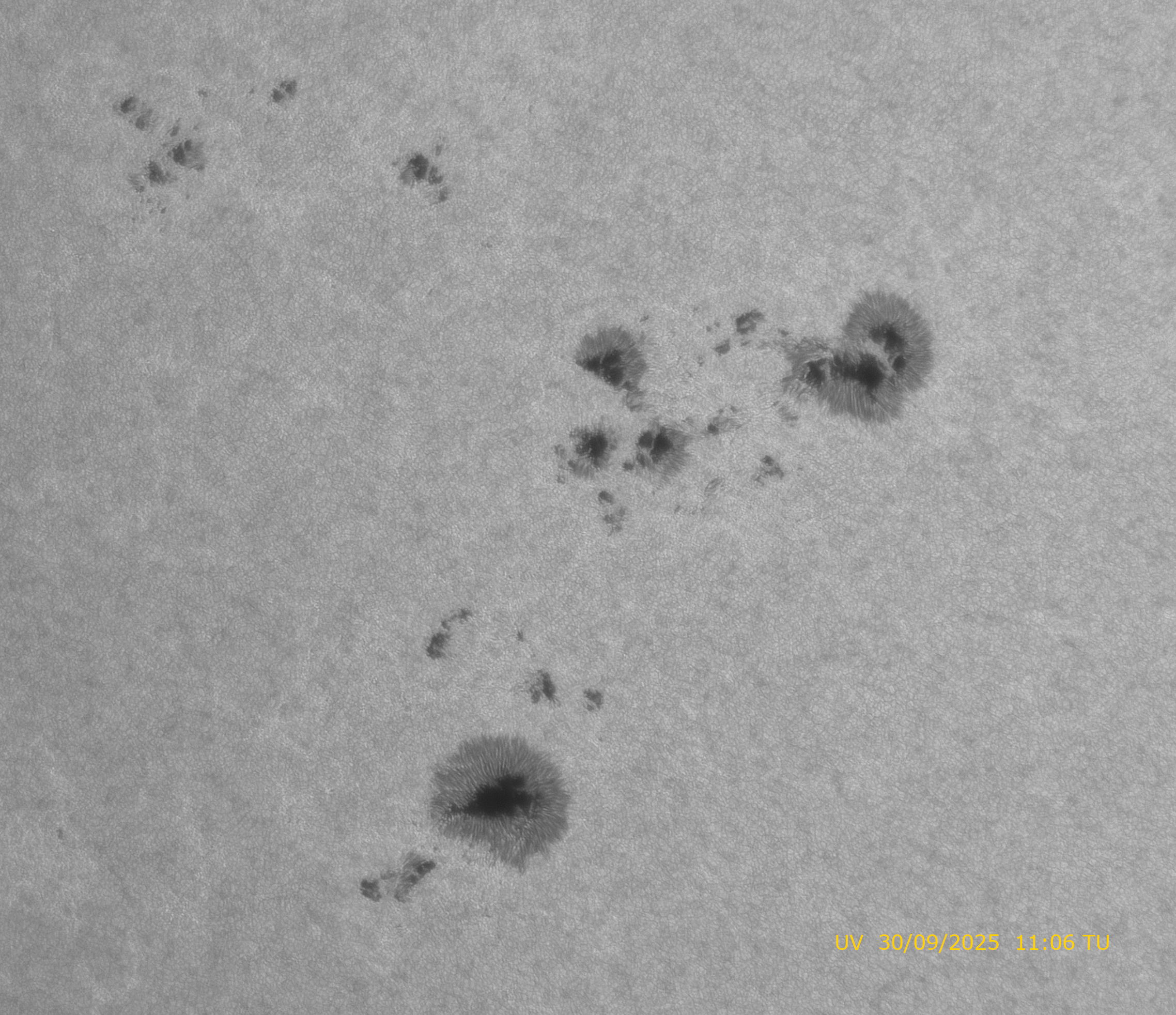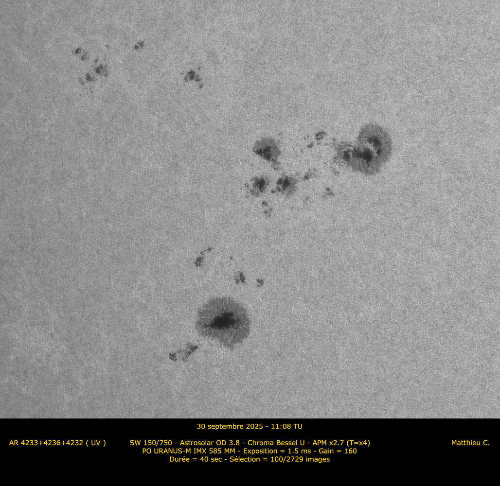 Bonjour à tous. Le seeing était couci-couça mais voici quelques photos prises il y'a deux jours en proche-UV et en Cak. L'occasion d'inaugurer l'imx 585 mm en solaire et de surveiller les grosses taches qui arrivent... -