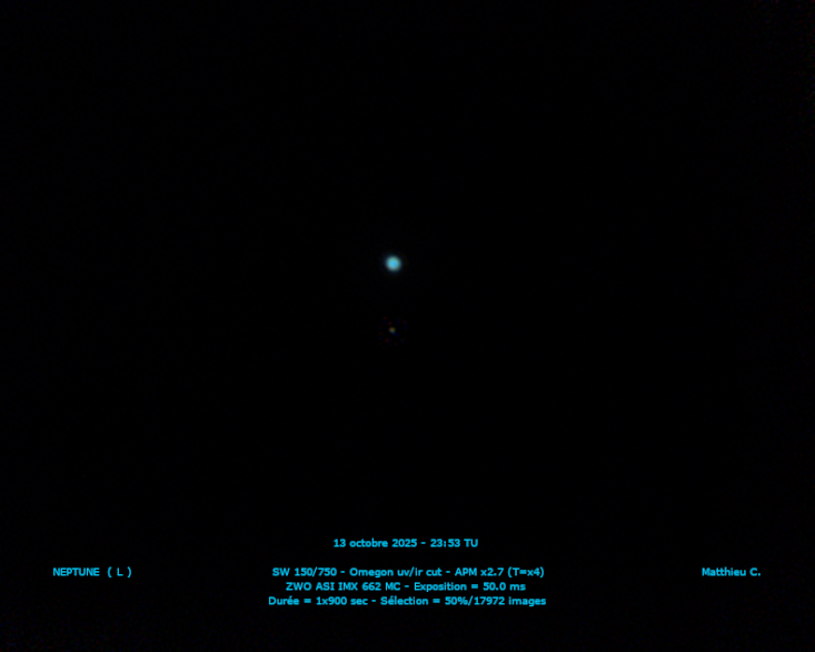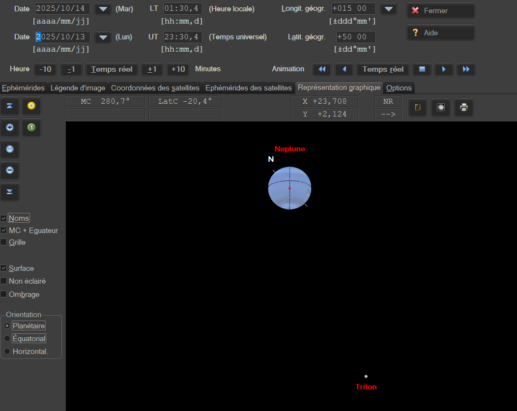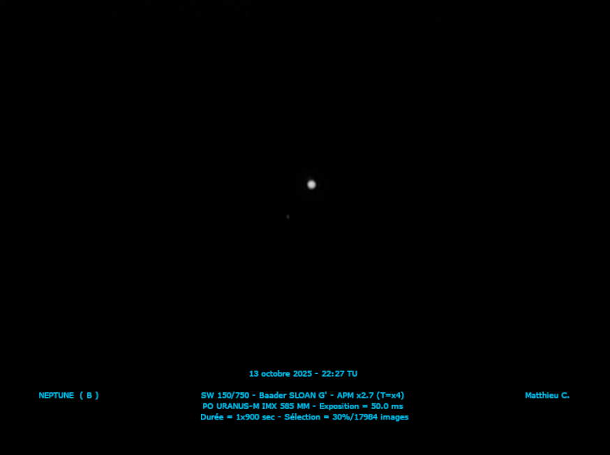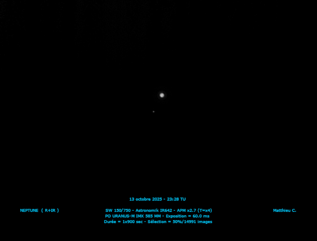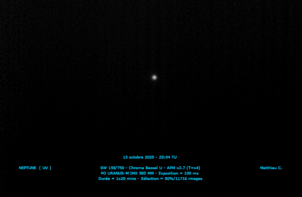 Aussitôt dit, aussitôt fait ! Le seeing n'était pas ultra favorable pour cet exercice, mais si on attend le saint-Graal, on peut courir longtemps. La transparence plutôt bonne au début s'est très légèrement dégradé au fil du temps. Mais mon ennemi principal, ce soir du 13 octobre a surtout été le vent, soufflant assez fort du N-E. Pour me mettre en jambe, j'ai commencé par le filtre G'. ( D'abord un extrait de capture vidéo comprenant les 500 premières images ) J'ai immédiatement embrayé sur l'UV. Pas simple mais l'objet est toutefois détectable visuellement sur le live pour un FPS que je qualifierai de très raisonnable entre autres grâce à la sensibilité du capteur et l'excellente transmission du flux de la barlow. ( D'abord un extrait de capture vidéo comprenant les 500 premières images brutes ) ( Puis un extrait de capture vidéo comprenant les 500 premières images, auquel j'ai augmenté de manière logicielle le gain et une réduction de bruit afin de rendre la visibilité du sujet plus confortable ) La capture a été particulièrement difficile à traiter. AS!4 n'arrivait pas à détecter le sujet et à stabiliser l'image. Et sans stabilisation, stack foiré ! En appliquant une forte réduction de bruit et une légère augmentation du gain avant l'empilement, j'ai fini par stacker l'image. Notez que Triton n'est pas détectable à la capture. L'orientation de la planète ne peut donc pas être donné avec exactitude mais elle est approximativement ( à 1 ou 2° près ? ) du même ordre que pour les images B et R+IR, étant donné que je n'ai "presque" pas modifié la mise en place de la caméra dans le PO. On continue avec de l'IR. L'effet Gibbs est bien visible. C'est bon signe ! A la fois de bon seeing et de bonne collim'... De nuances, il faut d'abord savoir que le point sombre central n'est pas un vrai détail mais l'effet Gibbs. Ensuite, j'ai l'impression que le pole Sud semble un peu plus clair que le reste du globe. Bon, c'est hyper subtil et je peux me tromper mais c'est compatible avec un retour de l'activité nuageuse IR aux latitudes tempérées sud consécutif à l'activité solaire. Et enfin, une couleur. Malheureusement, la dispersion reste forte sans ADC et les couches vertes et bleues bavent l'une sur l'autre... A titre indicatif, l'orientation planétaire sous Winjupos grâce à la position de Triton.