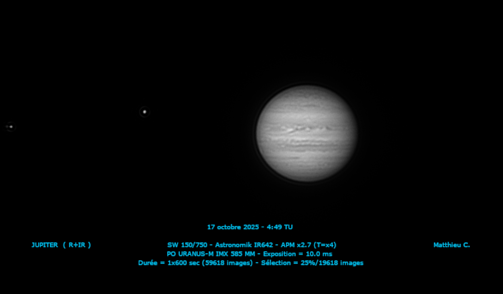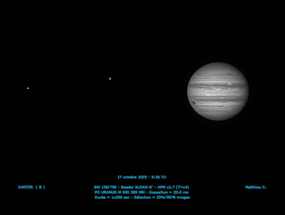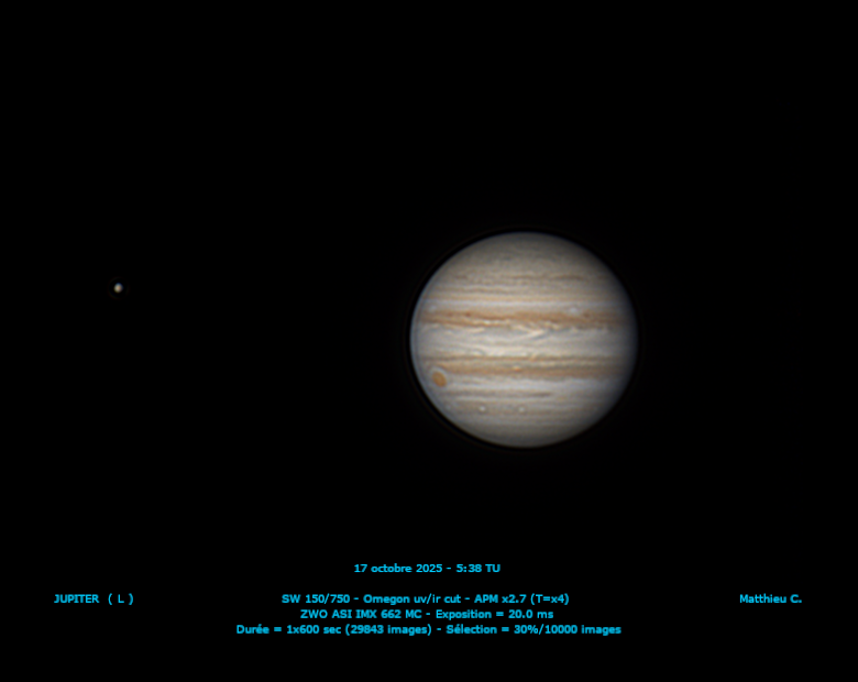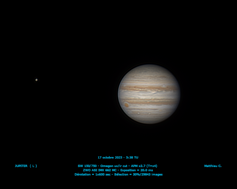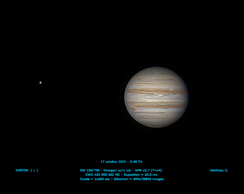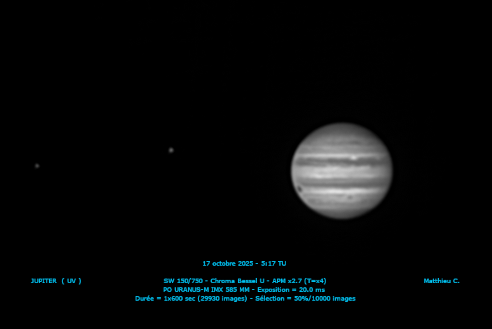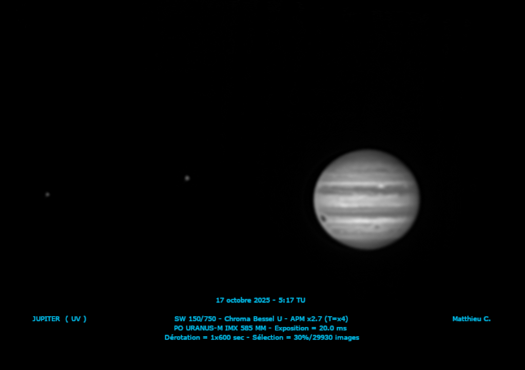 Mes images du 17 octobre au petit matin, par un ciel bien dégagé, une faible brume de basse couche et un petit vent d'est de circonstance dans ce contexte anticyclonique. Je ne suis pas un fana de la dérotation mais, une fois n'est pas coutume, j'en ai fais sur des séquences de 10 mins que je mets en comparaison avec des extraits bio issus de ces mêmes séquences. Les conditions n'étant pas mauvaises ( ça s'est nettement amélioré à partir du moment où j'ai attaqué le bleu ), le résultat dérotatif surpasse très légèrement le bio au global. Mais pas de quoi m'inviter à en faire plus souvent, quoique... j'en dis pas plus pour le moment... Allez, ces images !... Remarquez que l'Oval BA est au passage du méridien central. Et, en effet, l'UV montre clairement un rougissement de la structure. On est loin du contraste offert par le GTR mais c'est intéressant. La bleue, plutôt sympa, démontre là encore, la fin de la phase d'expansion de la NEB et le début de son retrait au profit de la NTrZ de par l'éclaircissement de sa partie nord. Enfin, la L, en 3 versions. Une première empilée et traitée dans la masse, histoire de montrer que 10 mins, en bio, c'est beaucoup trop même avec un 150. Une seconde, extrayant 3 mins de vidéo en bio. Et la dernière, dérotée.