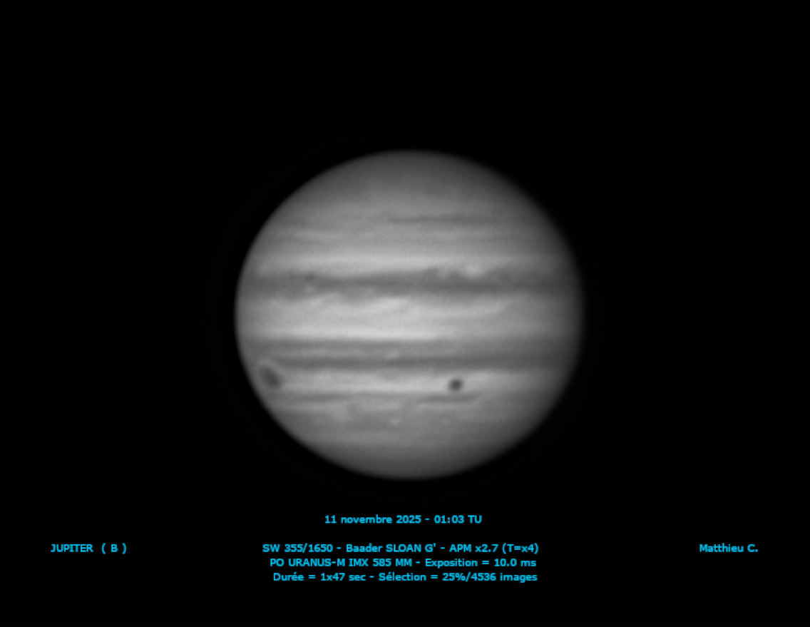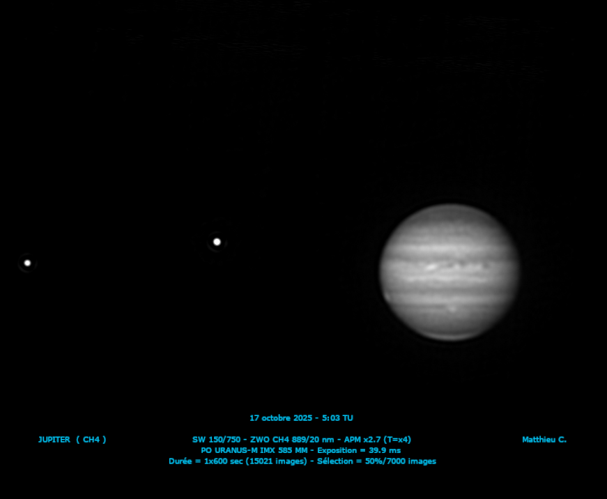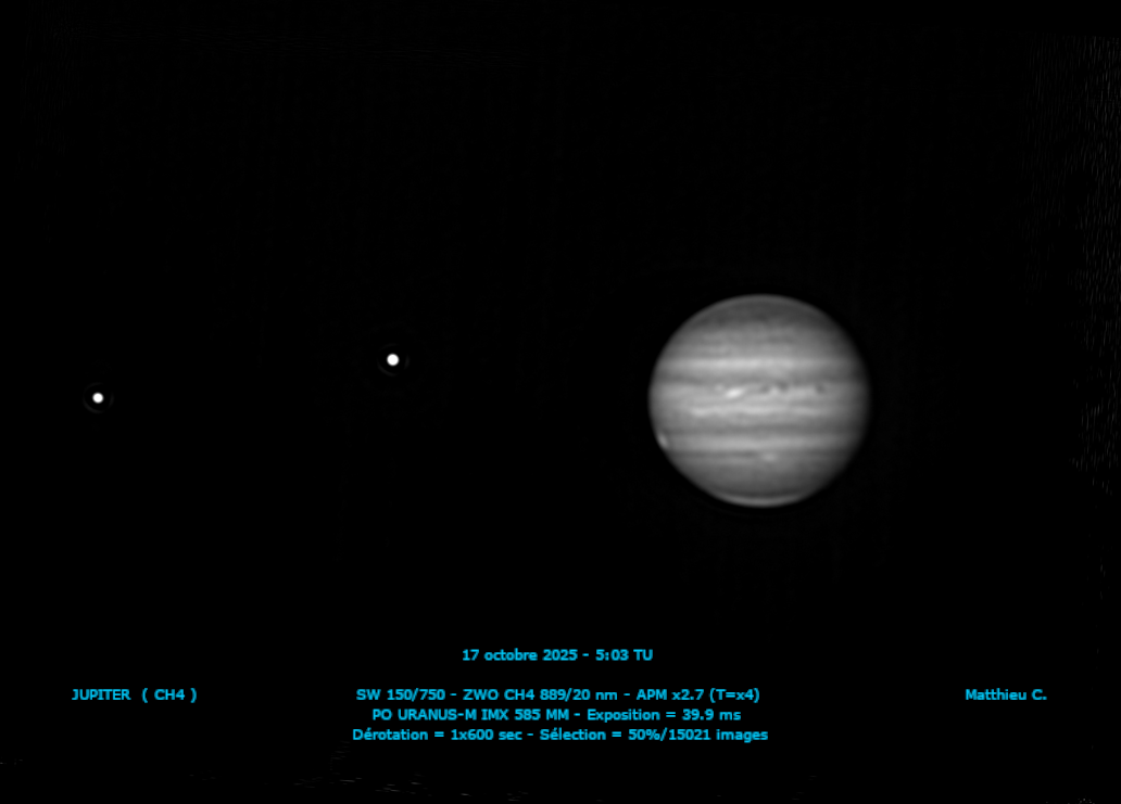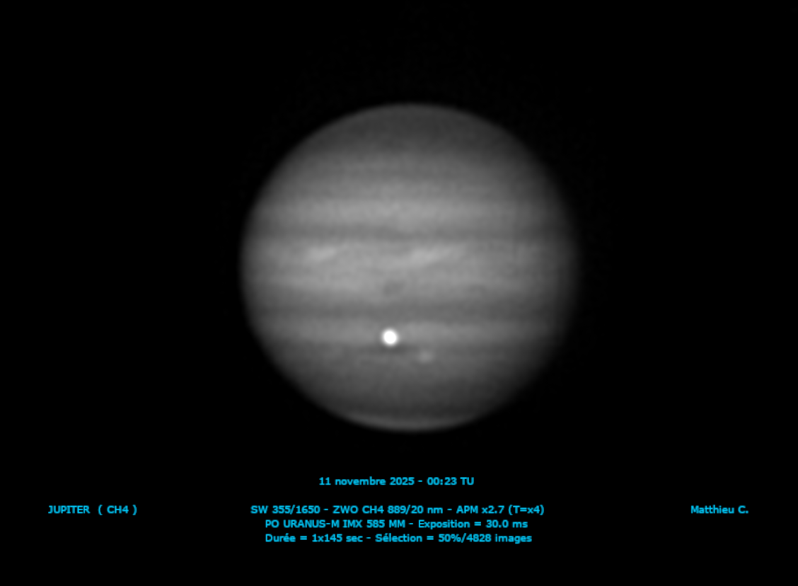 Merci. En fait, le phénomène est très intéressant et tu fais bien de le relever. Ce disque brillant en CH4 correspond exactement au disque sombre visible sur les images bleu et proche infrarouge. Il s’agit du disque même de Ganymède passant devant Jupiter ( et non pas son ombre projeté, passé quelques heures auparavant ). Et il se trouve que si, effectivement, le globe de Ganymède est naturellement plus sombre que celui de Jupiter ( d’où le spot sombre dans les continuum bleu et infrarouge ), il n’en reste pas moins beaucoup plus brillant que celui de Jupiter dans la bande méthane, car on oublie pas que Ganymède n’a pas d’atmosphère contenant du méthane pour absorber elle aussi la lumière à la bande de 889 nm. Ceci étant dit, la seconde petite tache claire mais beaucoup plus discrète, en méthane, en dessous à droite de Ganymède, se trouve être l’Oval BA, le deuxième plus gros anticyclone jovien après la GTR. Sa clarté supérieure au reste du globe jovien provient du fait que la structure nuageuse se développe à une altitude supérieure dans l’atmosphère que la plupart des bandes de la planète. Proportionnellement, moins de méthane la surplombant, l’effet d’absorption est moins élevée et elle apparaît plus claire. Mais l’Oval BA apparaît à l’inverse plus sombre dans le continuum bleu ( encore plus marquée dans l’UV ) à cause de constituants chimiques lui donnant une couleur naturelle rouge dans le visible ( le rouge vu à travers un filtre bleu ou ultraviolet apparaît très sombre ). -