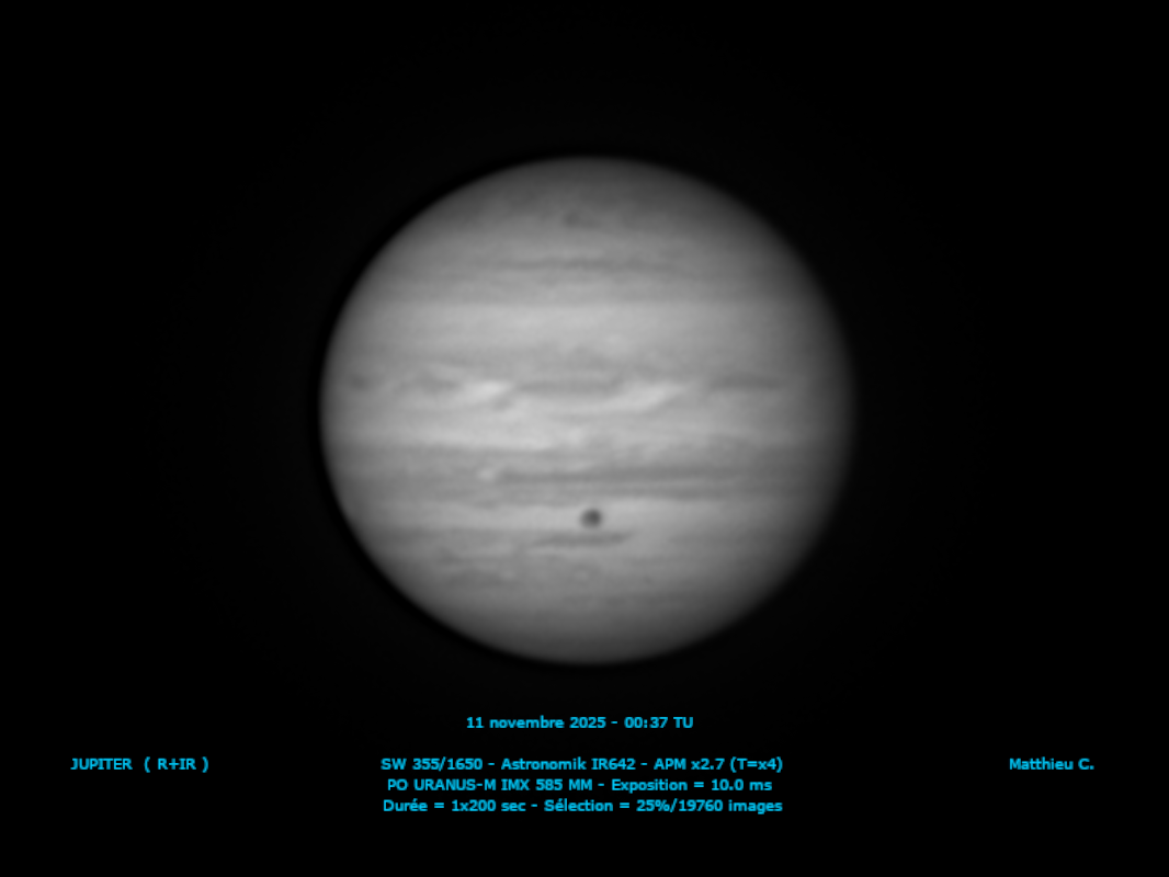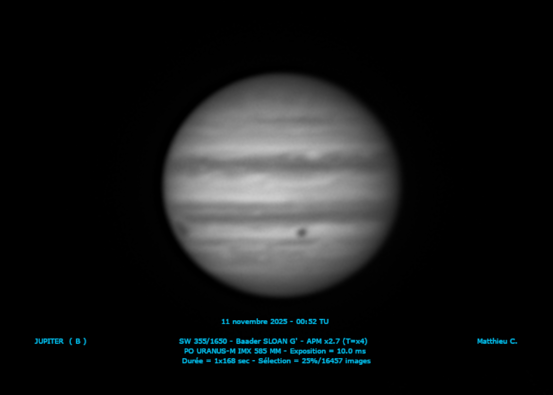 Des conditions un peu meilleures que la dernière fois dans cette nuit du lundi 10 au mardi 11. Le seeing était encore très moyen et la transparence plutôt mauvaise. La chance ne me sourit pas pour l'instant puisque le jet-stream semble plus ou moins stagner au-dessus du nord-ouest de la France depuis maintenant plusieurs semaines... Ca me déprime un peu quand je vois qu'à peine quelques centaines de km plus au sud-est, tout semble beaucoup plus calme. Mais patience et longueur de temps sont vertues... Enfin... je continue de m'éclater en visuel parallèlement et c'est ce qui compte... Ceci dit, j'ai résous quelques problèmes de suivi mais j'ai toutefois un point d'inquiétude ( entre autres... ). A plusieurs reprises cette-nuit-là et pendant ma session photo, ma raquette SynScan a planté. Peu importe la touche appuyée, la commande ne répondait plus. Dans ce contexte, impossible de corriger les petites dérives de la monture. et même en coupant le jus et en réinitialisant le goto, quelques minutes après, la raquette plantait à nouveau. J'ai fini ma session d'images sur Jupiter en corrigeant la dérive manuellement après débrayage des moteurs. J'ai actuellement la version 6 de SynScan, la dernière semble-t-il, et je me demande si cette version ne serait pas buguée. Sans quoi, je ne vois pas ce qui pourrait planter le zarba... PS; Sur la version 4 de l'HEQ-5, je n'ai jamais eu ce problème. Dcp ça ne me donne pas envie de la mettre à jour. Si quelqu'un connaît ce prblm, je suis preneur. Merci... -