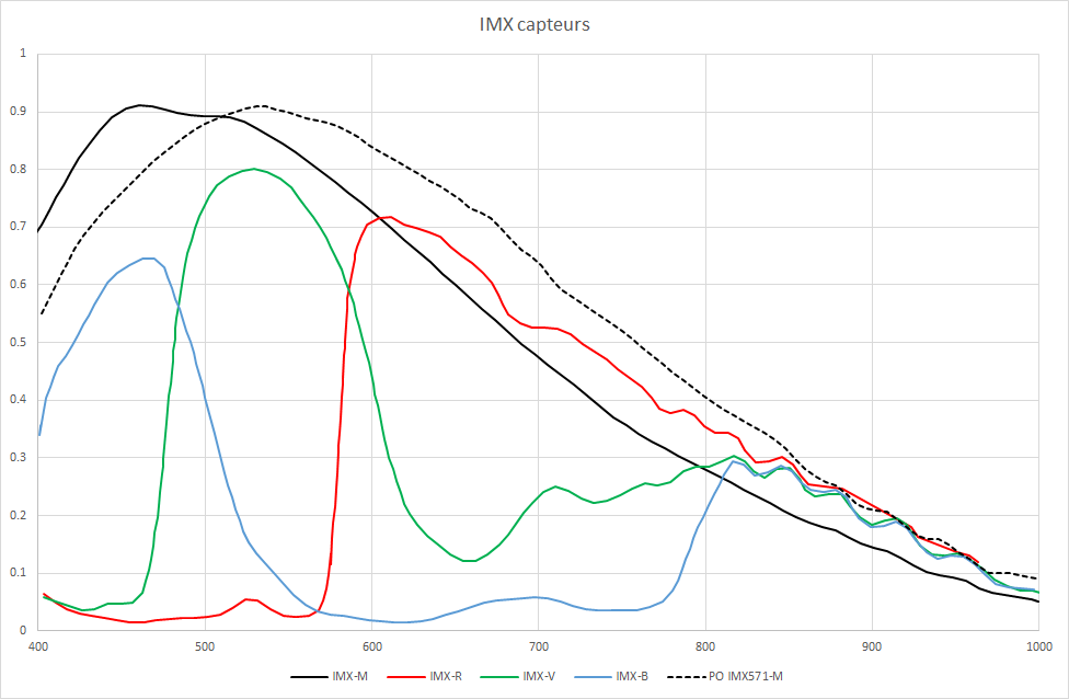 Bonjour dans le cadre d'une réflexion sur l'évolution de ma configuration, j'ai voulu regarder la différence de sensibilité entre les capteurs couleurs et mono de la famille IMX 571/533. A priori on a les mêmes photosites entre ces 2 senseurs, la seule différence entre les versions mono et couleur venant du rajout de filtres couleurs sur les photosites, ce qui entraine une perte de sensibilité d'environ 10% entre les deux versions. On trouve sur les différents sites des fabricants des courbes de sensibilité couleurs et mono qui sont cohérentes entre elles, sauf pour les caméras Zeus et Poseidon de Player One en version Mono qui présente une autre courbe de sensibilité. En concaténant les différentes courbes (j'ai repris les courbes du module spectrophotométrie de SIRIL) j'ai constaté, ce que j'interprète comme une incohérence, des différences notables entre les courbes de sensibilité mono et couleur : Mono : pic à 450 nm dans le bleu - Couleurs : pic à 540 nm dans le vert. La courbe mono a moins de sensibilité que la version couleur au delà de 600 nm, ce qui est physiquement impossible sauf à avoir des différences technologiques dans les photosites entre les 2 capteurs, or c'est la même technologie STARVIS. En Ha, la caméra couleur aurait une meilleure sensibilité que la caméra N/B !!! Par contre sur le site de Player One, si la courbes IMX 533 est la même qu'ailleurs (https://player-one-astronomy.com/product/ares-m-pro-usb3-0-mono-camera-imx533/), la courbe de l'IMX 571 est différente (https://player-one-astronomy.com/product/poseidon-m-pro-imx571-usb3-0-mono-cooled-camera/) et me semble-t-il cohérente des courbes couleurs avec un pic à 540 nm et une sensibilité dans l'IR comme attendu, au-delà des 800 nm ces filtres devenant quasiment transparents, donc on doit avoir la même sensibilité entre couleur et mono (cf. courbe de l'IMX 585C). Est-ce vous partagez mes interrogations quant à la crédibilité de la courbe de sensibilité IMX mono communément annoncée pour la famille des capteur IMX571/455/533? La courbe PO ne serait-elle pas la bonne en fait? Quelqu'un aurait eu l'occasion de mesurer la sensibilité des capteurs IMX mono qui confirmerait la courbe fournie par PO pour le capteur IMX 571/533?