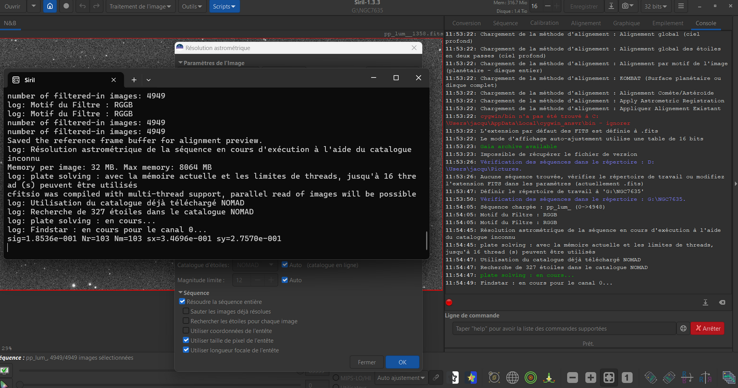 Pour une séquence de 30/50 images en imagerie classique je n'en doute pas, mais pour une séquence de 5000 images en lucky imaging, la rapidité de Siril ayant tout son intérêt dans cette situation, c'est plus tout à fait pareil ... Le besoin serait juste au niveau de la fenêtre de l'IHM. Surtout qu'on ne voit pas d'indicateur d'avancement du traitement, la roue tourne mais on ne sait pas si ça avance normalement ou si c'est en boucle. J'ai lancé la procédure à 11h54, j'ai arrêté à 12h08, aucune évolution. Il y a peut-être un problème avec cette fonctionnalité sur une séquence? Je peux déposer un sujet sur Gitlab si besoin. -