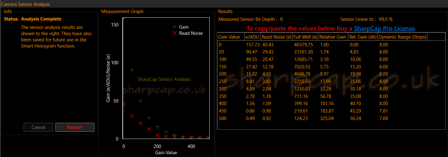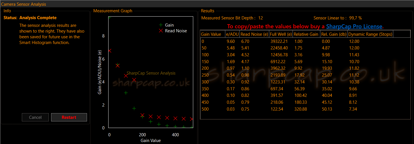 Bonjour J'ai une séquence d'images de 2s prises avec une caméra non refroidie à la température de 30C au gain 300 offset 30. A cette température, le capteur est supposé générer un signal thermique de 0.52e/pix/s. Au gain de 300, on a un coefficient de 0.3e/ADU. Donc le signal de courant d'obscurité théorique devrait être de 3,5 ADU. J'ai généré : - un superbiais (SB) à partir de 4000 images, donc ne reste que les défauts inhérents au capteur et plus aucun bruit. - une image du courant d’obscurité (CO) en remplissant une image avec un niveau fixe de x ADU. - un MasterFlat (MF). Statistique image de départ : statistique superbiais : Lors du prétraitement, je coche la case optimisation du noir, donc sauf erreur de ma part, SIRIL réalise l'opération : (brut - SB- k*CO)/MF, le coefficient k étant optimisé en fonction du bruit dans chaque image. En faisant varier le niveau de départ du courant d'obscurité, toutes choses étant égales par ailleurs, on obtient des coefficient k assez différents et des évaluations variables du niveau de courant d'obscurité, que je n'arrive pas à m'expliquer, à moins que je paramètre mal la fonction : x = 1 ADU --> k = 1 --> CO = 1 ADU x = 2 ADU --> k = 1 --> CO = 1 ADU x = 3 ADU --> k = 1,729 --> CO = 5,2 ADU x = 3,46 ADU --> k = 0.95 --> CO = 3,3 ADU x = 4 ADU --> k = 1,712 --> CO = 6,9 ADU x = 4,5 ADU --> k = 1,237 --> CO = 5,6 ADU x = 5 ADU --> k = 0,766 --> CO = 3,8 ADU x = 5,5 ADU --> k = 1,281 --> CO = 6,4 ADU x = 6 ADU --> k = 0,833 --> CO = 5 ADU x >6 ADU --> k = 1 Cdt Jacques