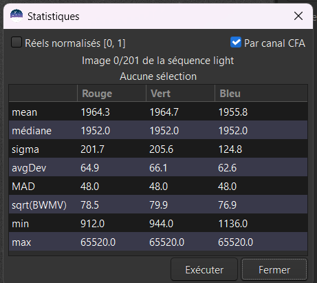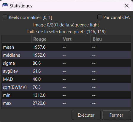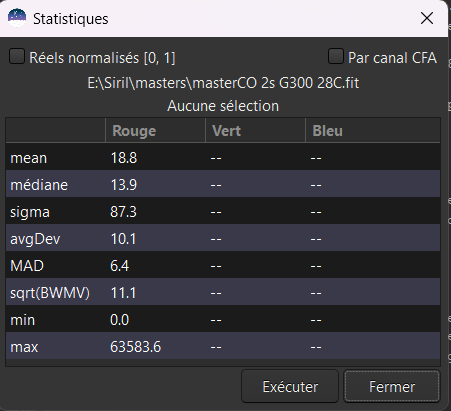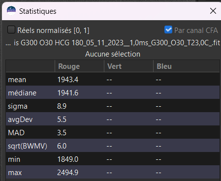 J'ai refais le traitement avec 101 darks, SB ôtés, cette fois-ci j'obtiens systématiquement un coefficient d’optimisation de 0.002. L'image initiale a ce type de statistique (30C) sur une zone restreinte sans étoiles : et pour l'ensemble de l'image du courant obscurité : ce coefficient de 0.002 annule quasiment tout l'effet de prise en compte de correction de dark (?). Cdt Jacques -