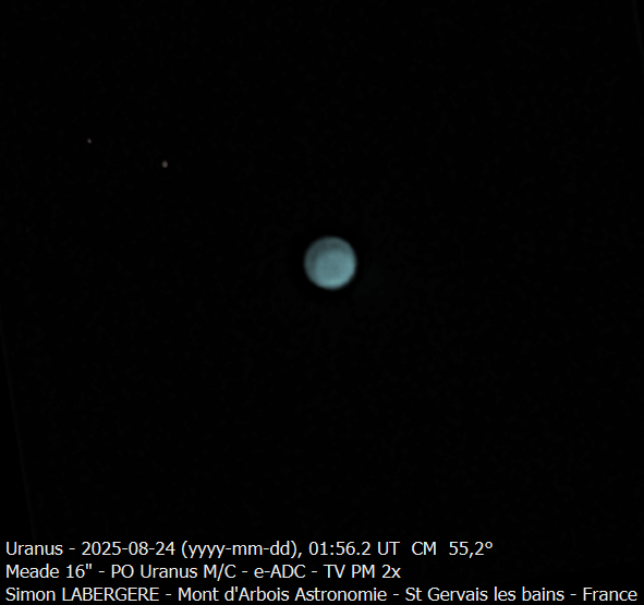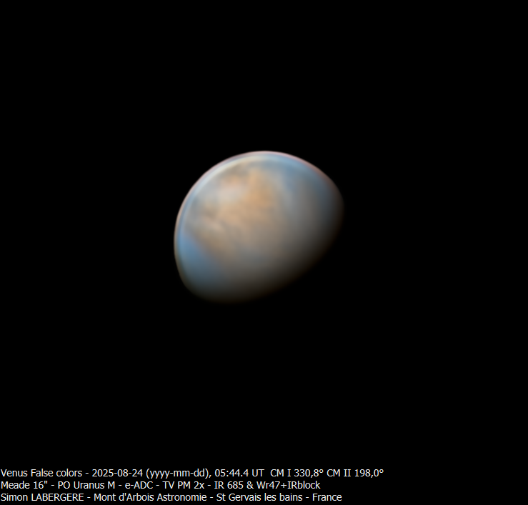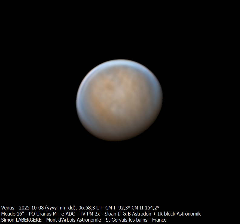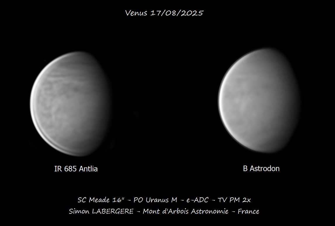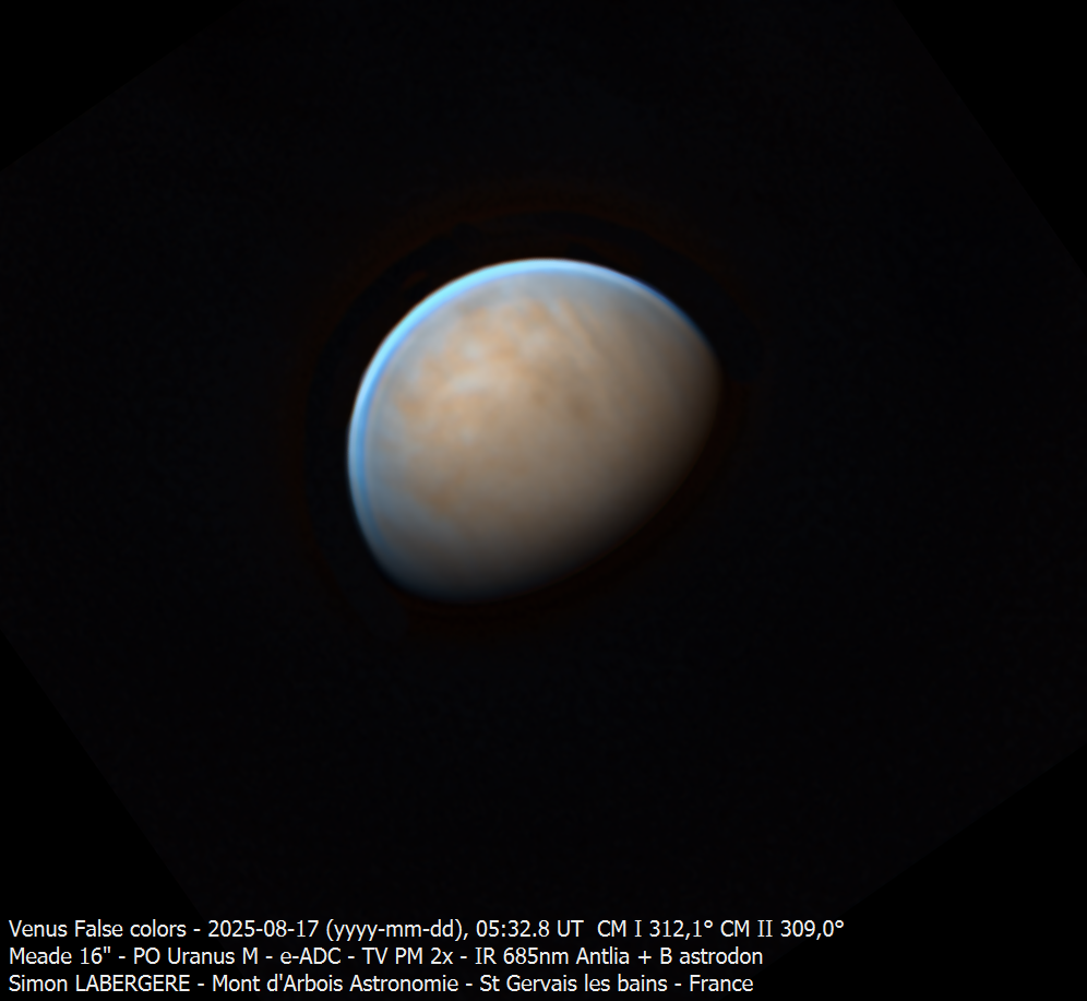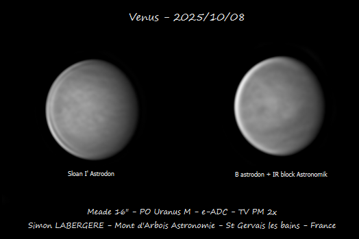 13. Bonsoir à tous, J'ai mis un peu de temps à traiter, mais vu le volume de données et mes obligations professionelles, je n'avais pas le choix Je suis donc monté, la nuit du 9 au 10, à l'observatoire du mont d'arbois. Des conditions exceptionnelles étaient annoncées avec un jet stream de 10 ms..... et une fois encore j'ai dejanté, avec une turbu assez prononcée.... mais moindre que d'habitude cette saison J'ai donc commencé avec neptune, pour le fun, que l'on voit avec son satellite Triton Puis je suis allé sur Saturne Voici le seeing sur l'une des meilleures captures en monochrome J'ai fait 19x4min en couleur et monochrome. Voici la dérotation couleur sur 80 min, entre la 1ere et la dernière capture. Puis la dérotation Monochrome Et l'image finale en L+couleur Je suis ensuite passé sur Uranus, imagée ici en monchrome + filtre IR 685nm, permettant de reveler des détails sur le globe Puis j'ai été faire notre belle jupiter, elle est toujours très basse et très loin, mais le seeing étant meilleur que la dernière fois, cela permet un meilleur rendu. Puis au petit matin j'ai terminé par venus que j'ai imagé pendant 2h en monochrome en alternant filtre IR 685nm et B astrodon. En quelques chiffres cela donne ça http://www.astrosurf.com/uploads/emoticons/tongue.png : - fichier unitaire de 230k images et 90go en moyenne - 5 ser en IR et 4 en B - 1 to de données - 10h de stacking Voici donc le résultat en pratiquant une dérotation par filtre. Et l'image finale en fausses couleurs IR+B Cerise sur le gateau, avoir imagé venus sur une durée de 2h permet de mettre en évidence les mouvements de son atmosphère Voici l'animation en IR ...Et en B Voila, c'est tout pour aujourd'hui, en esperant que cela vous plaise Bon ciel à tous