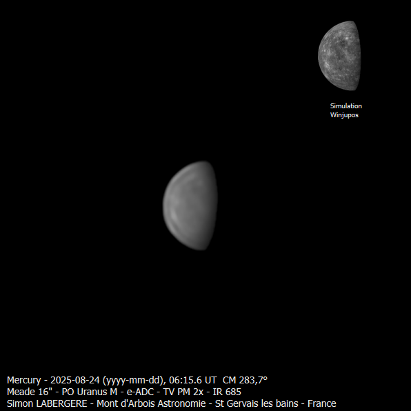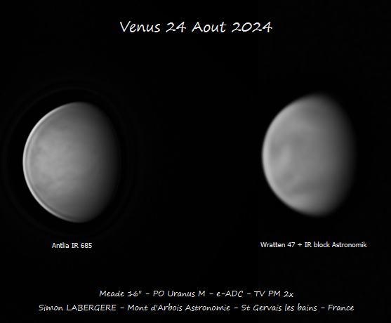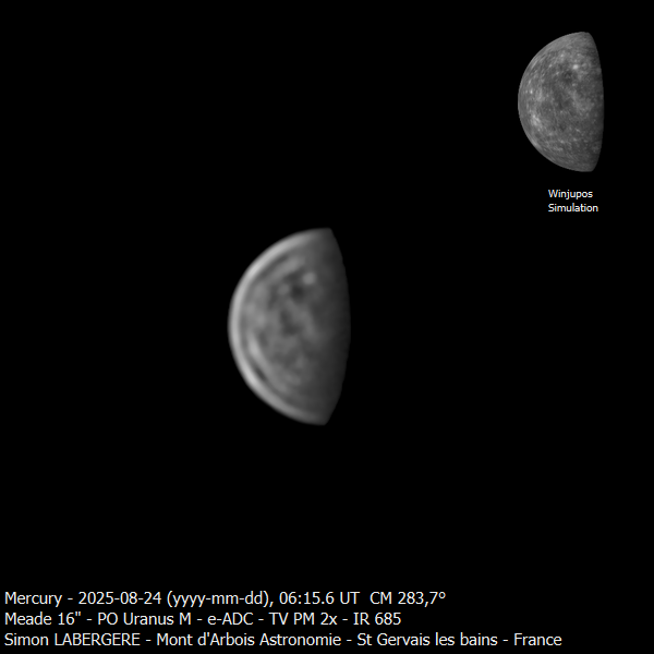 9. Bonsoir, Je mets toujours autant de temps à traiter mes acquisitions Voici la moisson de la nuit du 23 au 24 à l'observatoire du mont d'arbois sur le SC meade 400mm Le seeing était très moyen avec des passages nuageux.... On commence par saturne, avec le transit de thétys et son ombre une seule séquence rescapée des nuages: 2x couleur/4x mono/2x couleur, 240sec unitaire Puis voici Uranus, avec 2 de ses lunes, Ariel et Umbriel Une seule capture en IR685 et fausses couleurs Puis Jupiter avec le transit de Ganymede. Puis Vénus En IR et Proche UV WR47+IR block Et la fausse couleurs Et pour finir j'ai été voir du coté de Mercure Imagerie en Mono + IR 685 La voici en version soft ...Et en version beaucoup plus accentuée. Vous noterez la correspondance avec la simulation Winjupos Et voila c'est tout pour aujourd'hui, bon ciel à tous