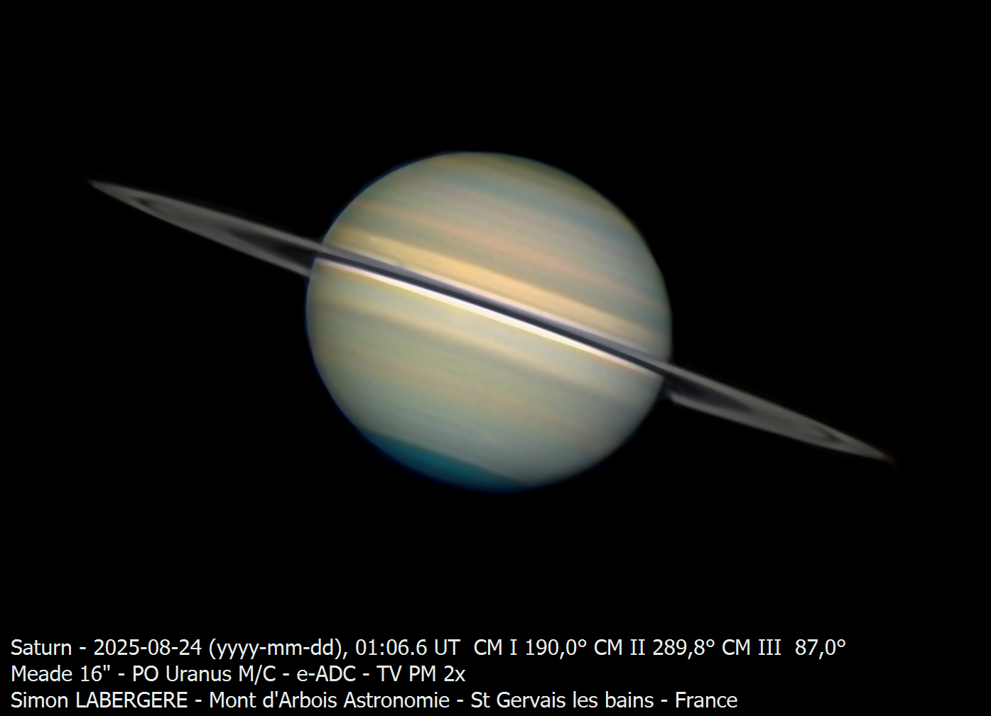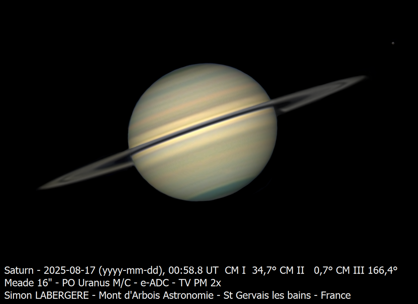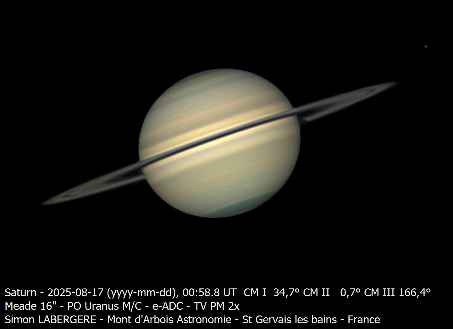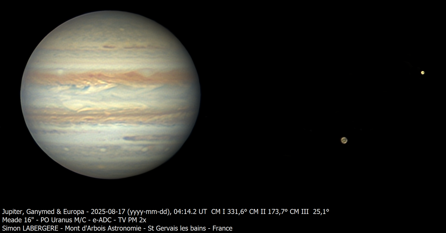 8. Bonsoir à tous, Il m'aura fallu 1 semaine pour traiter les 4 TO de données acquises lors des 3 jours que j'ai passé à l'observatoire du mont d'arbois. J'y suis en effet monté de mercredi à samedi de la semaine dernière Le seeing à été très fluctuant avec de très bons moments, comme d'autres ou la turbu était telle qu'il était impossible d'imager quoi que ce soit... On commence donc par saturne, la 1ere nuit de nombreux passages nuageux et un voile persistant m'on empéché de l'imager convenablement, voici ici la seule rescapée, 4 captures de 240sec en IR en dérotation La 2e nuit était excellente sur Saturne ce qui m'a permis de l'imager pendant 3h sans discontinuer, en L. Voici l'imge finale, on notera la présence de 2 spots dans l'hémisphère sud (image inversée) Voici les 3h en animation http://www.astrosurf.com/uploads/emoticons/smile.png Et les projections polaires avec le fameux décagone Pour Jupiter, la 1ere nuit a été la meilleure, après que le voile nuageux se soit complètement dissipé. Voici jupiter et ganymede Et un peu plus tard le couché de ganymède derrière jupiter Et voici l'animation qui en découle, entre 5h15 et 7h15 La 3e nuit la turbu s'est un peu calmée suffisament afin que je capture le double transit de io et europe ainsi que l'ombre de Io http://www.astrosurf.com/uploads/emoticons/smile.png Pour venus, ces 3 jours ont ét"é marqués par l'occultation avec la lune, que j'ai réussi à prendre, à 8m de focale. En raison de l'écart de luminosité entre les 2 astres, j'ai imagé la lune quelques minutes avant l'occultation, on a donc une composite de 2 images, prise en monochrome + IR685 Puis sur de l'imagerie plus "classique" je l'ai imagée 2 matins sur 3. Enfin, pendant que je faisais du planétaire dans la coupole, mon téléscope, un sharpstar 150/420, shootait en ciel profond Voici l'ame en SHO Filtre idas NBZ: 77x300sec Filtre askar color magic D2: 82x300sec Et parceque je voulais ni me faire ch*** avec le retournement de méridien, ni perdre du temps de pose, j'ai imagé la rosette en fin de nuit Filtre idas nbz: 17x300sec Filtre askar color magic D2: 15x300sec Matériel: Newton hypergraphe sharpstar 150/420 sur EQ6R pro Asi 2600mc pro refroidie à -10c filtres Idan NBZ & Askar color magic D2 Guidage 462mm sur TS 80/320 Acquisition nina, traitement siril & Pixinsight Pour finir voici quelques photos d'ambiance, prises par un copain, Eric Courcier, qui m'a rejoint la 2e nuit. La coupole en fisheye ...Et une marmotte qui se reveillait le matin, alors que j'allais me coucher Voila c'est tout pour aujourd'hui Bon ciel à tous