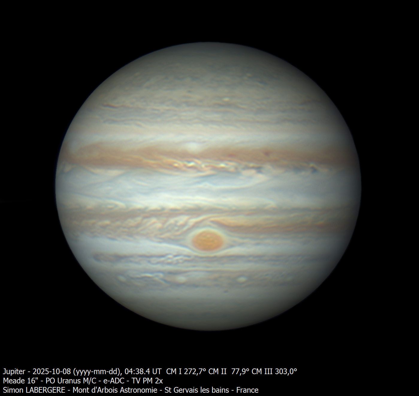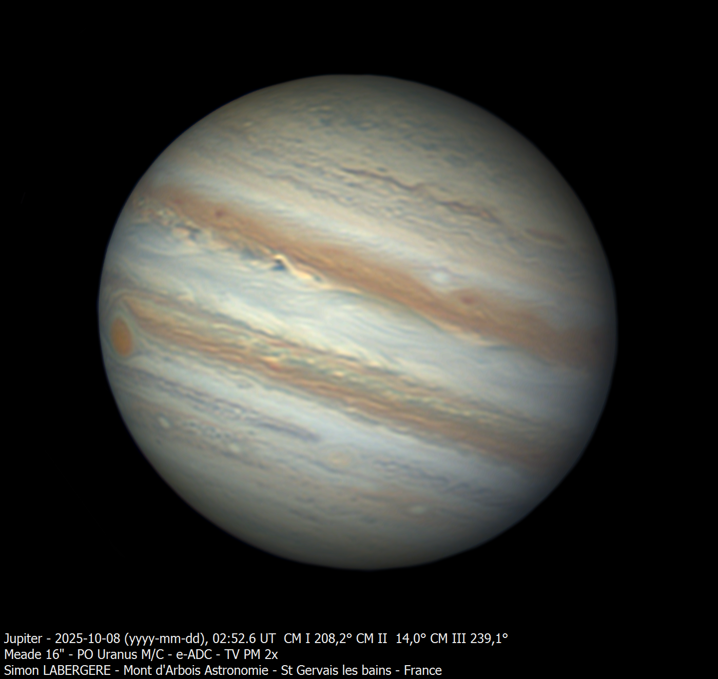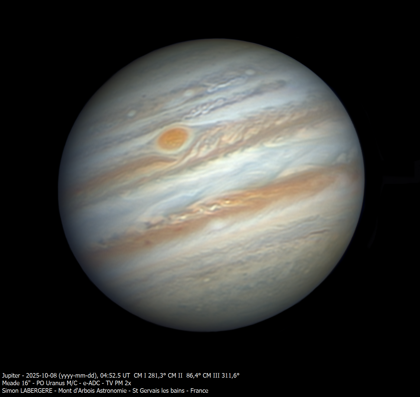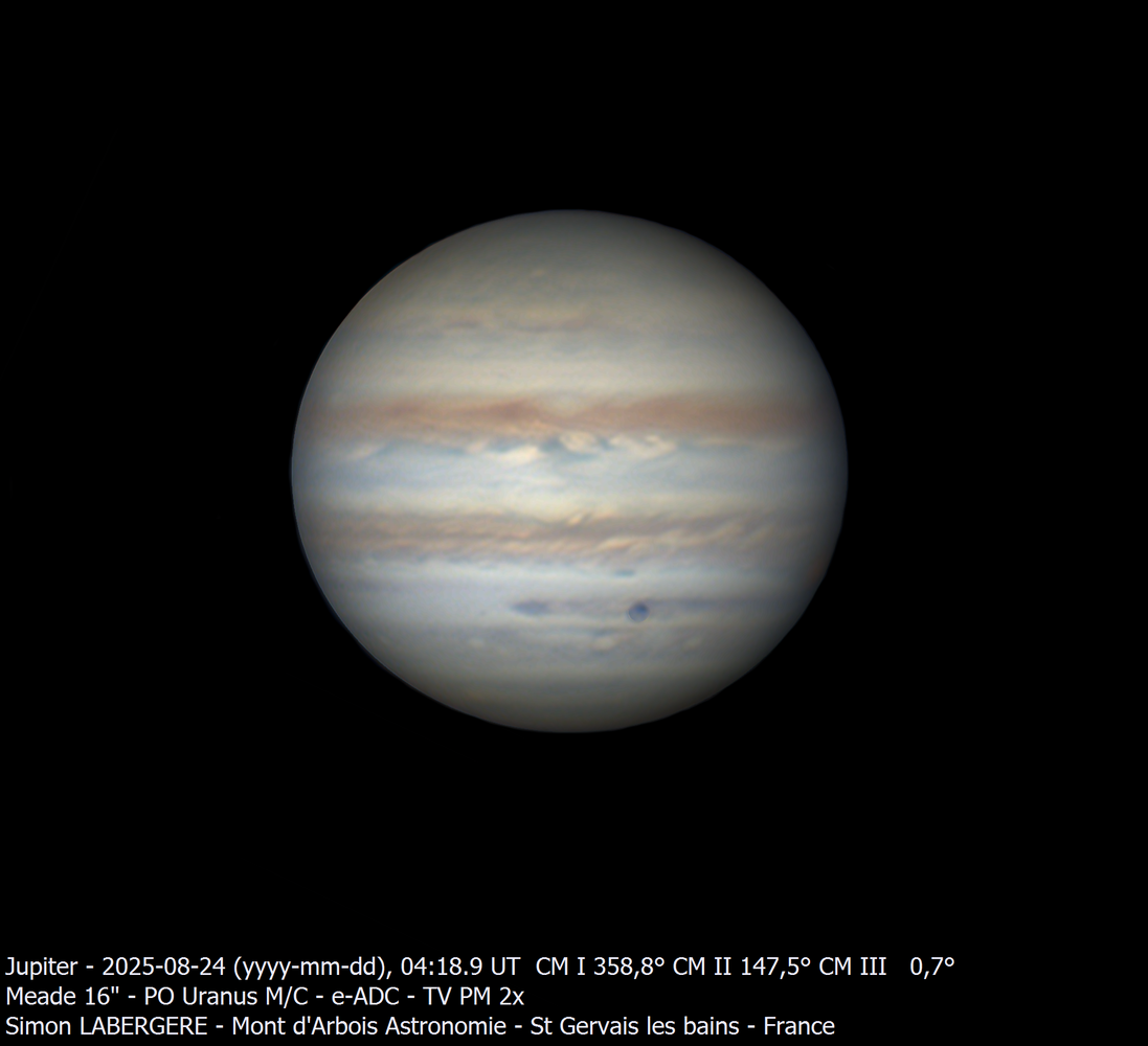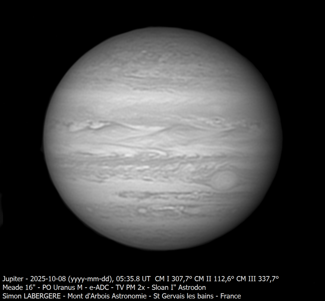 5. Je suis monté la nuit de mardi à mercredi à l'observatoire du mont d'arbois, assez tard du coup j'ai fait l'impasse sur saturne, pour me concentrer sur Jupiter, qui commence à être bien visible Le seeing était bon, voir très bon par moments. Voici les images finales ...et une dernière en filtre sloan i' L'ensemble des acquisitions m'a permis de réaliser une animation entre 4h10 et 7h20, 190 images au total en dérotation Et voici les projection planisphères et des pôles presque complètes ...Pour finir la nuit j'ai fait Vénus Et voila c'est tout pour aujourd'hui, bon ciel à tous