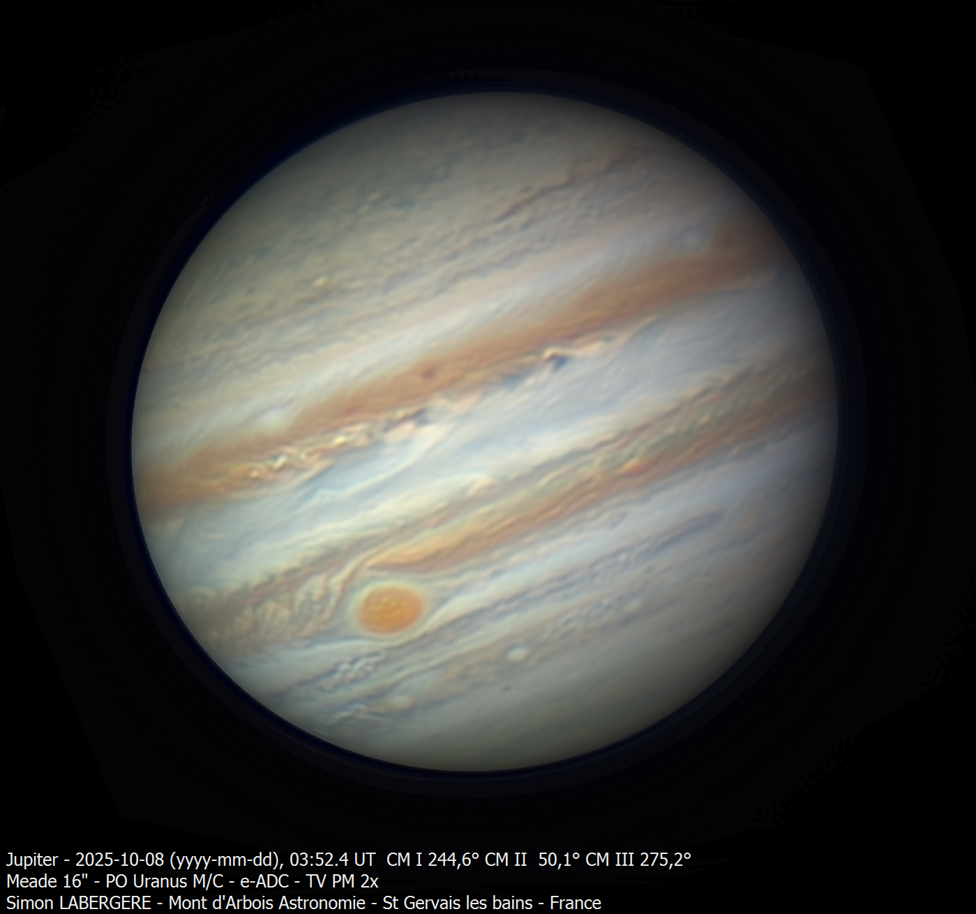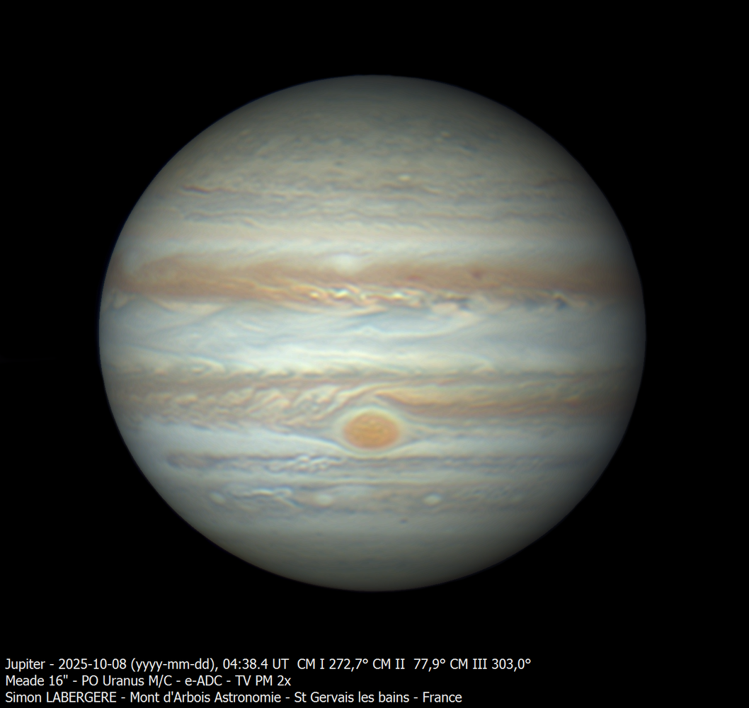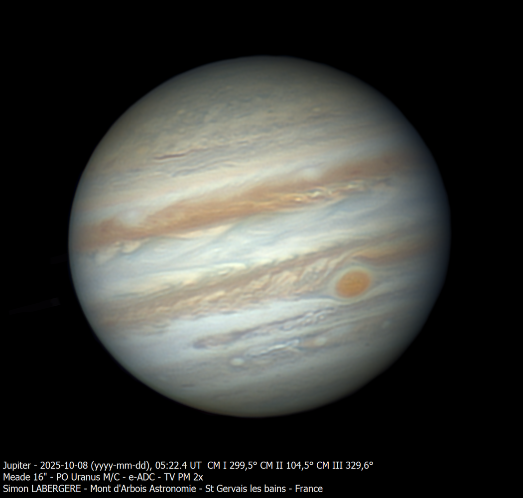 4. Bonjour à tous, Je suis monté à l'observatoire du mont d'arbois la nuit de lundi à mardi. Les conditions ont tout bonnement été superbes tout au long de la nuit Températures quasi hivernales, proches de 0c (gel le matin), turbulence faible et stable et excellente trensparence de ciel. J'ai commencé par Saturne, qui a passé l'opposition. On y voit l'ombre sur les anneaux qui est passée à gauche., Les anneaux se sont par ailleur bien refermés pour être à "l'horizontale" début novenbre. Sur la configuration on y voit Titan et thetys Voici l'animation faite avec l'ensemble des captures (trop grosse pour être mise directement sur le site): https://www.astrobin.com/full/kaljws/0/ En combinant les données acquises cette nuit, ainsi que celles obtenues le 18 septembre dernier, il est possible de générer le planisphère complet ainsi que les projections polaires complètes. lien vers le post du 18 septembre: Puis je suis passé sur Jupiter. Le seeing était tellement bon que j'ai fait de l'acquisition en LRGB Voici ensuite les images en couleur/mono/couleur Levé de Io sur Jupiter Et voici une animation de près de 3h ((trop grosse pour être mise directement sur le site) https://www.astrobin.com/full/pzqy1i/0/ En combinant les données acquises cette nuit avec celles du 8 octobre, j'ai pu sortir le planisphère complet ainsi que les projections polaires lien vers le post du 8 octobre: Et voici la rotation complète, générée via winjupos avec le planisphère Ensuite, pour m'amuser, j'ai fait quelques captures lunaires, à 8m de focale, monochrome, filtre R astrodon. Tycho et sa région Petit survol lunaire J'ai fini par Vénus En fausses couleurs: Pour finir, voici quelques photos d'ambiance au petit matin... Levé de soleil pris de la terrasse de l'observatoire Le pare brise de la voituré givré.... et ma pomme La mer de nuages en redescendant de l'observatoire: .... Voila c'est tout pouyr cette fois, en esperant que cela vous plaise. Bon ciel à tous