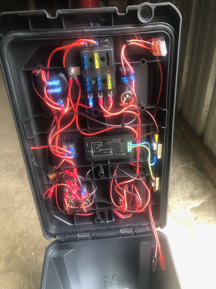 1. Bonjour à tous, Je tiens à partager ici le fruit d'un lent travail pour construire mon boîtier d'alimentation, largement inspiré des vidéos de Patriot Astro, Jordan Marlière et Astro Tuto sur le sujet. Après de longues recherches J'ai repris la même boîte à outil que Patriot Astro car : -le couvercle est amovible (simple tige en acier à retirer des charnières) et permet de travail du cablage bien à plat -la caisse permet de porter jusqu'à 30 kg de batterie (AGM de 110 Ah) , et le plastique est solide en étant facilement percable. -le couvercle est alvéolé, les interrupteurs sont donc protégés. Le circuit d'alimention (rouge) est séparé de celui de la recharge de la batterie (verte). Pour alimenter, il faut donc basculer l'interrupteur principal, puis les secondaires en fonction des besoins. Mon cable principal XLR-Power Pole me permet d'alimenter le petit boitier rouge (Hammond), qui sera fixé au téléscope pour mon alimenter ensuite ma monture (cable Power Pole-connecteur aviation GX 12), Mini PC Mele Q3 et autres instruments à venir. Il peut aussi être branché sur un boitier d'alimentation stabilisée 230/13,8 V. Le cable peut donc se brancher sur l'une ou l'autre des sources, cela évite les complications et donc les oublis. J'ai quand même rajouté d'autres prises (USB, Power Pole et XLR) en cas de besoin. Le tout necessite juste un peu de soudure pour le cablage des fiches XLR et GX12, le reste est assuré par des cosses serties.