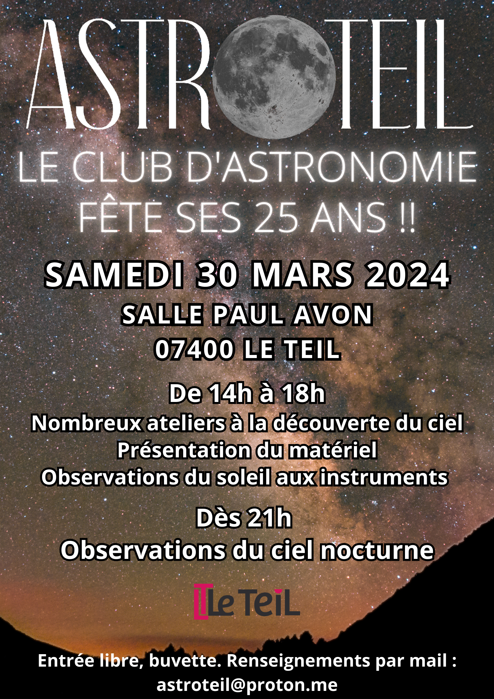 Bonjour les astronomes d'Ardèche, de Drôme et d'ailleurs ! A l'occasion de son 25e anniversaire le club d'astronomie ASTROTEIL organise une journée à la découverte des merveilles du ciel et des instruments. A partir de 21h, observation du ciel nocturne aux instruments (remplacé par une conférence en cas de mauvais temps). C'est gratuit et ouvert à tous. Nous vous attendons nombreuses et nombreux !