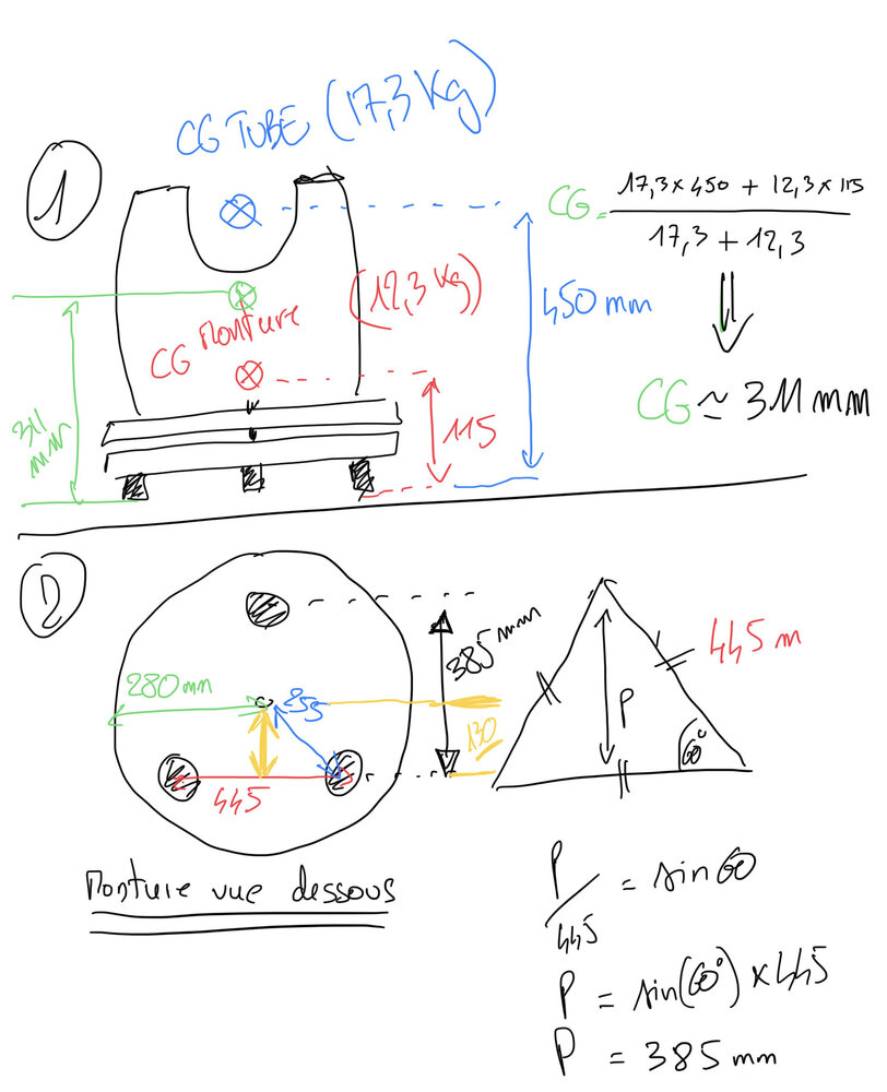 3. Bonjour Alors voila, tout nouveau sur le forum (je viens de me présenter dans la partie dédiée), je viens à vous pour partager et surtout prendre conseil pour la fabrication d'un table équatoriale destinée à accueillir un dobson meade lightbrige de 10" (254/1200mm) ... mais çà le titre vous l'apprenais déjà Pour l'instant j'en suis à fouillé le net sur tout ce que je peux trouvé sur le sujet (et ça renvoie souvent sur ce forum au final pour les francophones) et j'ai déjà quelques idées non vérrouillées sur ce que je compte faire mais si le but premier est juste d'avoir du confort visuel je me dit autant anticiper l’éventuelle suite avec un peu d'astrophoto et donc essayé de faire quelque chose de qualité. Pour la configuration j'ai pas encore fait mon choix entre secteur circulaire ou VNS pour le nord et rotule ou secteur circulaire pour le sud, le but étant de pouvoir assurer 1h de suivit si possible Pour la motorisation pareil j'hésite entre galet ou vis sans fin mais je compte utiliser du moteur pas à pas car j'ai des nema 17 d'une ancienne imprimante 3D que j'avais fabriqué à l'époque autant les récupérer Mais avant toute chose faut déjà que je calcule les dimension de tous çà et j'en suis là (voire photos) et je me pose déjà des questions: - les pieds du dobson doivent-elle idéalement se retrouver au dessus des roulement des secteurs? - le centre de gravité de l'instrument doit-il se trouvé pile sur l'axe polaire ou bien légèrement en dessous ou au dessus (pour une histoire de stabilité que j'ai pas bien saisi) ? - Comment calculer justement la taille, notamment épaisseur de la table qui va finalement conditionner à la fois le rayon et la partie utilisable du secteur (donc le temps disponible de suivit) mais doit aussi élever le centre de gravité du télescope à la bonne hauteur par rapport à l'axe polaire - enfin si quelqu'un à déjà réalisé une table pour le même type de télescope je suis preneur de son retour