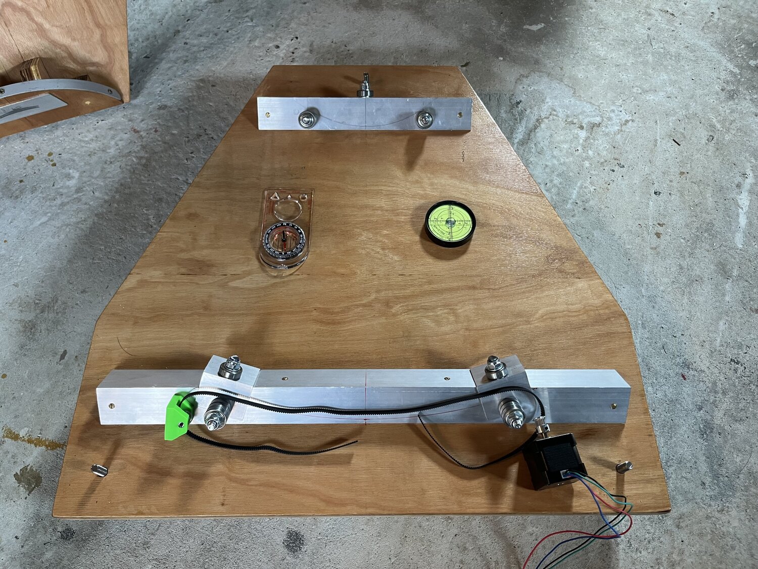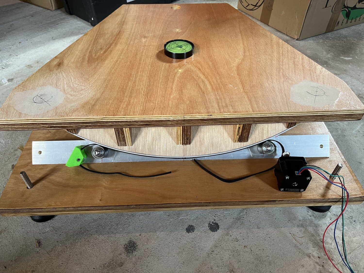 2. Rebonjour! Déterrage des sujet! Non le projet n’est pas mort mais entre un changement professionnel, plus un déménagement et les enfants à gérer c’était en stand-by sur une étagère du garage … À la faveur de l’été et du dépoussiérage du Dobson pour quelques observations estivales je me suis remis à réfléchir sur la motorisation et je pense avoir vu la lumière en faisant du tri/rangement dans le garage. En tombant sur des pièces d’une imprimante 3D HS j’ai récupéré une courroie GT2 que j’ai intercalé entre les roulements et les secteur nord. Ça semble bien faire le taf sans aucun glissement et ça permet de motoriser l’ensemble sans toucher au roulements actuels! Je projette donc de faire tourner cette courroie autour de 4 points. Les deux roulements sur lesquels repose le secteur nord, un troisième roulements sur la gauche qui pourra s’écarter grâce à une vis et ainsi régler la tension de la courroie et enfin la 4ème axe à droite qui sera une poulie sur l’axe du moteur ( il sera monté perpendiculaire au secteur sur un support imprimé 3D). Ces deux derniers axe seront plus bas par rapport aux deux roulements du secteur nord pour que la courroie en contact avec ce secteur ne frotte pas contre la partie antagoniste. Le moteur est un NEMA 17 de 200 pas/tour. Commandé avec une carte Arduino UNO via un driver TMC2208 (lui aussi récupéré de l’imprimante 3D) on peut, via un mode micro-step, obtenir 3200 pas/tour. Ensuite mon secteur nord ayant un rayon de 380mm contre 10 pour la poulie entraînant la courroie j’arrive 0,17 minutes d’angle par pas soit environ 1 pas toutes les 1,5 sonde en suivi! J’arrive pas trop à me représenter ce que ça peut donner en terme de suivi (saccadé ou pas? Suffisant pour du visuel mais de la photo?). Je suis preneur de vos avis et suggestions avant d’aller plus en avant dans cette voie 😊 Sinon j’ai rajouté des molettes imprimées 3D pour réglé les pieds et la mise à niveau du plateau le tout contrôle par un p’tit niveau à bulle circulaire et la boussole pour l’orientation. Et désolé pour les quelques erreurs que je découvre en me relisant …