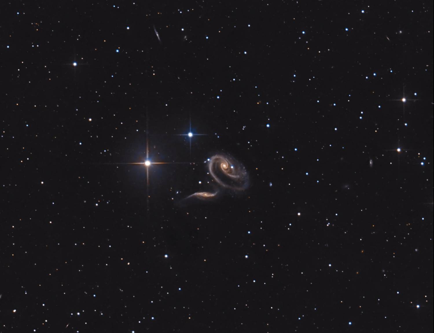 Salut, Voici la galaxie de la rose , Arp 273, prise depuis un CDK 500, en remote depuis l'espagne. Il s'agit de deux galaxies en interaction en forme de spirale situées à environ 300 millions d'années-lumière de la Terre dans la constellation d'Andromède. Elles sont situées à environ 100 000 années-lumière l'une de l'autre Arp 273 résulte d'une rencontre survenue, il y a quelques centaines de millions d'années, quand la galaxie UGC 1813 a traversé les bras extérieurs de la galaxie UGC 1810. Les bras de la grande galaxie ont été étirés par l'attraction gravitationnelle de la petite, à l'image d'une fleur qui s'épanouit. Le gaz et la poussière compressés ont alors formé des étoiles bleues, très chaudes. CDK 500 et asi 6200mm : 2 heures de luminance et 30 minutes par couche couleur. Poses de 3minutes
