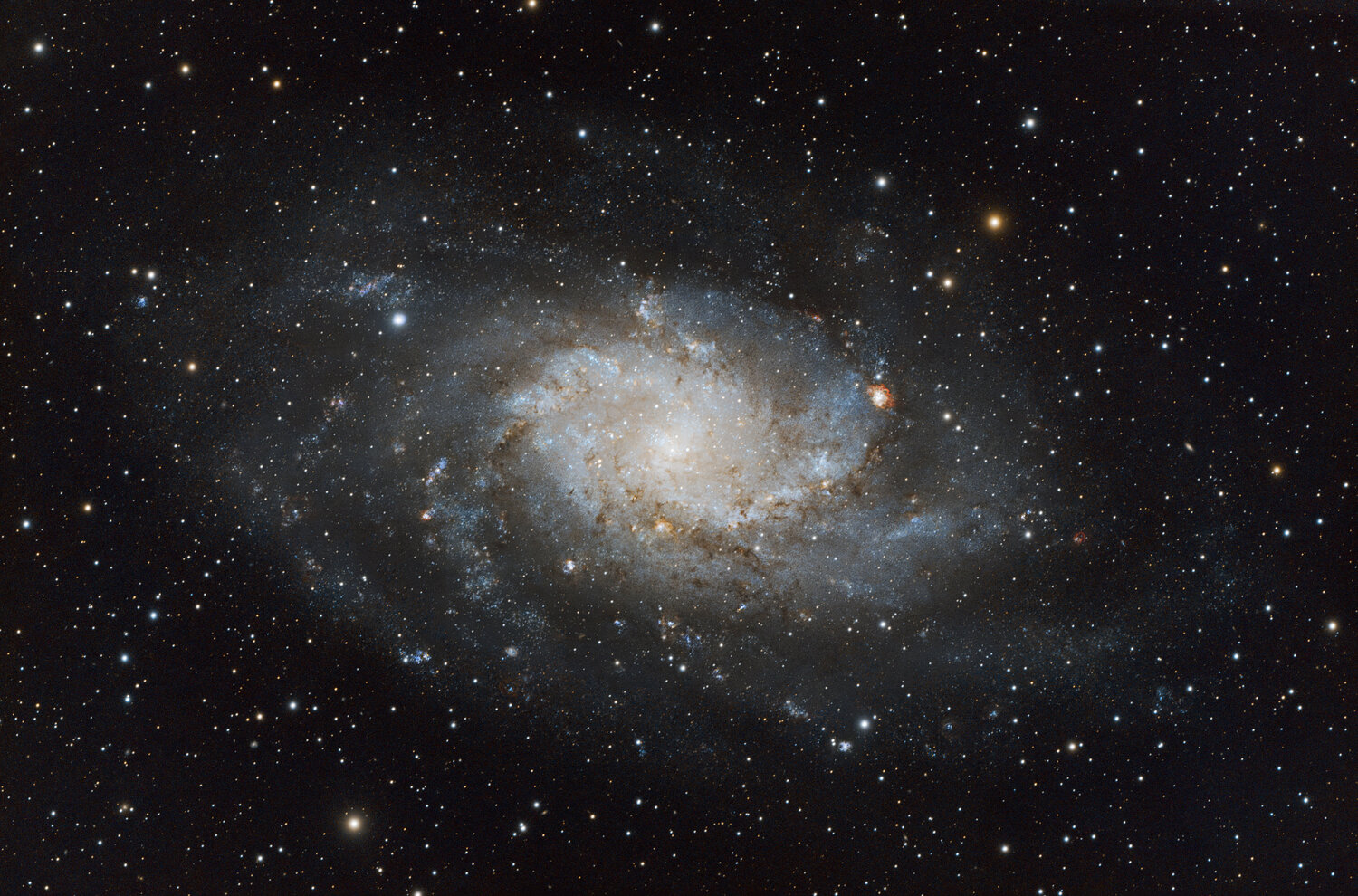 Entre les passages nuageux j'ai eu quelques "temps" de ciel clair les 31/10 et 01/11. Cela était inespéré et comme je n'avais pas réfléchi à une cible pas encore photographiée, j'ai ciblé m33. Lunette askar phq 151sur cem 70 72 x 180 s autoguidage phd2 asi 220 mini sur vario bresser 61/250 mm caméra asi 2600 mc filtre idas ngs1 traitement siril + ps