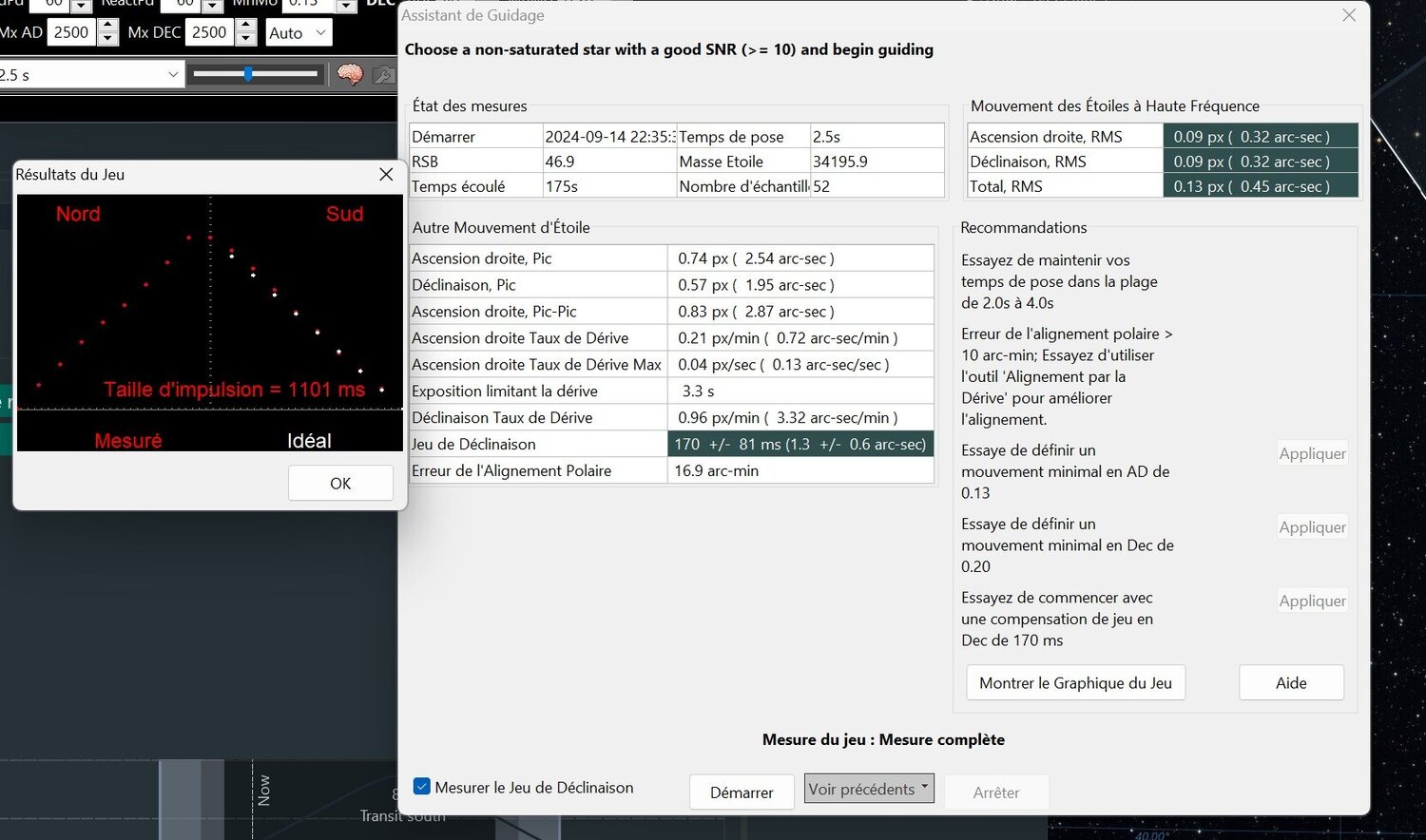 Bonjour, Et merci également pour ton retour. J'ai toujours eu un problème avec la MES, problème jamais résolu. Je fais donc avec. J'ai déjà cherché une solution à ce problème sur les forums mais sans succès. Je précise que ma monture est bien orientée au nord et que je me suis appliqué sur la mise à niveau et l'équilibrage. En réalité depuis 2 ans j'ai procédé à toutes les vérifications possible y compris mécanique et je ne vois rien d'anormal de ce côté là. Je n'ai pas d'accès à la polaire, donc je fais ma MES avec le module TPA de N.I.N.A. Je vais essayer de décrire ce quise passe lorsque j'effectue cette MES. Tout d'abord je m'efforce toujours d'atteindre une erreur totale inférieure à 15". Je parviens difficilement à atteidre ces valeurs mais cela est très long. En fait que ce soit en dec ou en ra je ne conserve jamais les valeurs obtenues. Par exemple si je parviens à être à 10 " en azimut l'instant ma monture repart en erreur dans l'autre sens et idem en altitude. En fait lorsque j'obtiens un total erreur acceptable cela ne tiens que quelques dizaines de secondes. J'arrête donc le processus TPA et je pointe sur la cible que j'ai choisie. L'astrométrie fait le reste et je peux lancer ma séquence de prise de vue. Toutefois si je refais une MES avec TPA une heure après je suis sur un niveau d'erreur bien supérieur à celui obtenu initialement. Désolé si mes explications sont un peu confuses.