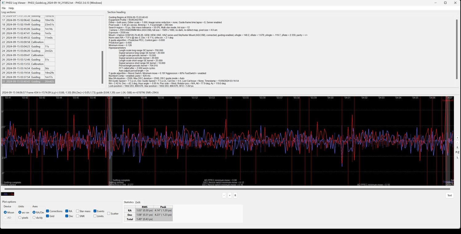 Bonjour à tous, Bonjour, PHD2, je n'y arrive plus et à vrai dire je n'y suis jamais réellement arrivé. J'ai brièvement tenté le suivi avec un OAG PEGASUS : le résultat était catastrophique. Je suis donc revenu à ma configuration antérieure (une lunette guide vario bresser 61/240) avec laquelle j'obtenai parfois un suivi correct. Mon setup est donc désormais composé des éléments suivants : - lunette askar phq 151 + caméra omégon vetec 571 mono (=asi 2600 m) + roue à filtre PEGASUs - lunette guide vario bresser 61/260 + caméra asi 220 mini J'ai effectué une calibration en pointant à 45° vers le sud. Puis sur chaque cible je lance un assistant de guidage. Toutefois, sans jamais être très satisfaisant mon suivi avec la lunette guide vire parfois à la catastrophe. Exemple : Hier soir je commence par 2 heures de brutes de 180 s sur Andromède et j'obtiens des images relativement correctes. Puis je lance une session sur ngc891 et là impossible d'avoir une image sans filés d'étoiles. Je refais donc une calibration en restant sur ma cible. Je relance une séquence de prises de vue avec cette fois une qualité de suivi à peine acceptable : pas de filé mais des étoiles tout de même étirées. La difficulté est surtout pour moi que je ne comprends pas le fonctionnement de PHD2. J'en viens donc à vous demander de l'aide sur ce forum. A toutes fins utiles j'ajoute en PJ une copie d'écran du résultat de ma calibration ainsi qu'un log de suivi. Je ne sais pas quel rms je peux raisonnablement espérer obtenir avec ma configuration. Il me semble néanmoins que les chiffres qui figurent sur ce log de suivi sont plutôt médiocres ainsi d'ailleurs que l'indique le graphe. Par ailleurs mes connaissances sur ce sujet étant encore très limitée je ne sais même pas quelle différence il y a entre le chiffre donné en px et entre parenbthèse dans la colonne rms (0.43 px) et le chiffre en seconde d'arc 1.49 ? Dernière question au regard des paramètres phd2 concernant les algorithmes (voir pj), pensez-vous qu'il faut que je modifie certains paramètres ou que je change d'algorithme ? J'espère ne pas avoir été trop confus. Par avance je remercie tous ceux qui pourront m'aider. Bon ciel à tous
