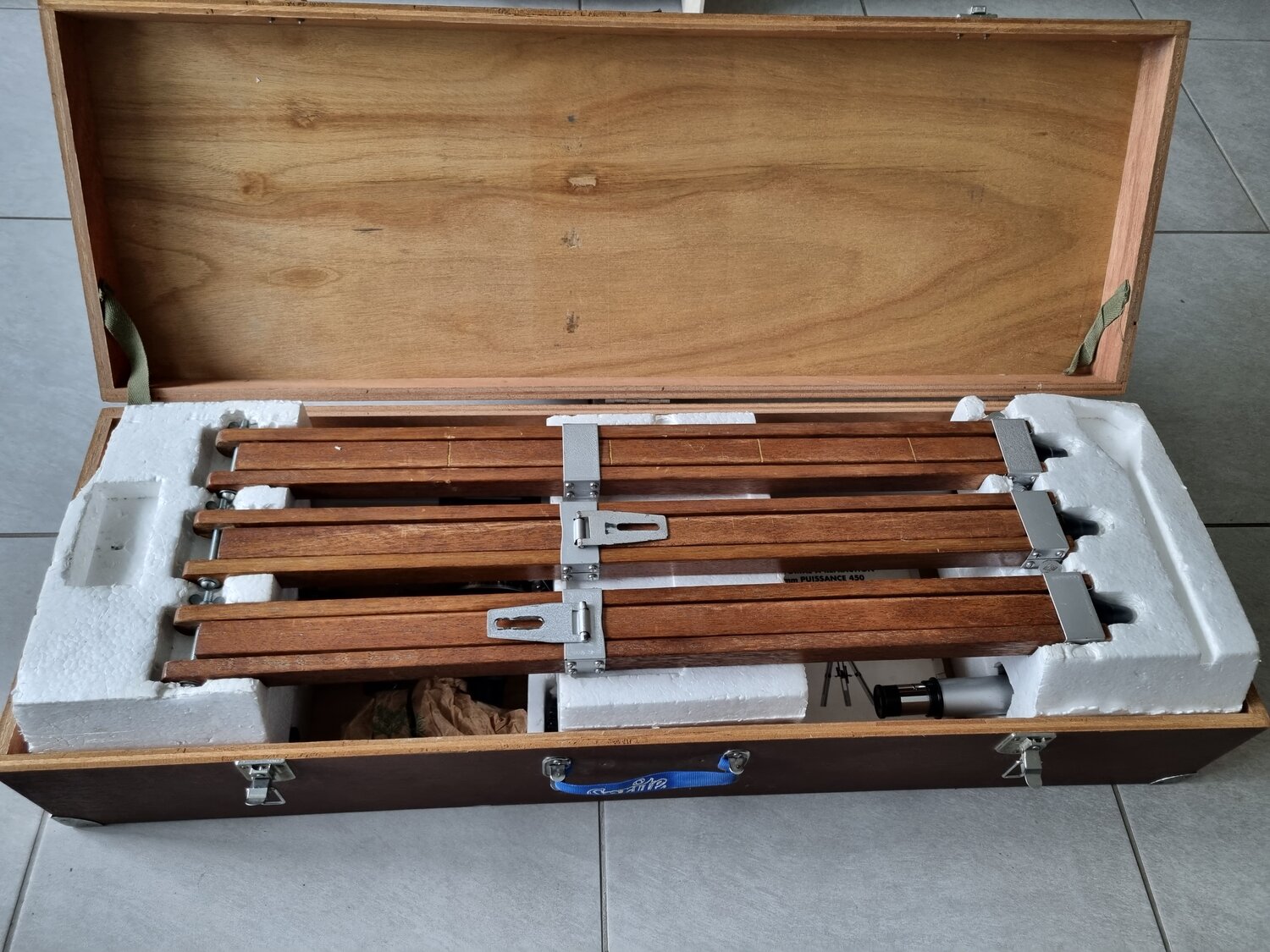 11. Merci... je vais faire des photos demain de la lunette dans son jus... Grand déballage et photos de tous les éléments. Ensuite viendra la restauration (qui sera essentiellement du nettoyage et du contrôle) car elle est relativement en bon état. Je souhaiterais re vernir la boîte en bois, ainsi que les pieds afin de donner une nouvelle jeunesse à cette émouvante lunette... Je met une photo en attendant celles que je vais prendre moi même... C'est la photo que la personne avait mise et qui m'a permis de l'acheter. Mais quelle ne fut pas ma surprise en découvrant une si jolie lunette dans son écrin qui en disait long sur les soins et l'attachement de son propriétaire à ce bel objet... J'ai eu beaucoup de chance, et je souhaite lui permettre de vivre une nouvelle vie à la lumière des astres. Cyriaque 🌛😉