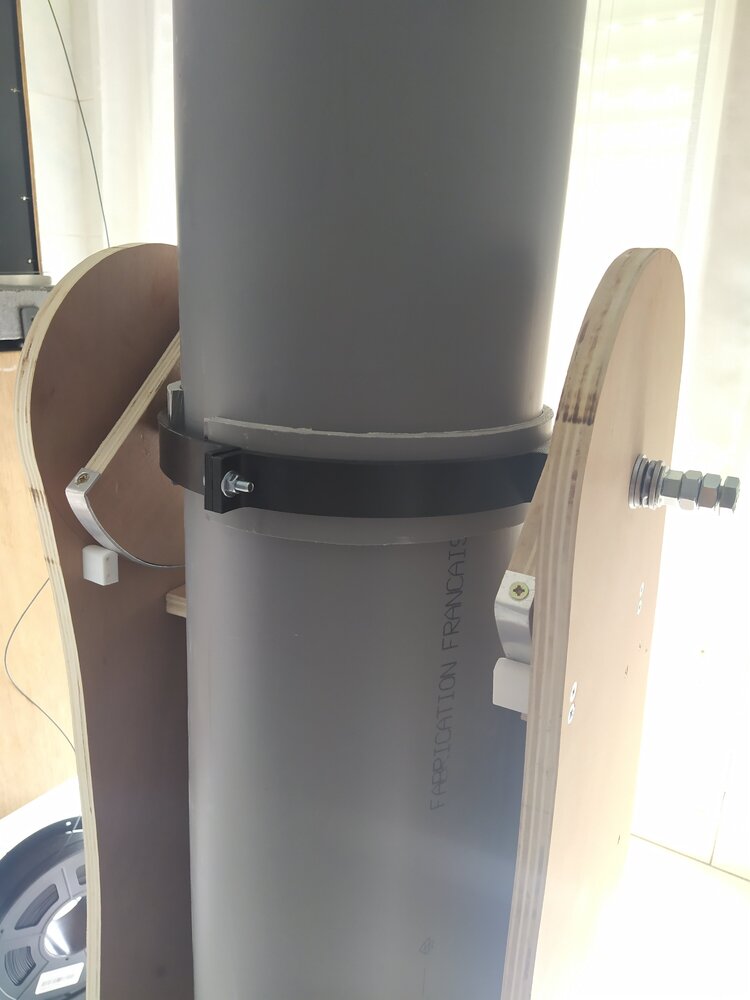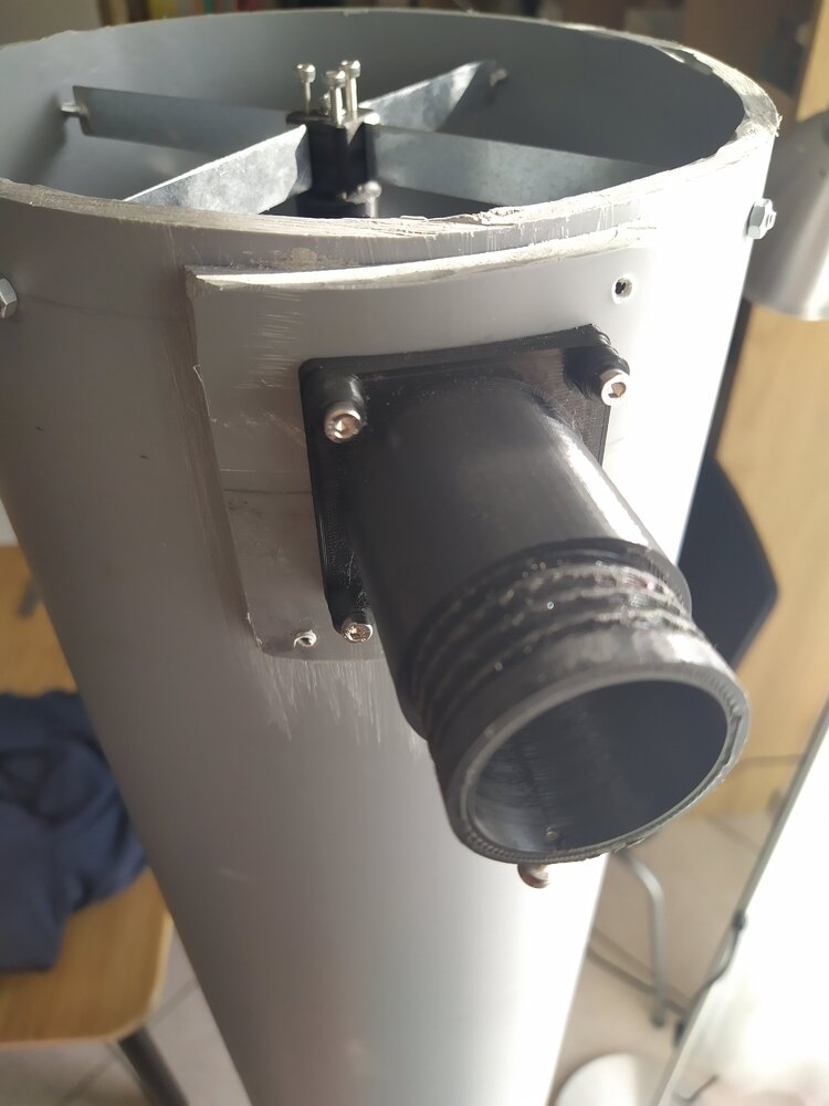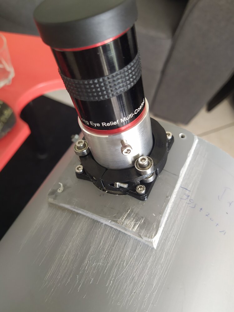 Finalement pas de Strok, mais une araignée classique 4 branches. Le miroir me paraissait petit (28mm) pour ce montage, et j'ai compris que le Strock ferait 6 aigrettes fines, pas 4 puisque l'araignée n'est pas centrée. Je suis parti sur de l'acier zingué à la place de l'inox pour pouvoir braser les vis sur l'araignée. (Je suis allé acheter mon acier, et après la découpe, j'ai trouvé une tôle identique de lave linge dans le local poubelle 🙃). Ca a l'air grand sur la photo mais au centre, tout est en M3. J'ai imprimé un PO trouvé en ligne en attendant de pouvoir faire mieux et monté le tout sur un tube PVC pour tester. Prochaine étape, fabrique le support pour le tube. Je vais partir sur du contreplaqué. Mon problème c'est l'équilibre avec mon tube super léger, j'ai peur que tout tourne quand je change d'oculaire (d'après mes calculs il faudrait R>5.5cm pour un oculaire 100g avec Cf=0.2 (teflon/teflon c'est 0.04), apha = beta = 90°). Actuellement, je me demande si je ne ferais pas un design esthétique proche du skywatcher, toujours avec le principe des 4 patins teflons MAIS en ajoutant sur une des faces latérales un sandwich de rondelles teflon. Un peu comme un Dobson "table top" avec une molette pour régler le serrage sur les rondelles teflon et donc la rigidité de la liaison. Dans mon imaginaire c'est comme la solution "ressort" mais réglable grâce à une vis. Qu'en pensez-vous ? Et quelle épaisseur pour le contre-plaqué ? Et quelles sont les moins pires alternatives pour remplacer le formica recommandé sur Stellafane ? ce genre de tôle ou bien simplement du parquet stratifié ou du mélaminé ?