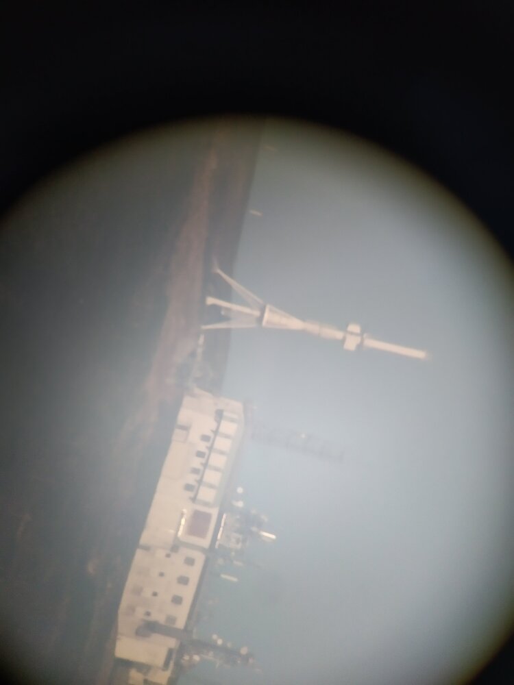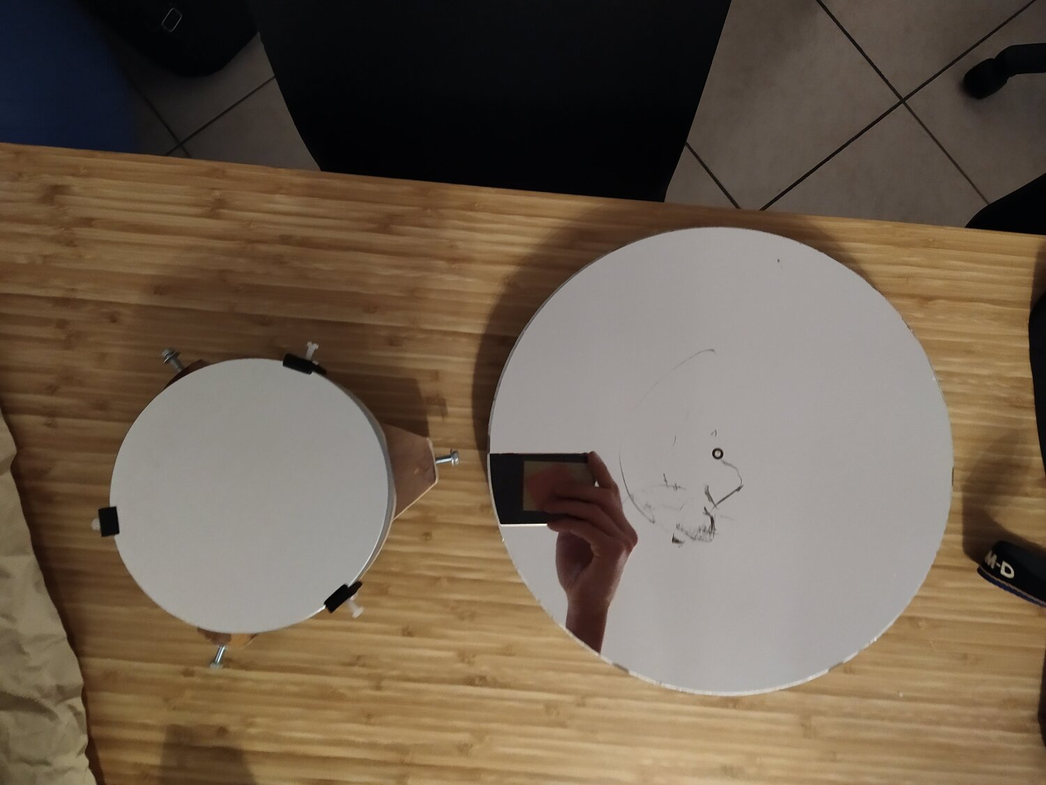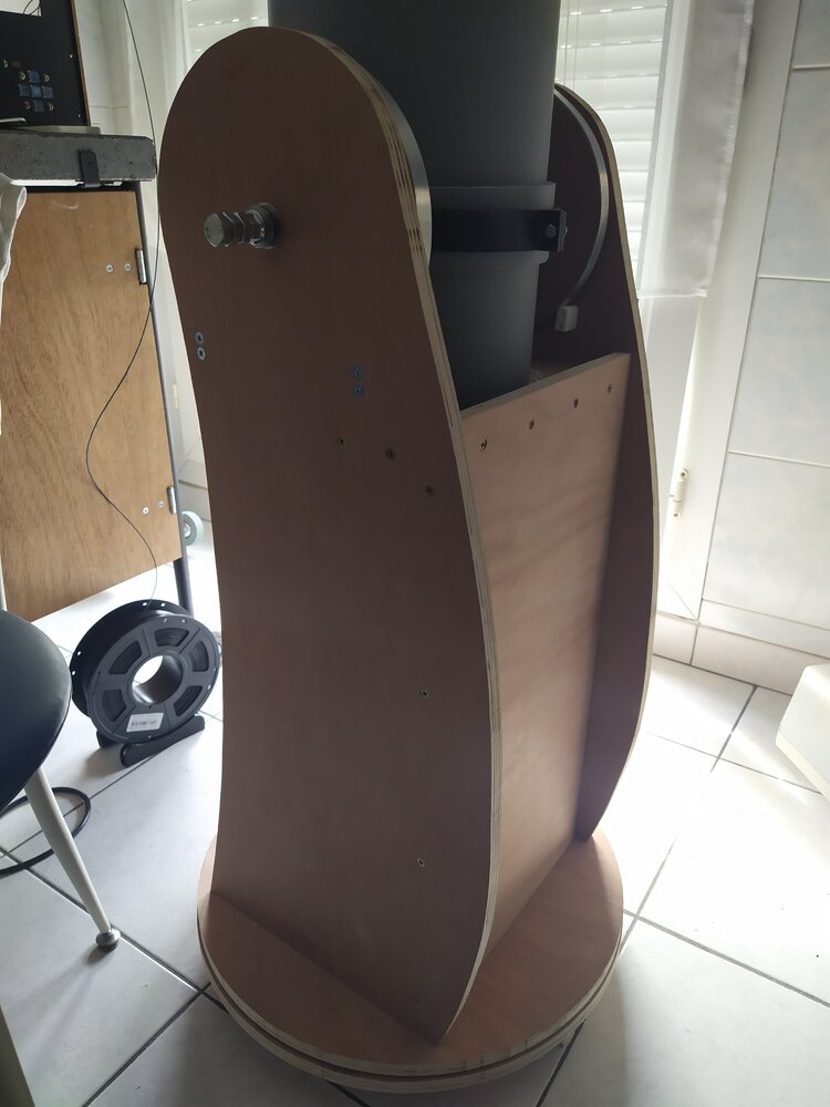 J'ai construit ma base en contreplaqué de 15mm. La rotation du tube fonctionne bien (aluminium / PTFE). Une vis permet de régler la dureté de la rotation (PTFE / PFTE). Pour la rotation autours de la verticale par contre c'est un peu plus dur (dale PVC / patin PTFE). Le problème n'est pas tant la dureté de la rotation que le manque de rigidité de la structure. Après réglage, l'image vibre pendant quelques secondes. Que dois-je rigidifier ? Ou bien seulement me concentrer sur la friction pour minimiser la déformation ? Station météo à 18km. Pris avec le téléphone par l'oculaire ( 6mm/1200mm = x200) Le miroir n'est toujours pas aluminé.