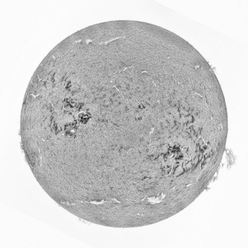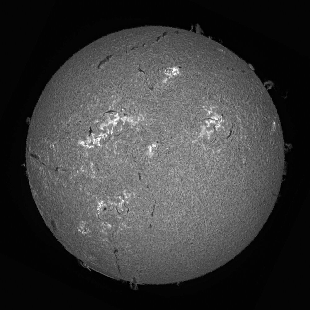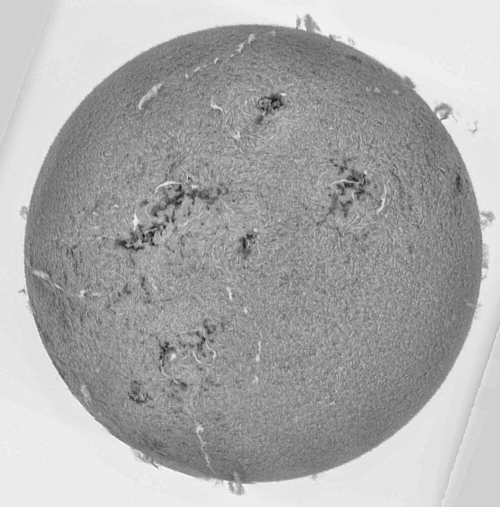 9. Nouvelle photo avec le SHG700 et lunette SVBony 102/660 diaphragmé à 8.6 avec un filtre ND8 et une ASI 678 Traitement Jsolex et Lightroom Remarque sur l'utilisation de la lunette, il est possible de faire des scan sans filtre mais la je sature: gain zéro et je ne peux pas abaisser ma vitesse sous peine de trop déformer le soleil , même si Jsolex le reconstruit !