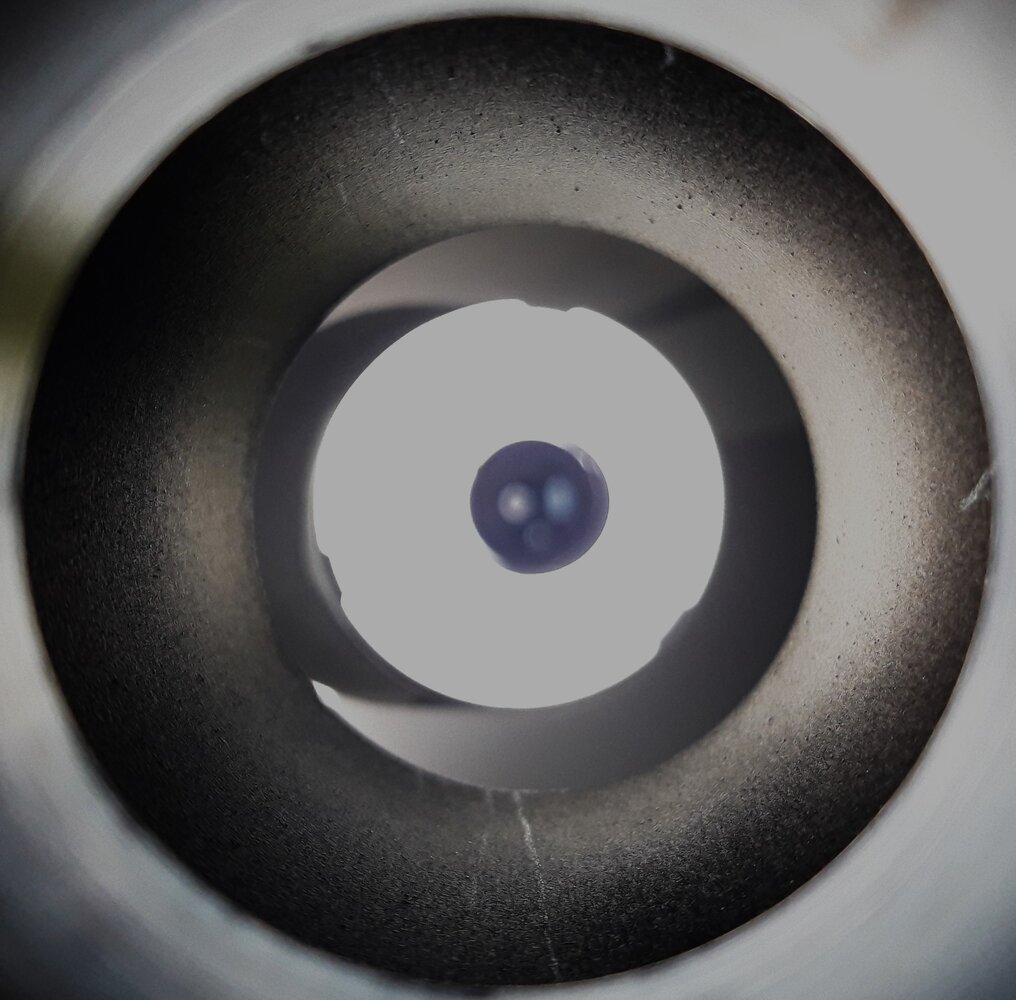 Merci @sixela pour toutes ces infos... Ca, c'est sûr ! Je vais essayer de rentrer en contact avec un club pas trop loin... Mais j'aime essayer de comprendre les choses, et là, j'avoue que je galère... Après ton aide, je pense avoir mieux réglé mon secondaire. En faisant la photo ci-après avec mon smartphone, je me suis rendu compte : - que mon secondaire est en fait trop près de l'entrée du tube. Donc pas de problème de butée, j'ai de la marge. La difficulté que j'ai est de centrer ma vue dans le PO pour juger du placement du secondaire. La vision par le smartphone serait peut-être mieux : En effet, le centrage du fond et du bord du PO n'est pas parfait mais, contrairement à ce que je "voyais" à l'oeil, le secondaire n'est pas trop vers le primaire, au contraire. Sinon, je pense qu'on voit bien les 3 agrafes du primaires etque la rotation du secondaire est correcte... J'ai repris une vue de meilleure qualité de l'oeillet vu au travers du Cheshire (long tube effectivement) : Je voudrais essayer de régler rapidement mon Newton, même si la météo du sud ouest de la France est loin d'être clémente (l'orage est encore en train de sévir au momnet où j'écris...) et je persiste... tant que j'ai de l'écoute et des réponses ici (et je comprendrais que vous en ayez assez)... Merci encore à tous ceux qui répondent et transmettent leur savoir... -