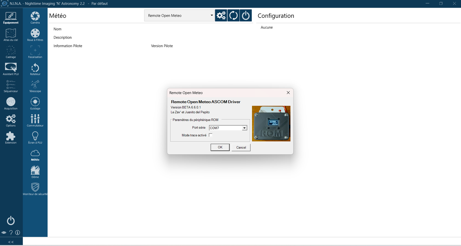 1. Le ROM est servi Tournée générale !! avec Xavier Sdkt (AstrAuDobson) , nous vous présentons, le ROM ROM : Remote Open Meteo Une station météo en DIY (Open Source) et son driver ASCOM. Deux modèles : BME280 BMP280 + DHT11 Vous trouverez sur le git : Les plans de la boiboite Le firmware du ROM Le driver ASCOM du ROM Les modifs dans AstroSessionOrganizer sont déjà faites Enjoy https://www.youtube.com/watch?v=RsIzEBsYPV0 Le GitHub ici : https://github.com/AstrAuDobson/RemoteOpenMeteo