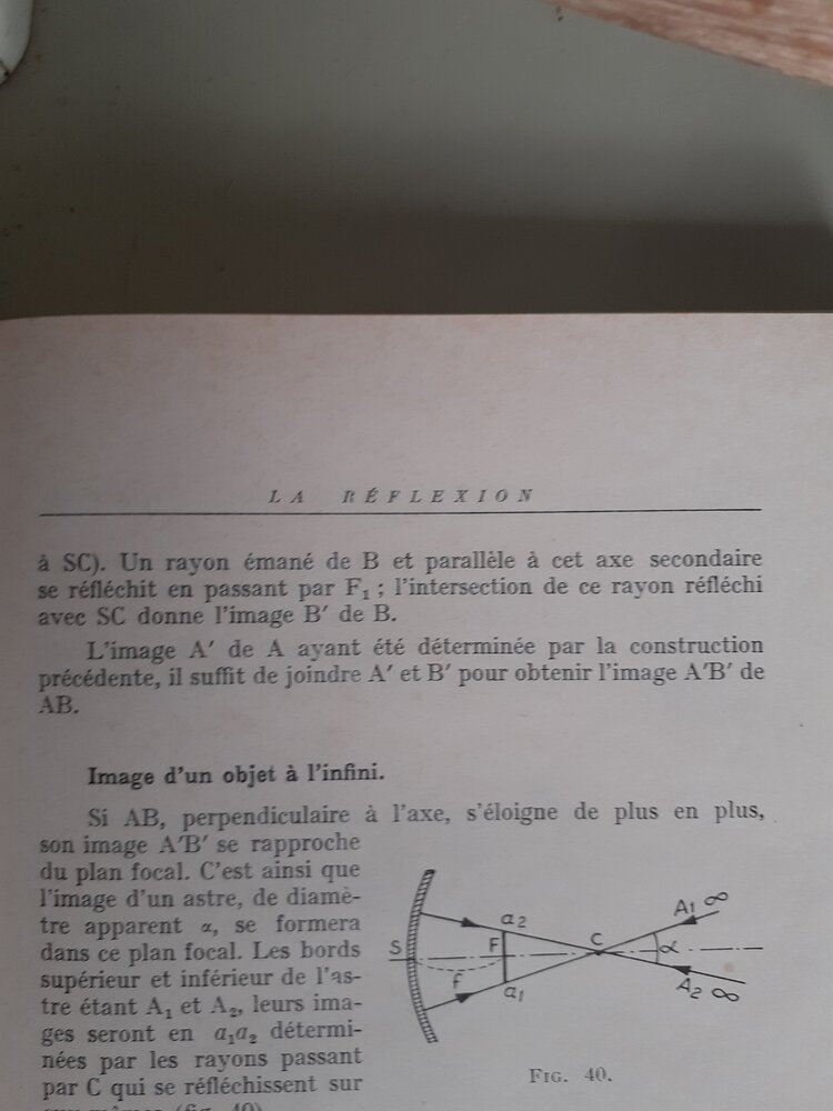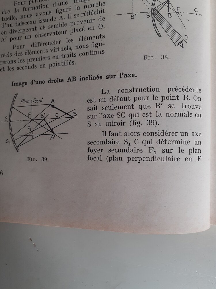 bonjour les amis, je ne sais pas si je poste au bon endroit mais voilà, j'ai récupéré un vieux livre sur les bases de l'optique et si j'ai bien compris le début sur les miroirs concaves, pour le cas où la droite AB est inclinée (voir photos, début sur page 26 fin avant image d'un objet à l'infini) par contre je n'arrive pas à comprendre comment est déterminé le point S1 qui détermine la droite C S1, qui permet de trouver F1 qui détermine B', si quelqu'un peut m'expliquer je suis preneur, vous avez 4h ☺️ PS : les photos ne se sont pas mise dans le bon ordre, c'est la fig 39
