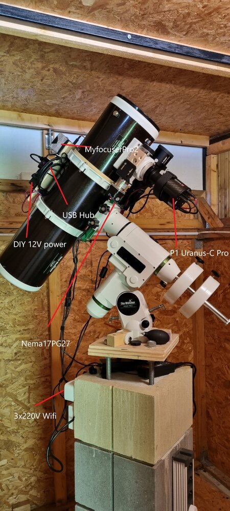 Une Altair GPCAM 290c plus tard, les nuits commencent à se raccourcir en planétaire Par un pur hasard (vraiment) on trouve enfin une maison (2 ans de recherche) et paf: il y a un observatoire dans le jardin. C'est parti pour automatiser tout ca: un mini PC en recup, Stellarmate, un focuser fait maison, suivi d'une Player 1 Uranus-C Pro en promo, une lunette d'occaz