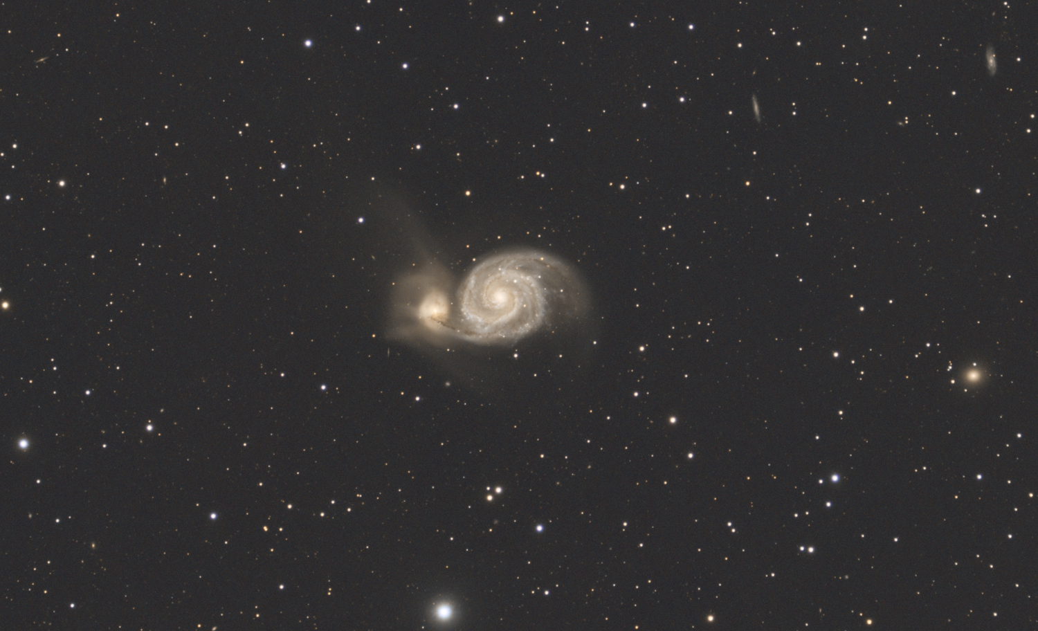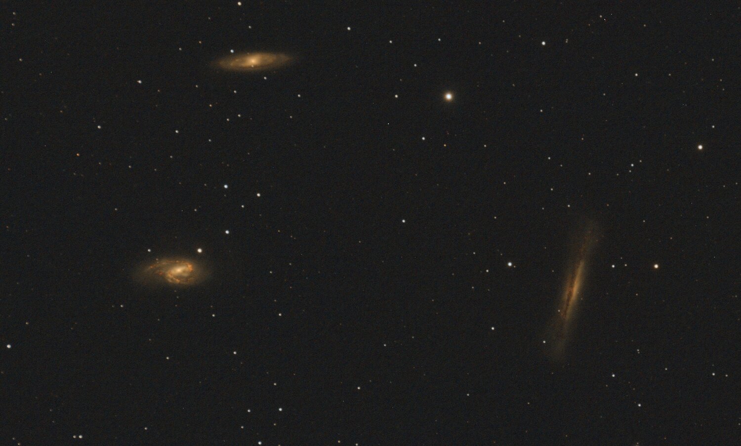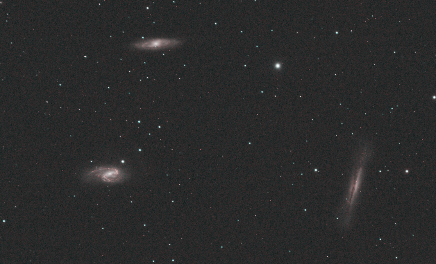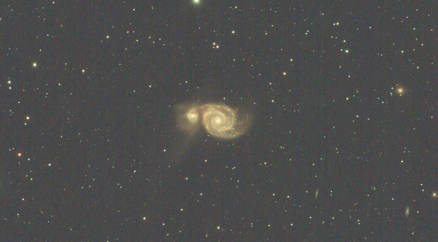 13. Petite précision qui peut avoir son importance: shooting en duoband Ha/OIII (SV220), je n'ai pas ca avec le filtre IR. Du coup je reprends les shooting que je n'avais pas traité depuis que j'ai recu le SV220. J'ai voulu aller plus vite pour verifier, impossible de simplement stacker avec calibration sur dark 3 channel: 18:30:33: Après la soustraction du dark, l'image contient de nombreux pixels négatifs (25%), les image de calibration sont probablement incorrects 18:30:33: Lecture FITS : fichier r_M51HOO_00077.fit, 3 canal(aux), 3856x2180 pixels, 32bits 18:30:33: Après la soustraction du dark, l'image contient de nombreux pixels négatifs (21%), les image de calibration sont probablement incorrects 18:30:33: Après la soustraction du dark, l'image contient de nombreux pixels négatifs (27%), les image de calibration sont probablement incorrects 18:30:33: Après la soustraction du dark, l'image contient de nombreux pixels négatifs (25%), les image de calibration sont probablement incorrects 18:30:34: Après la soustraction du dark, l'image contient de nombreux pixels négatifs (24%), les image de calibration sont probablement incorrects etc. etc.) J'ai refait mes darks au cas ou mais meme combat avec ce filtre. Est-ce normal? (le dark 1-channel est ok par contre sur les extracts Ha & OIII) Pas tout a fait la même trame sur le Trio que j'avais shooté la veille en duoband que je traite en attendant vos retours, mais similaire (très étiré pour l'exemple, separation canaux/traitement/pixelmath): Par contre en IR sur M51 la semaine dernière (idem très étiré pour comparer): mais en duoband le lendemain (stacké sans calibration, le dark ne fonctionnant pas):