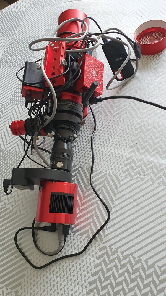 21. Bon ben je crois avoir reussi a repare l'ASI 1600. Il ne me reste qu'a tester en pleine nuit quand il y aura moins de nuages... je pense avoir également reussi a bien regler le backfocus. J'ai aussi tenté un montage un peu particulier avec une barlow pour voir si je peux aussi faire un peu de planetaire avec la redcat (cf photo). Il ne me reste qu'a egalement tester en pleine nuit quand il y aura moins de nuages... Est ce que ca se fait au fait ? L'idee m est venu comme ca plutot que d'avoir une deuxième lunette.