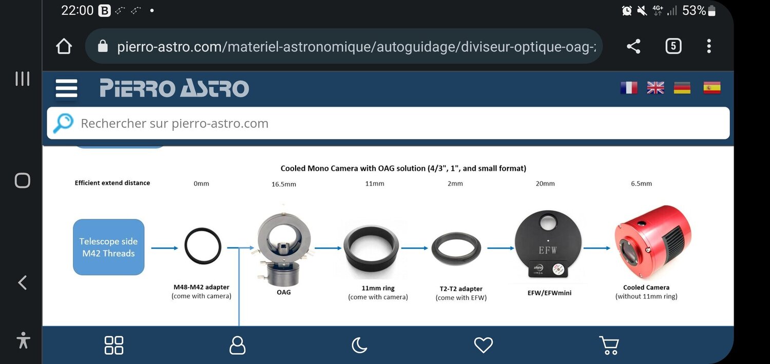 Je crois que j'ai compris je pense... le probleme c est l inclinaison de l'EFW par rapport au diviseur optique. Il faut que j attende patiemment la reception de la bague de 11mm que j ai commandé chez unterlinden. Sans celle la, l'EFW coller a l'OAG ne permet pas de bien positionner les deux ensemble je pense. -