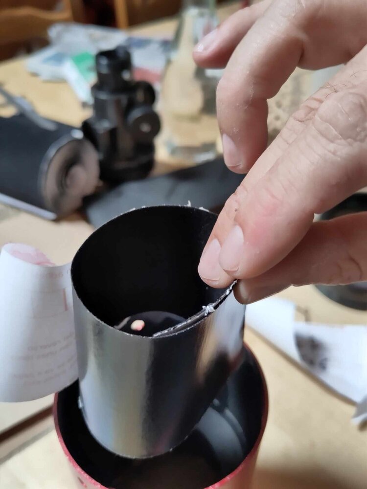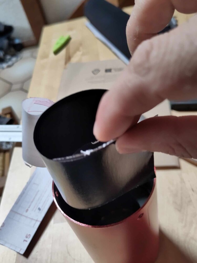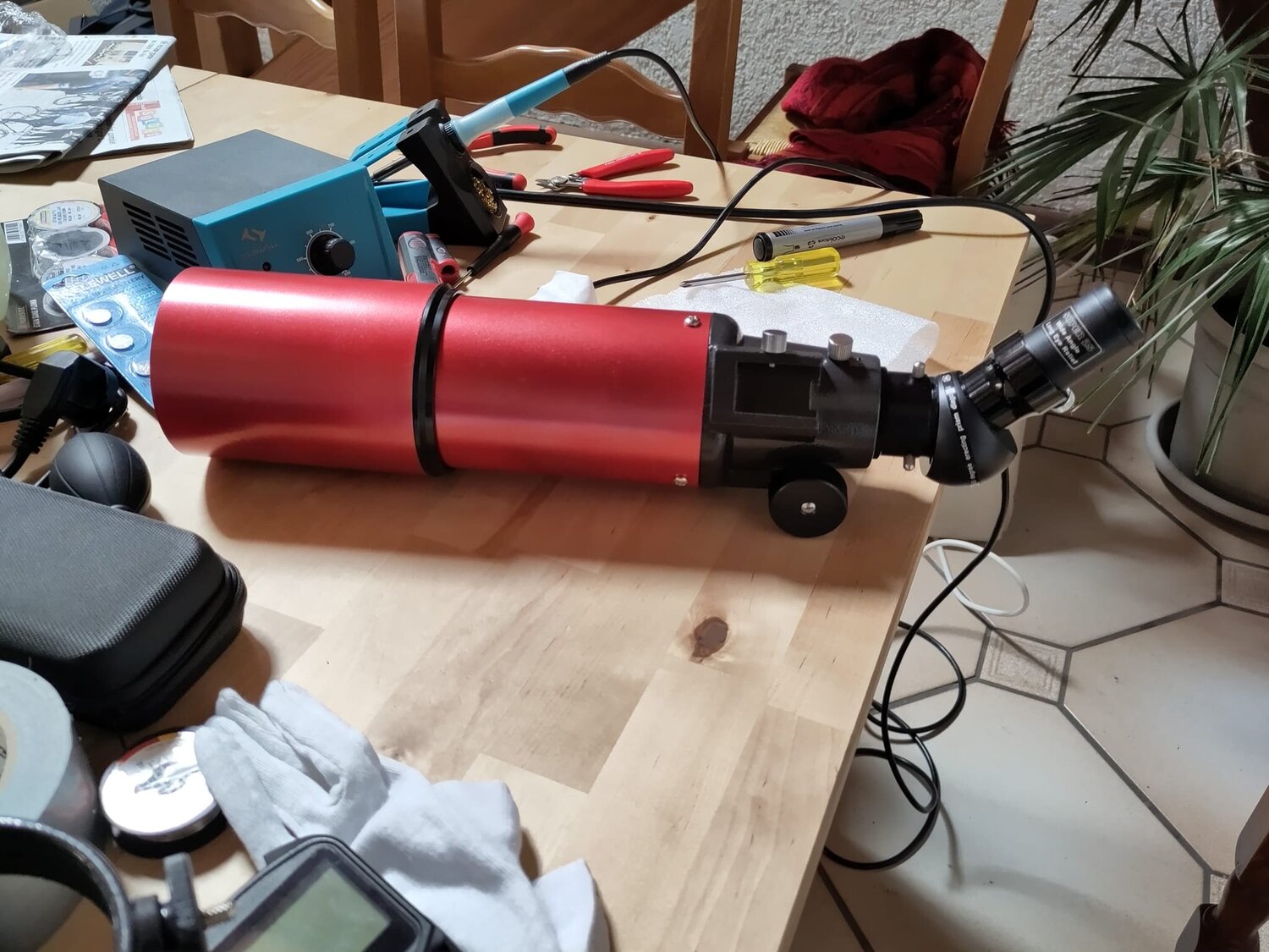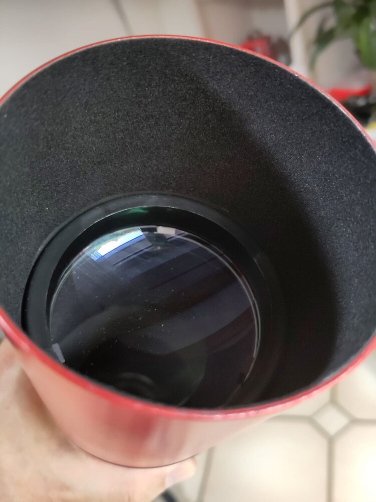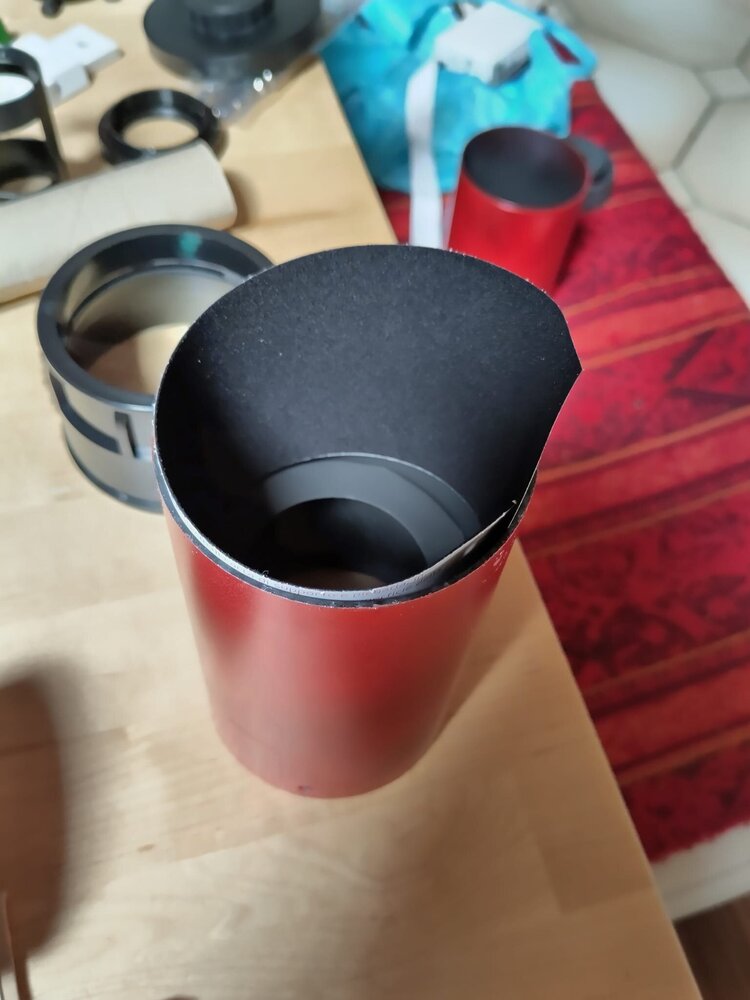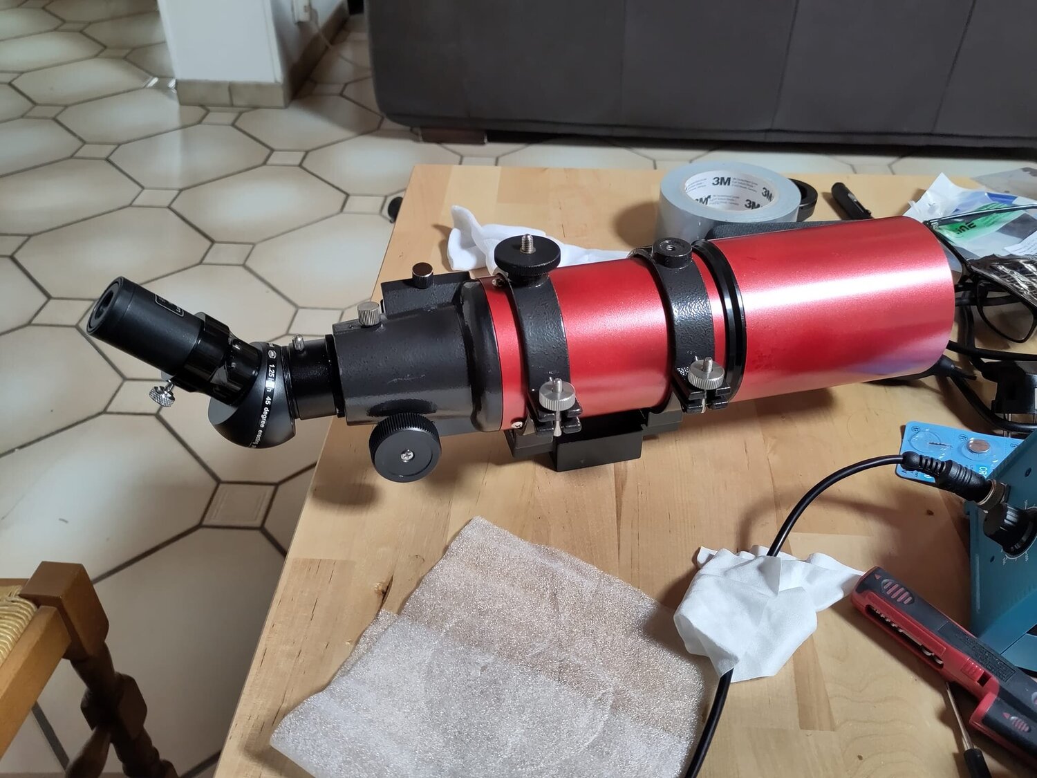 Tout d'abord quelques élements de cadre (sauter au début, en gras en dessous pour passer): Le tag [briconul] pour indiquer qu'il s'agit d'un bricolage à priori facile, idéal pour s'initer à celui-ci pour les personnes se considérant comme nulles en bricolage (comme le "taggle 2000" pour goto d'exos 2 chanteur disponible dans cette section). Ce bricolage s'inscrit dans le cadre plus large d'un projet de démocratisation de l'initiation à l'astrophoto. En l'espèce, le matériel modifié correspond à une lunette achromatique skywatcher 80/400, aussi appelée ST80, mais est j'imagine applicable à un grand nombre de lunettes très accessibles d'entrée de gamme. Euh pas un maksutov ou SCT hein, juste une bonne vieille lulu. Il s'agit dans ce cas précis de "Shun" (parce que capable de cadrer la galaxie d'Andromède), petite lulu préparée pour ma meuf (pas du tout un facteur d'acceptation de l'astro pour ma compagne qui voit la maison envahie de petites montures et scopes chinés à droite à gauche, et un vidage en règle de mon compte dans le cadre du projet juste au-dessus, bande de mauvaises langues 😉). Elle constitue également un prototype de lunette pour la version la plus abordable du kit, dénommée "pink manul" puisqu'il s'agit de la redcat du pauvre (je vous laisse chercher des photos de manul). Les perfomances initiales en astrophoto ont été testées ici (j'essaierai de faire un "après" pour comparer et voir si ça a amélioré les performances en astrophoto, quand ça sera possible): Bien allons-y gaiement. Le but des modifications sera essentiellement d'améliorer le contraste (et peut-être le piqué? j'ai l'impression que c'est mieux depuis) de la lunette en réduisant de manière assez importante les réflexions internes indésirables de la lumière. A partir d'une certaine gamme (lunettes apochromatiques même d'entrée de gamme, j'imagine) tout ou partie des modifications est probablement inutile car déjà effectué de série. Les étapes préalables optionnelles (que je n'ai malheureusement pas pensé à documenter) sont dans mon cas un petit dégraissage/ regraissage de la crémaillère du porte-oculaire qui craquait autant qu'une chips bien épaisse, un tout petit peu de graisse au-dessus sur le point de frottement de la vis de maintien de la mise au point, et un ajustement des parties amovibles/mobiles (un peu de velcro à l’intérieur du pare-buée, éventuellement un peu de teflon aus points de contact du tube du porte-oculaire). Bref, on démonte la bête (je n'ai pas de photo là mais c'est simple, 3 vis à enlever à l'arrière du tube de la lunette, et 3 devant après avoir retiré le pare-buée, penser à maintenir l'orientation du tube pour ne pas le remettre à l'envers). On se retrouve avec 4 parties, d'arrière en avant: - Bloc porte-oculaire - Tube central - Bloc lentille - Pare-buée On va pouvoir commencer à s'amuser. - Le bloc porte-oculaire: L'intérieur est bien trop réflechissant; rien qu'un bon coup de spray de peinture noire mate ne puisse arranger (on pourra auparavant chercher à bloquer un peu les jours à l'arrière en les remplissant de mousse par exemple, mais j'ai considéré ça comme accessoire). - Le bloc lentilles: Là il faut faire un peu attention: orienter l'avant du bloc lentille vers le bas, posé sur un chiffon microfibre bien propre (idéalement), et dévisser la bague de maintien des lentilles (attention à ne pas les laisser "tomber de haut"). Idéalement ne pas les décoller , les laisser simplement reposer sur la bague et le chiffon. Un petit nettoyage est possible à ce stade si nécessaire, à l'aide d'un kit de nettoyage photo disponible pas cher sur les sites de vente à distance, très utile pour tout possesseur de lunette (et de lunettes, d'ailleurs). Ensuite c'est assez simple; noircir les bordures externes des lentilles à l'aide d'un marqueur noir permanent (mat si possible). Il n'y a ensuite plus qu'à remettre les lentilles à leur place. - Tube et pare-buée: Là c'est un peu plus compliqué: dégoter un rouleau de film de feutre auto-adhésif et le découper en fonction des profondeurs et diamètres (fois pi, hein, ça y est vous pouvez enfin utiliser les maths de collège!) des surfaces à couvrir. (tout ça peut être simplifié par un bon coup de spray de peinture noire mate mais à mon avis un peu moins bien). L'idée est de couvrir la plupart des surfaces internes, attention il y a des baffles dans le tube central; il se fera donc en plusieurs parties (ici deux; une avant et une arrière). On peut tout à fait recouvrir les baffles, mais c'est un peu plus compliqué et dans le cas présent j'ai décidé de ne pas le faire pour rester simple. Pour le pare-buée (ou autre), penser à ne pas couvrir les zones qui entrent en contact au remontage. Dans mon cas, les dimensions de feutre à découper étaient a peu près de 27x7, 26x6 et 30x6 (je sais plus ce qui va où, mais on peut aisément découper un peu plus large, tester et corriger). Attention à bien enlever les petits bouts de papier blanc ou autre du feutre; on veut du bon noir bien mat. Certains laissent des jours aux points d'insertion des vis entrantes, pas moi; c'est plus simple et ça les couvre justement, ce qui est souvent souhaitable. Le positionnement du feutre est la partie délicate. J'ai trouvé que le plus simple était de rouler un peu la bande, adhésif exposé (pas grave si le truc colle un peu sur lui-même, ça enleve même les poussières et débris restants), puis de la dérouler lentement et en faisant bien attention, ah brotte de kique je suis de travers, attends je recommence, mais NOOOON, bon allez dernière fois... Mouais ça saoûle ça ira bien. Et on maroufle. On essaie de faire bien pour le pare-buée quand même, parce que bon plus dur de cacher la misère. Et voilà, plus qu'à remonter! Penser à mettre un coup de marqueur au bout des vis entrantes, si pas couvertes par le feutre, et on est bon! Dans mo