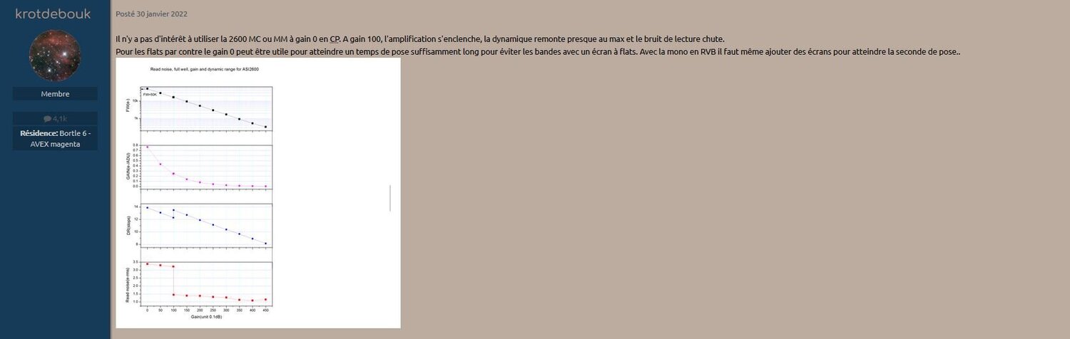 j'utilise l'asi air, du coup je n'ai pas vu ce paramètre la, j'ai juste mi mon gain à 100, cela peut-il venir de mes flats ? il faudrai peut etre que j'essai un traitement sans flat pour voir si j'ai ces bandes, j'étais à 0.05s en temps de pose sur mes flats