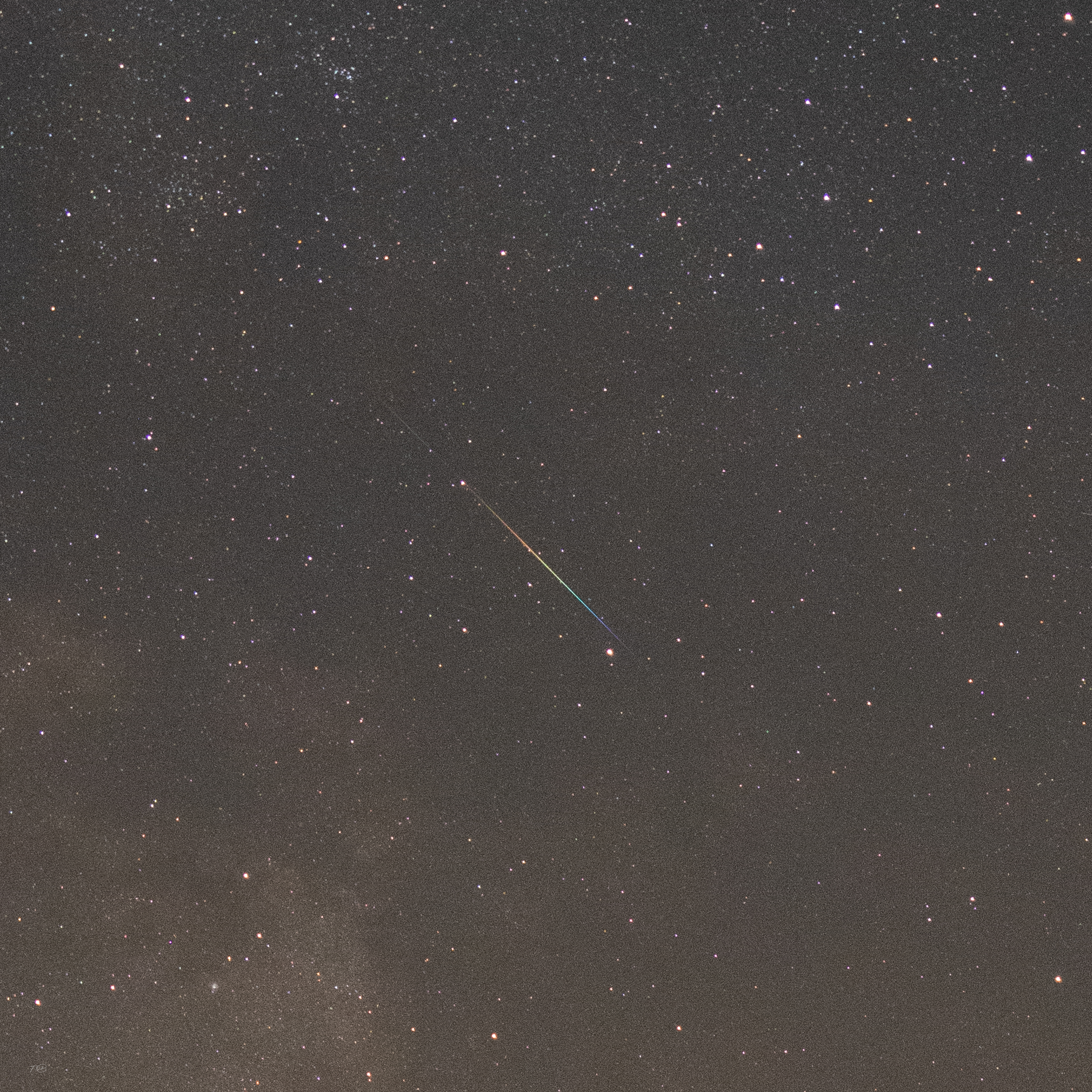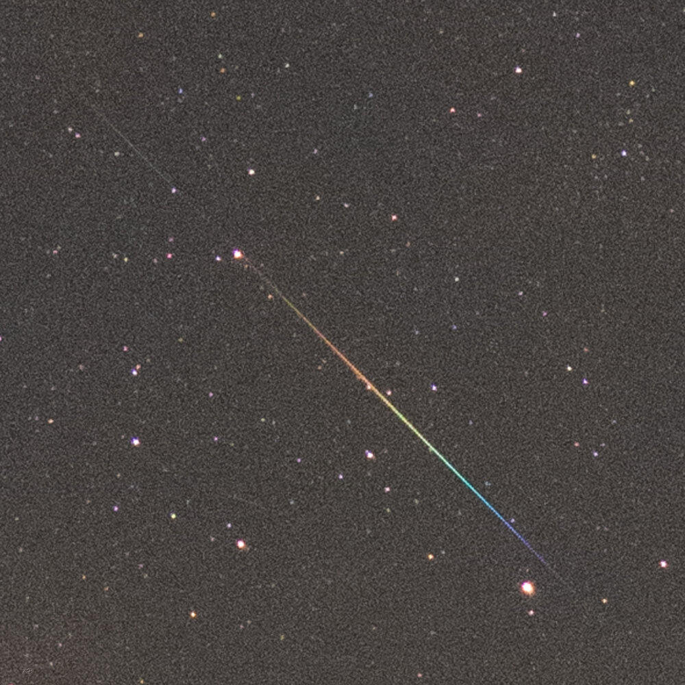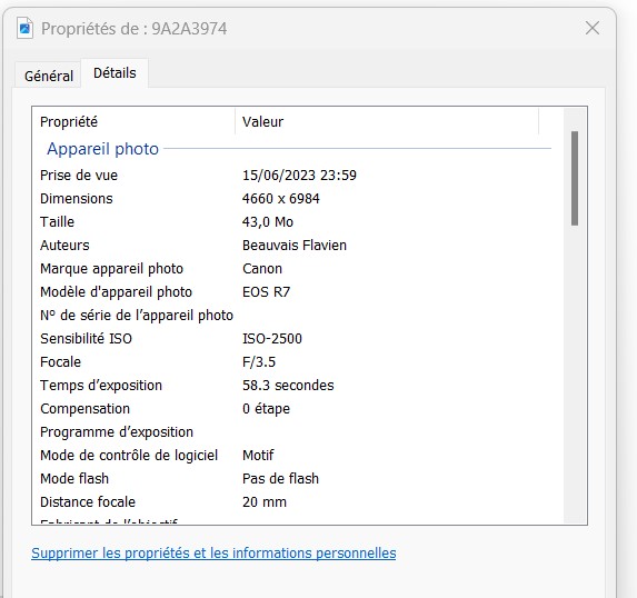2. ⚠️Bonjour à tous, j’espère que vous allez bien. Cela fait bientôt 5 ans que je shoot le ciel nocturne et je n’avais jamais eu une étoile filante de la sorte. La photo date de cette nuit (16/06/2023) à 00h59 et a été prise dans l’Orne( France). J’ai eu pas mal d’étoiles filantes habituelles ( filée bleu/vert/blanc) mais de ce type j’ai jamais vu ça. De plus aucuns satellites recensés n’est passés dans les 3 minutes avant l’image et les 3 minutes après limage. Ceci n’est pas un canular, j’ai même mis les exifs de la brute ainsi que l’image brute avec deux crops. Les images n’ont pas été retouchées elles sortent de l’appareil photo (Canon R7, tokina 11-20mm pro Dx). J’étais monté sur une monture équatoriale star adventurer 2i wifi, d’où le temps d’exposition de 60sec. Sur mes réseaux beaucoup m’ont fait part de lumière trop blanche donc le spectre apparaît, ou même la désintégration de différents matériaux dans l’atmosphère. Mais j’aimerais avoir une réponse plus scientifique. Je viens vers vous pour avoir vos retours. Je suis preneur de toutes réponses. Merci à vous et bonne journée. Si vous voulez me contacter vous pouvez venir en mp ou alors sur mon mail pro: flavienbeauvaisphoto@gmail.com