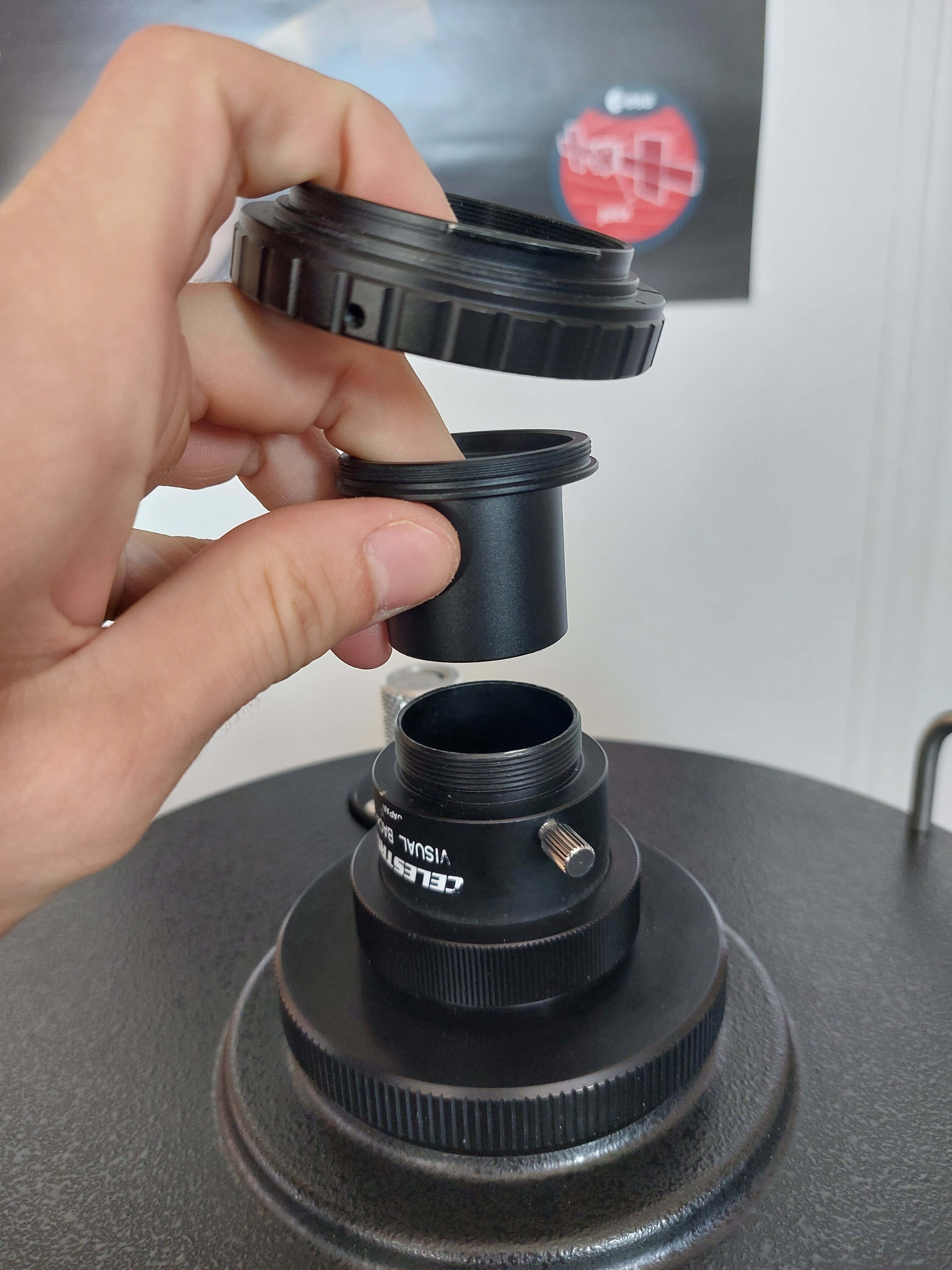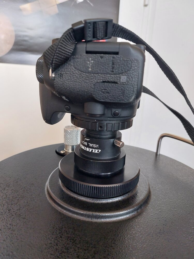Bonjour tout le monde, Je suis dans une asso étudiante d'astronomie. On a du super matos mais personne n'a vraiment fait d'astronomie ou d'astrophoto avant et donc on ne sait pas se servir de tout à pleine capacité. Alors on apprend, c'est passionnant mais je me retrouve confronté à un problème. Dans tout ce beau matos, on a un Celestron C11. Ca fait une grosse année qu'il n'a pas vu la lumière du ciel et il est donc bien décollimaté (j'ai testé de jour de regarder un bâtiment lointain et le piqué n'est clairement pas au rendez-vous 😕 ). Autre souci encore plus gênant, dès que j'installe une caméra (APN ou caméra astro), impossible de faire la mise au point... Certes le montage n'est pas idéal (Celestron visual back + Adaptateur 1,25" coulant / T2 + Adaptateur T2 / Canon (court) + APN), mais même en faisant plus court en remplaçant les deux premiers éléments par un adaptateur SCT / T2, je crains que je ne pourrai jamais installer de roue à filtres en tant que tel. Et même avec un simple oculaire, je suis presque en butée du miroir primaire quand je vise des objets à une cinquantaine de mètres... Pour la collimation, j'ai trouvé plein de tutos expliquant comment bien faire ça, donc je pense que j'arriverai à me débrouiller. Par contre, je n'ai rien trouvé sur ce problème de focus trop court. Est-ce que vous sauriez m'aider ??